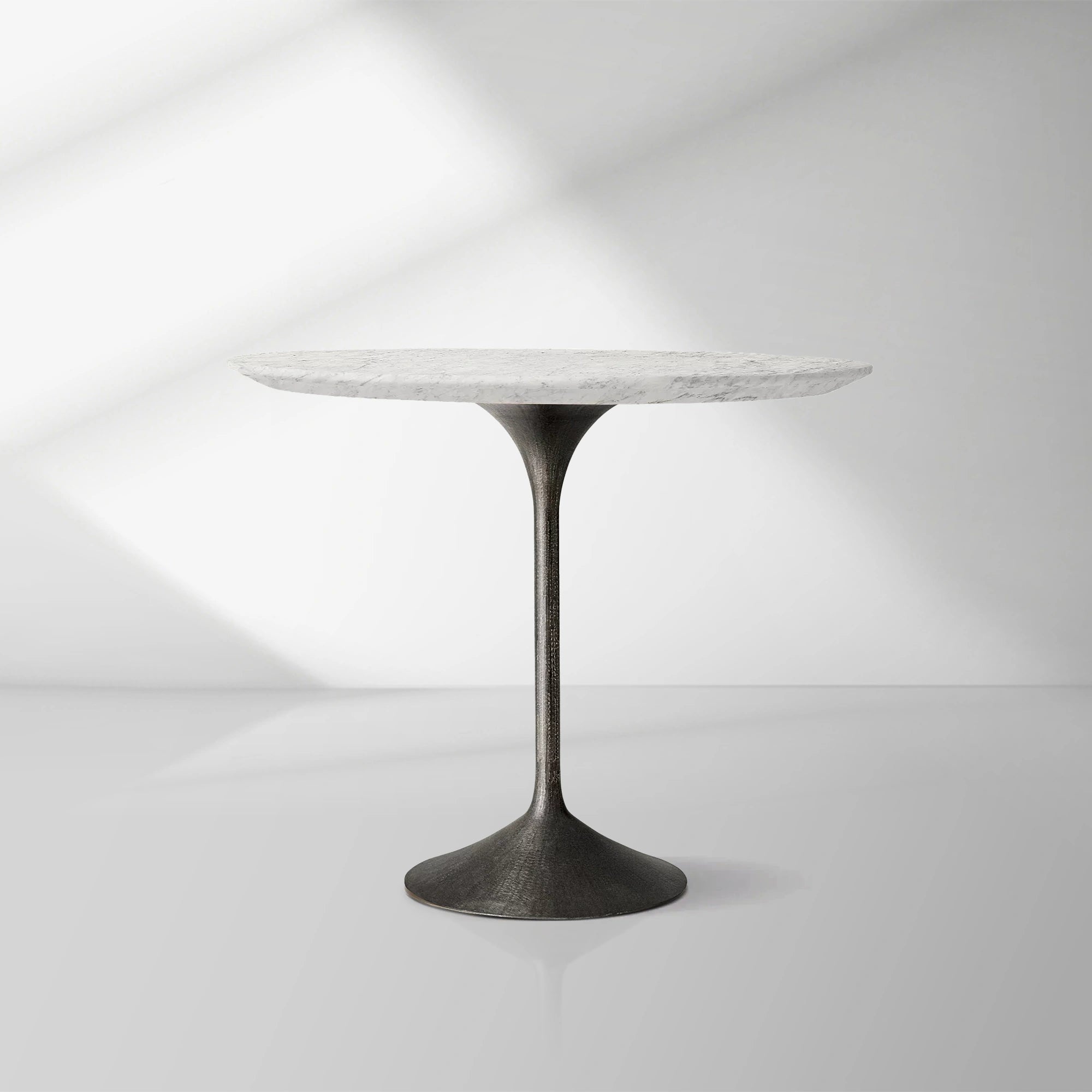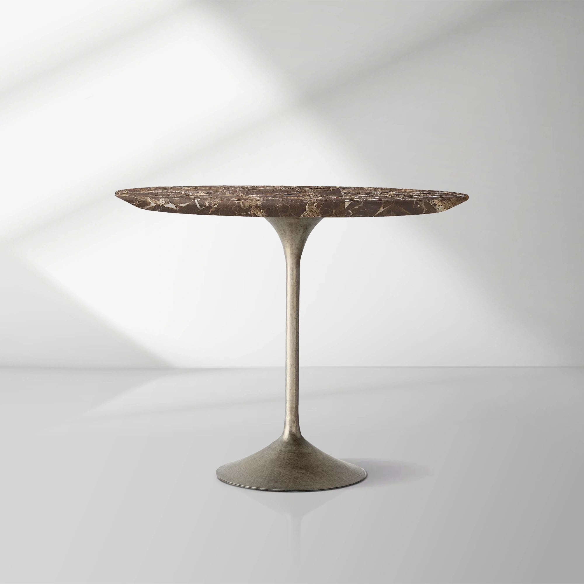 Blending mid-century inspiration with artisanal craftsmanship, the Aero Stone Bistro Table offers a perfect balance of sculptural elegance and natural beauty. Its distinctive arched cast steel base and handcrafted stone top create a striking yet functional piece, ideal for intimate dining spaces, kitchens, or cozy corners.