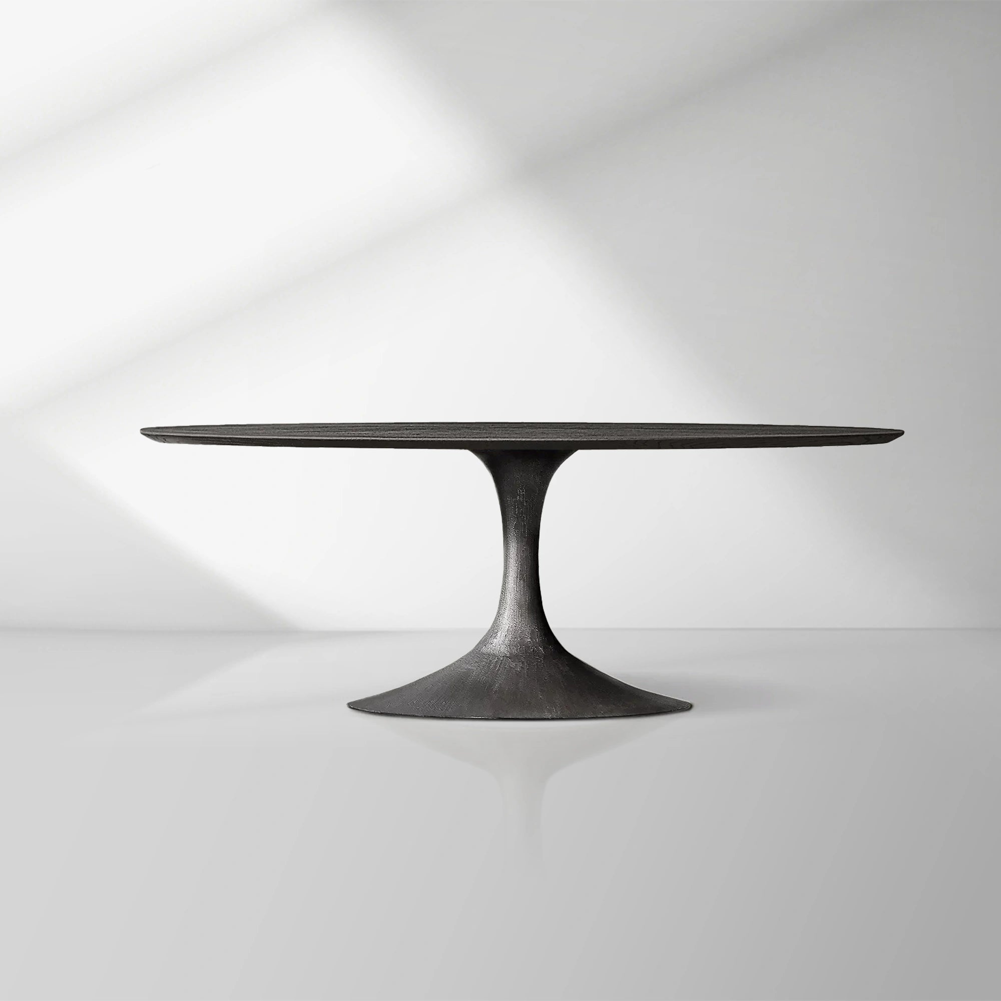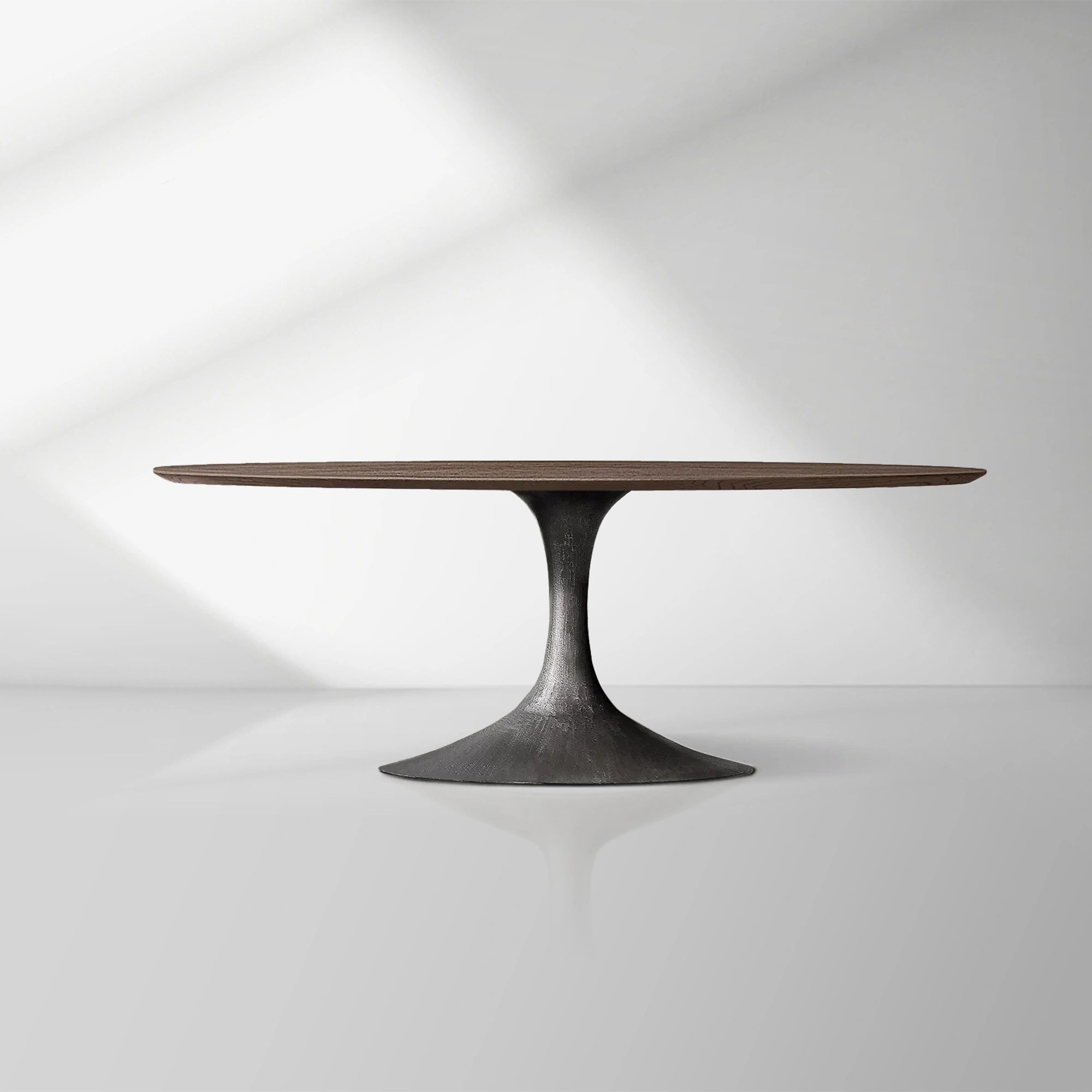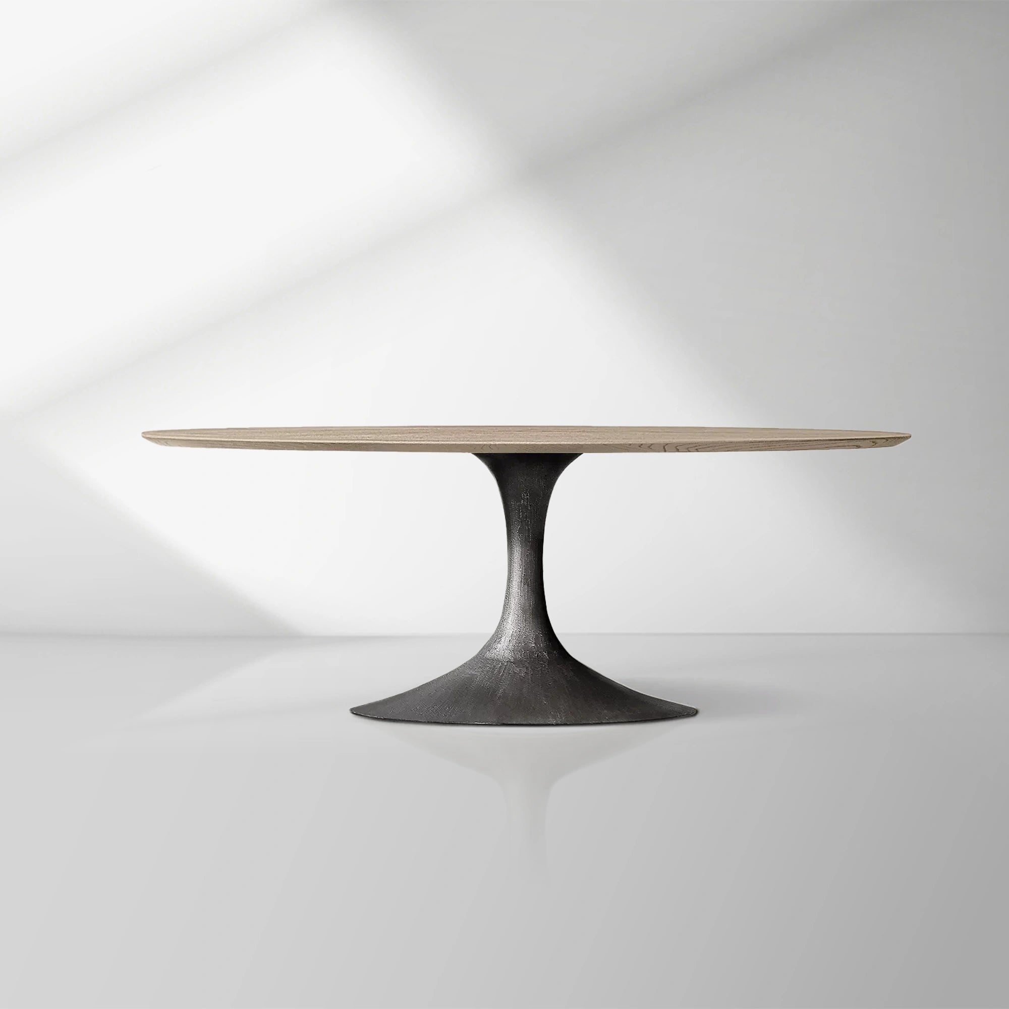 Inspired by the elegant simplicity of mid-century design, the Aero Oval Dining Table combines sculptural beauty with timeless functionality. Its gracefully arched cast steel base and balanced oval form create a striking silhouette, while the beveled-edge solid wood top—available in oak or walnut—enhances its refined appeal.
