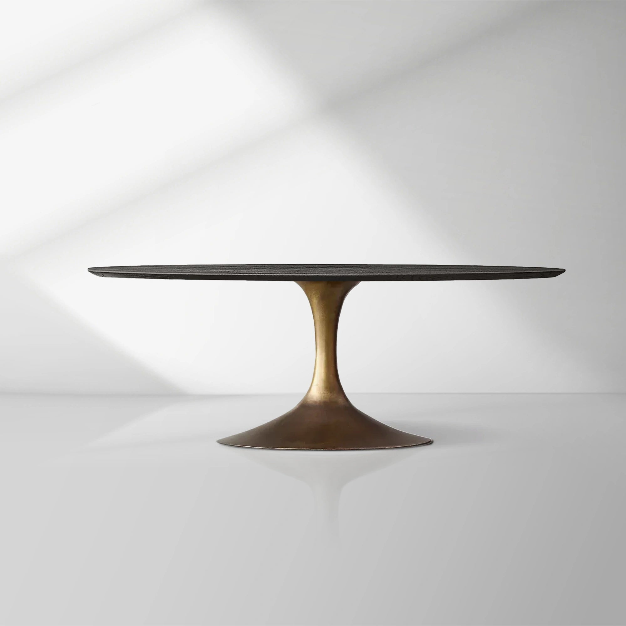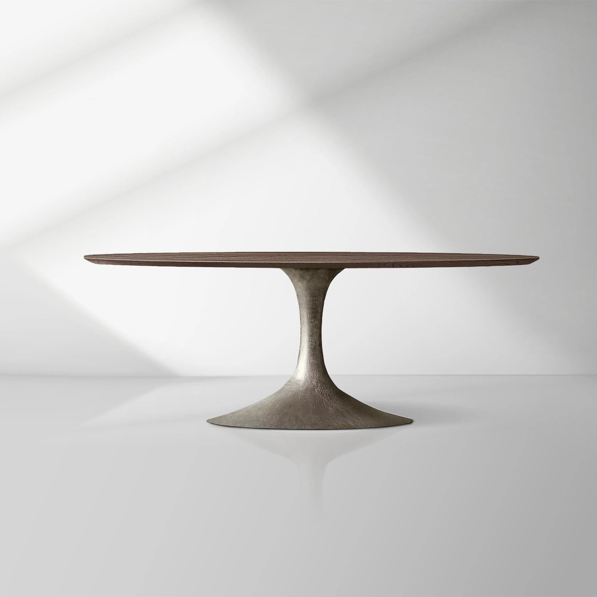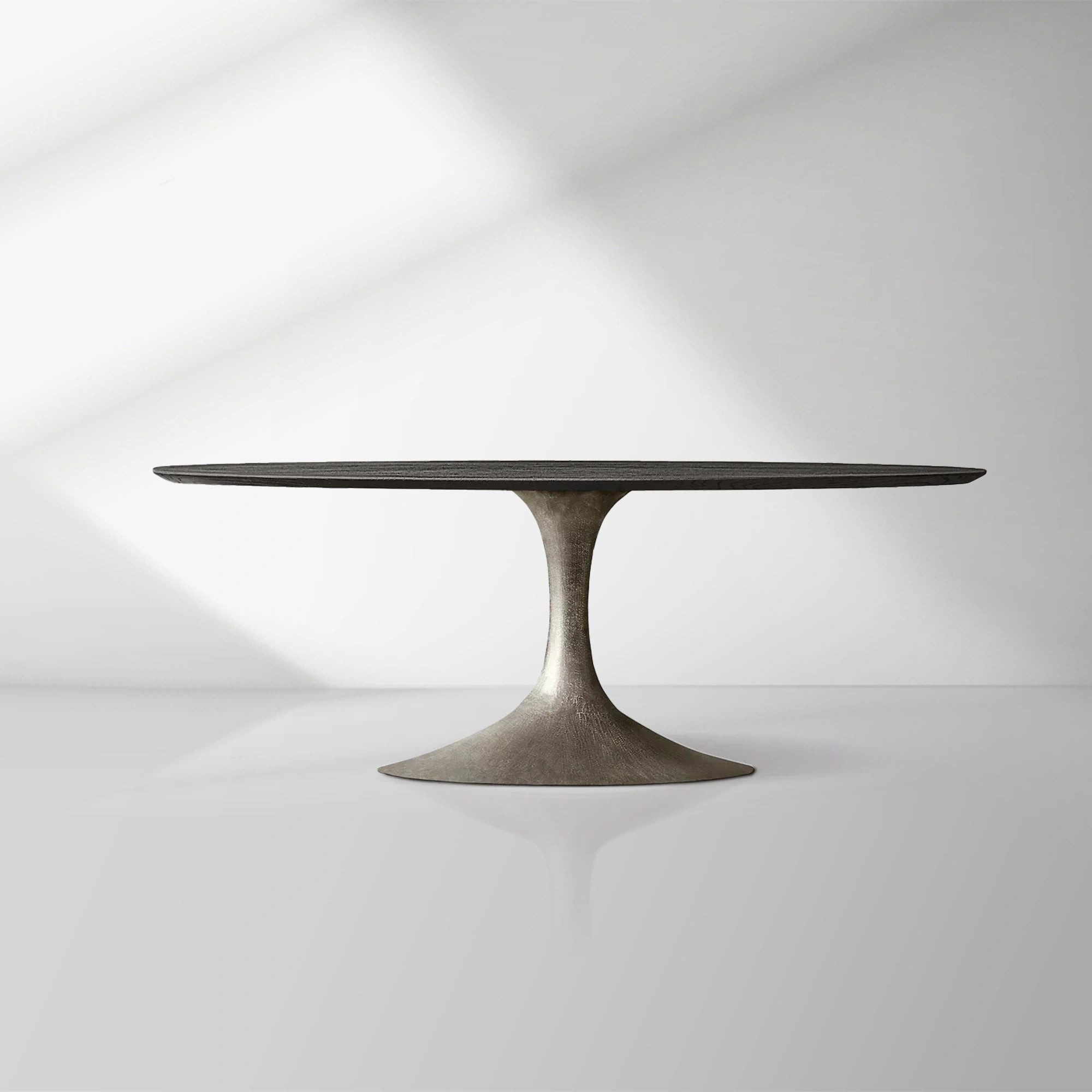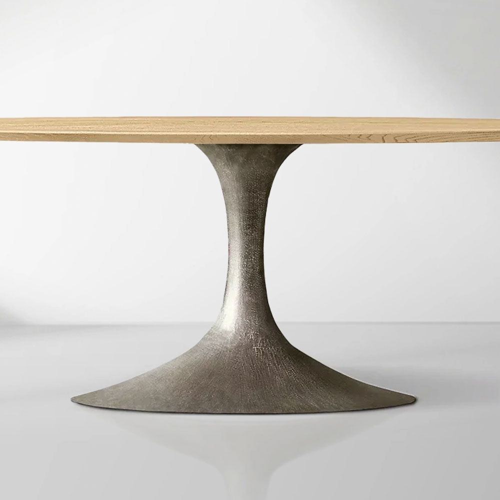 Inspired by the elegant simplicity of mid-century design, the Aero Oval Dining Table combines sculptural beauty with timeless functionality. Its gracefully arched cast steel base and balanced oval form create a striking silhouette, while the beveled-edge solid wood top—available in oak or walnut—enhances its refined appeal.