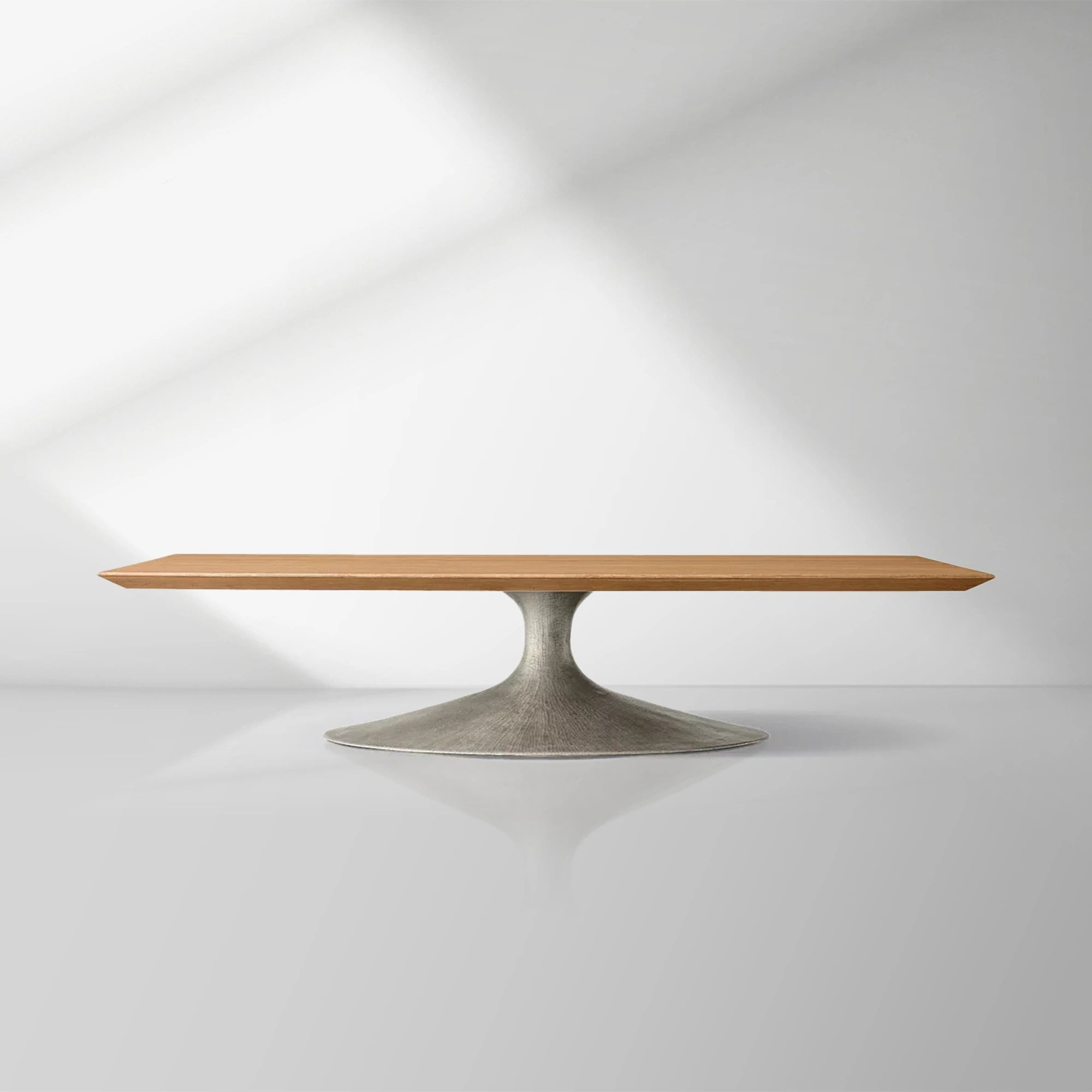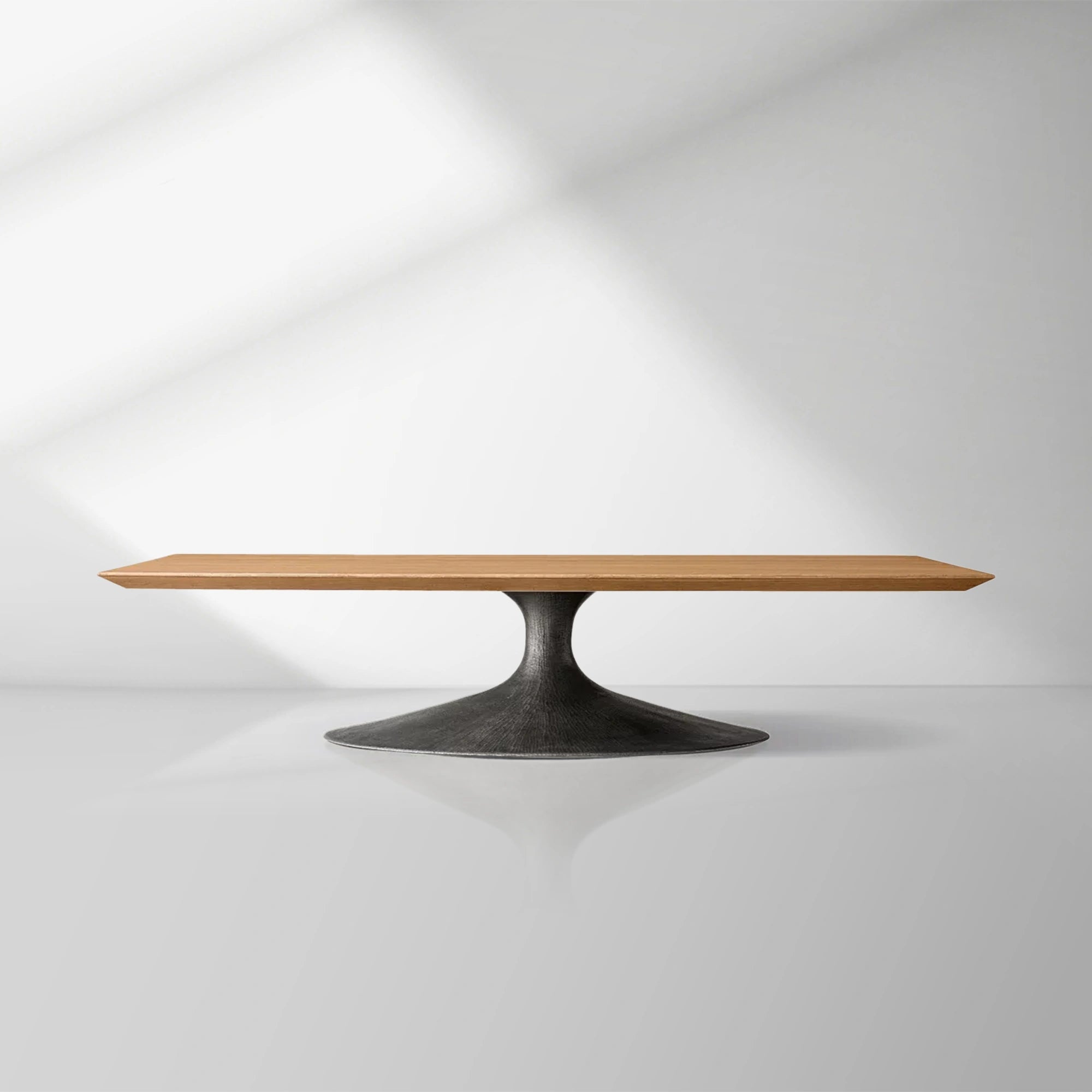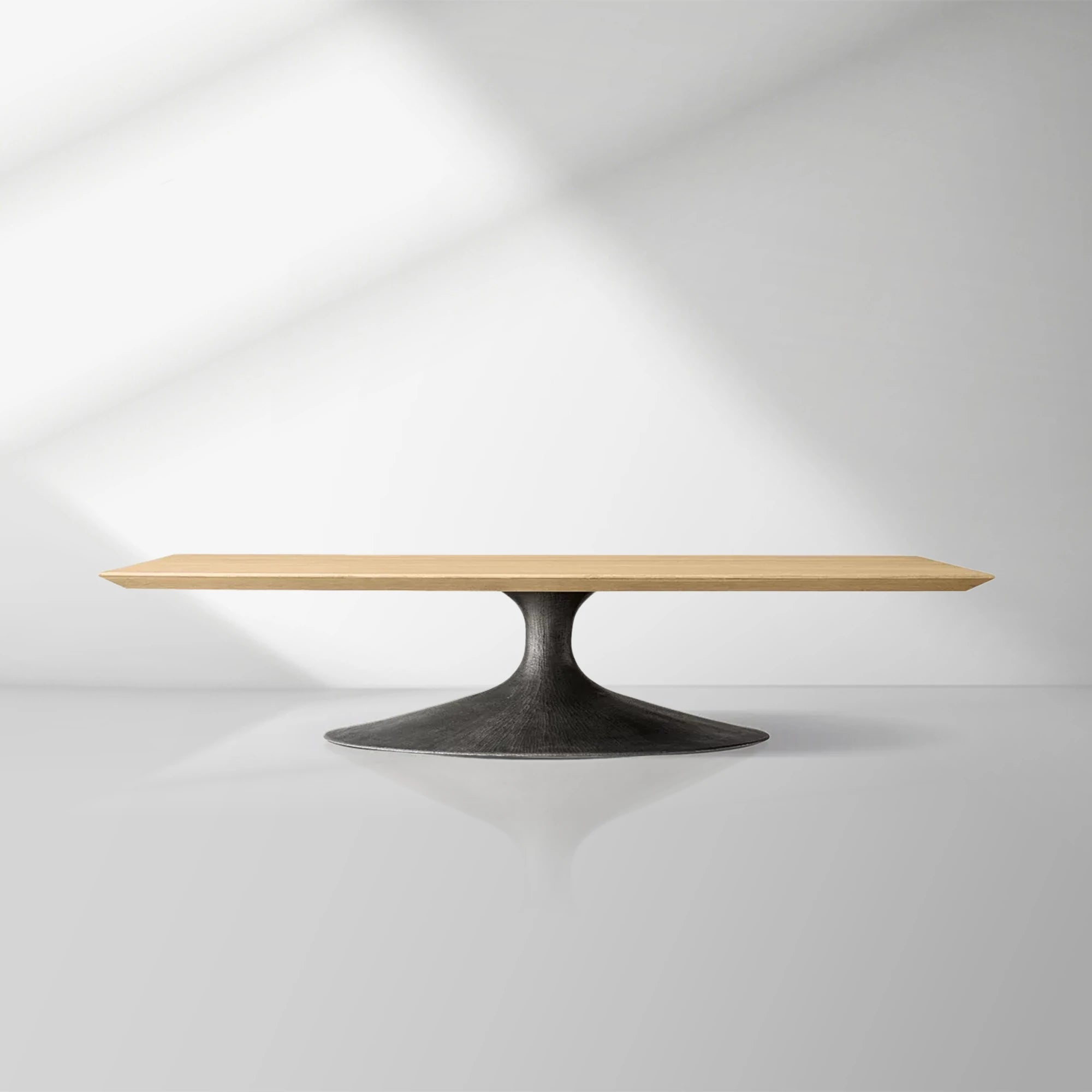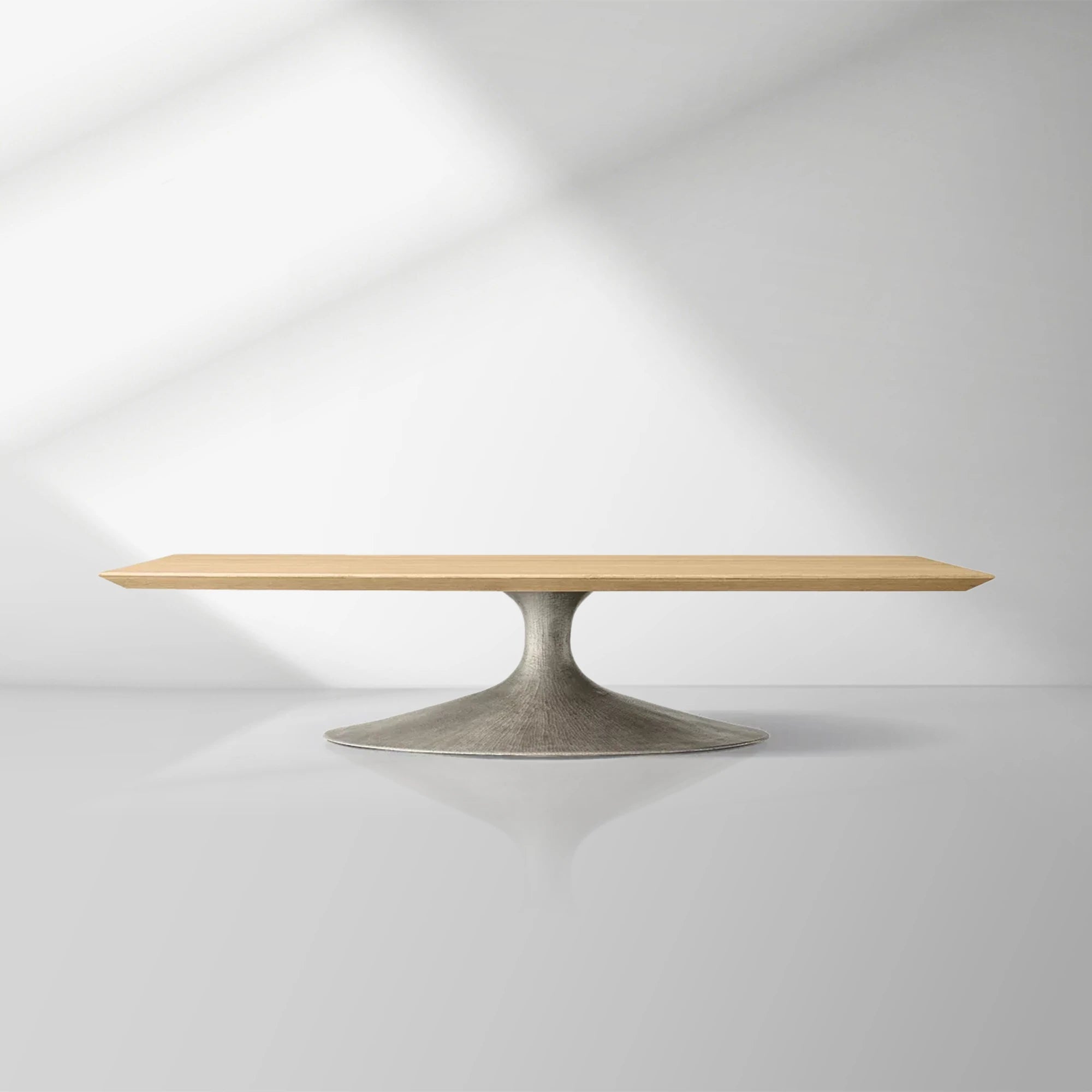 The tabletop is crafted using a blend of solid and engineered wood, topped with your choice of oak or walnut veneer. Each piece undergoes a multi-step finishing process that enhances the wood’s natural grain—whether the textured, wire-brushed oak or the smooth, hand-polished walnut. The refined beveled edge completes the streamlined silhouette.