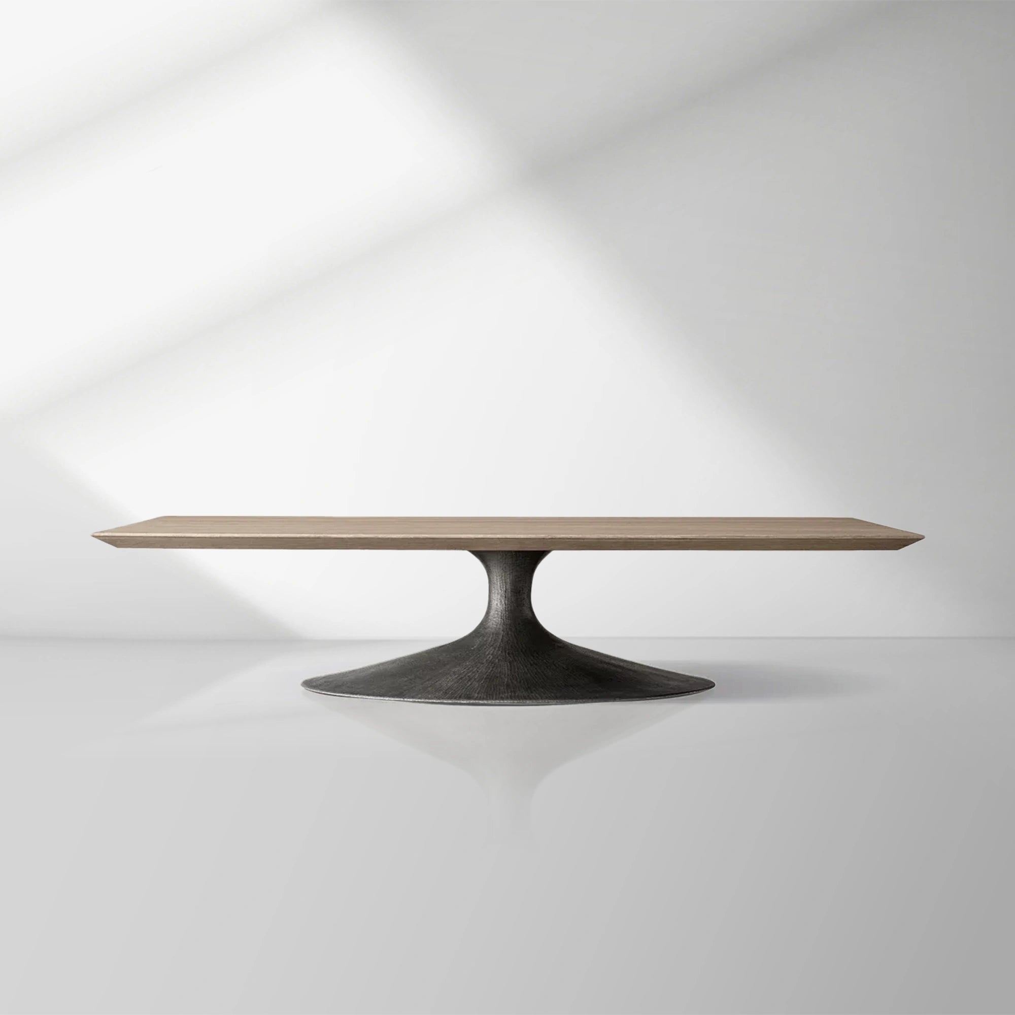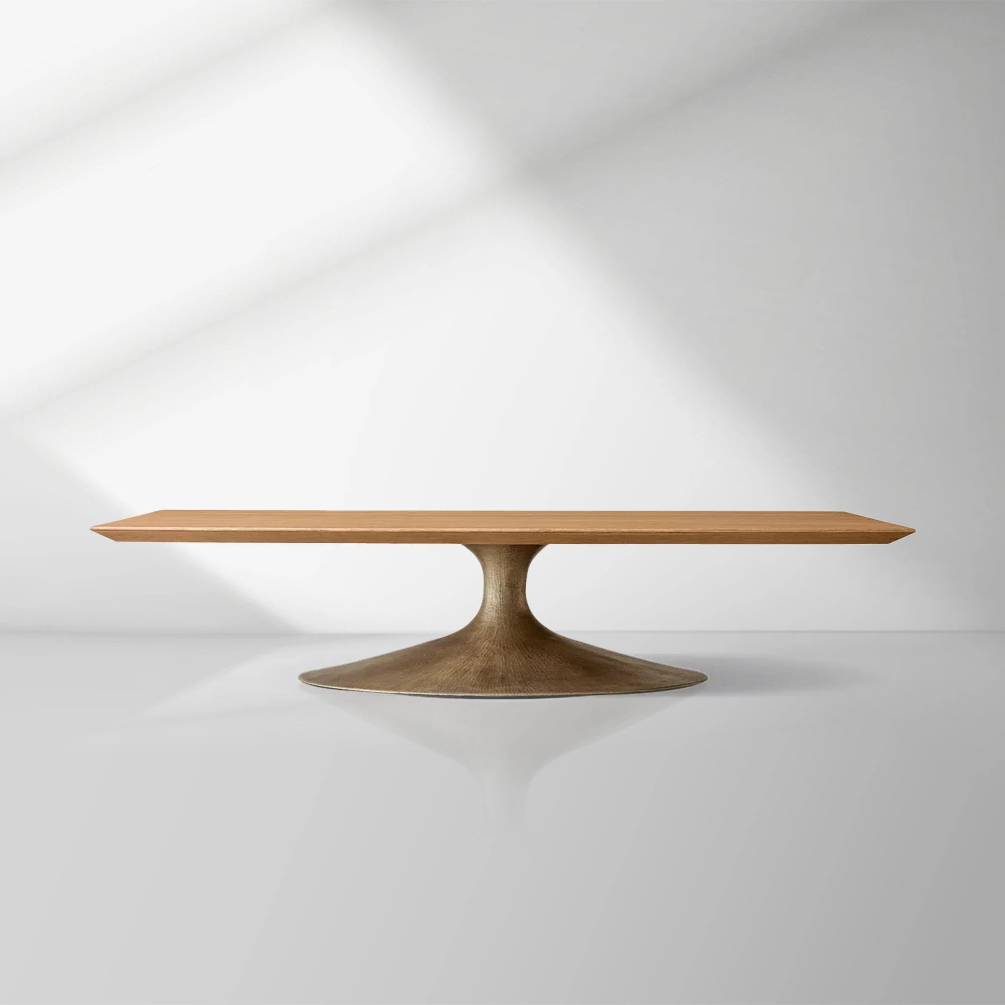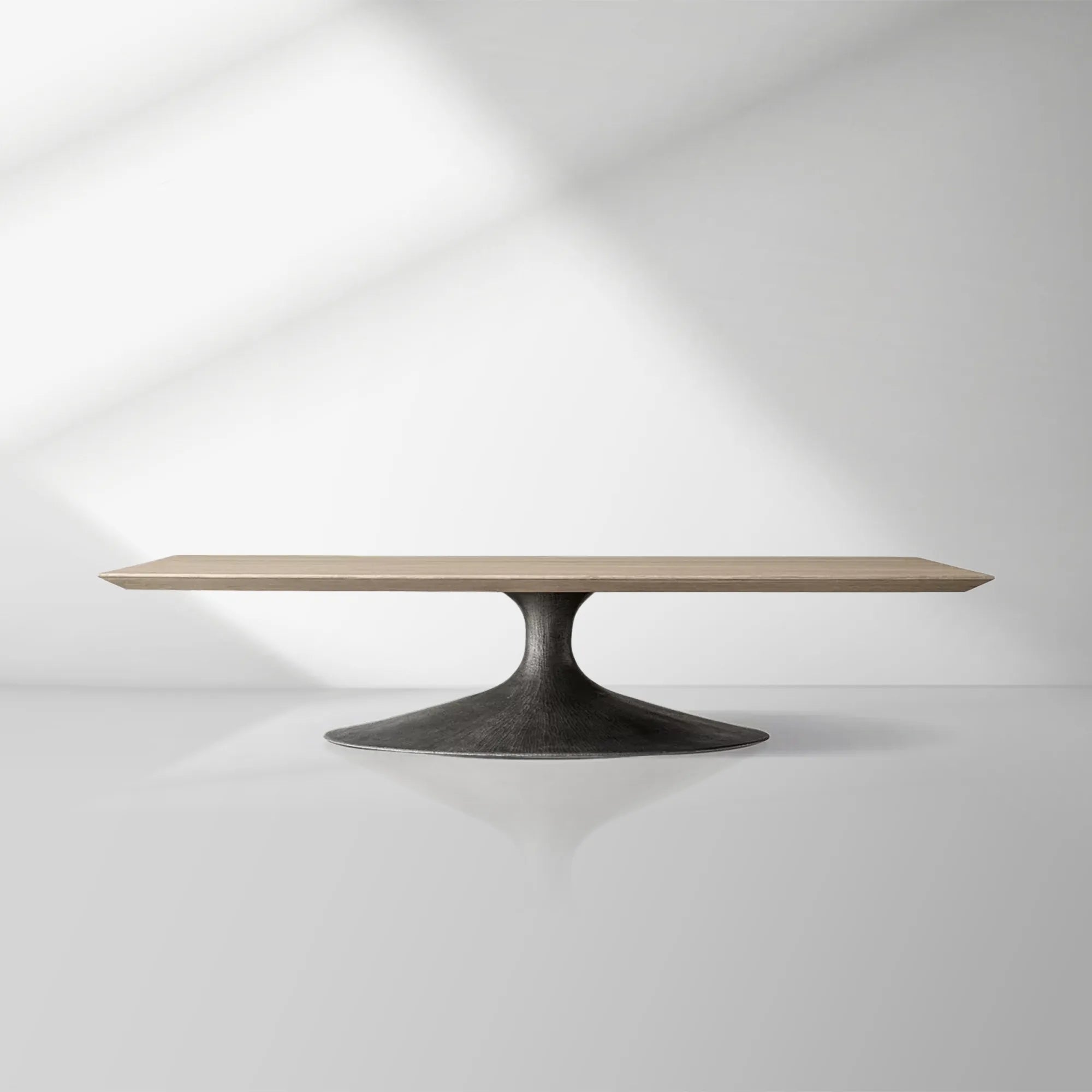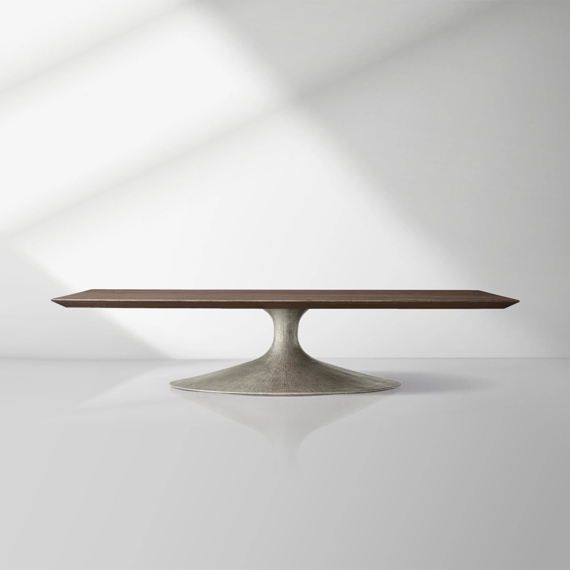 The tabletop is crafted using a blend of solid and engineered wood, topped with your choice of oak or walnut veneer. Each piece undergoes a multi-step finishing process that enhances the wood’s natural grain—whether the textured, wire-brushed oak or the smooth, hand-polished walnut. The refined beveled edge completes the streamlined silhouette.