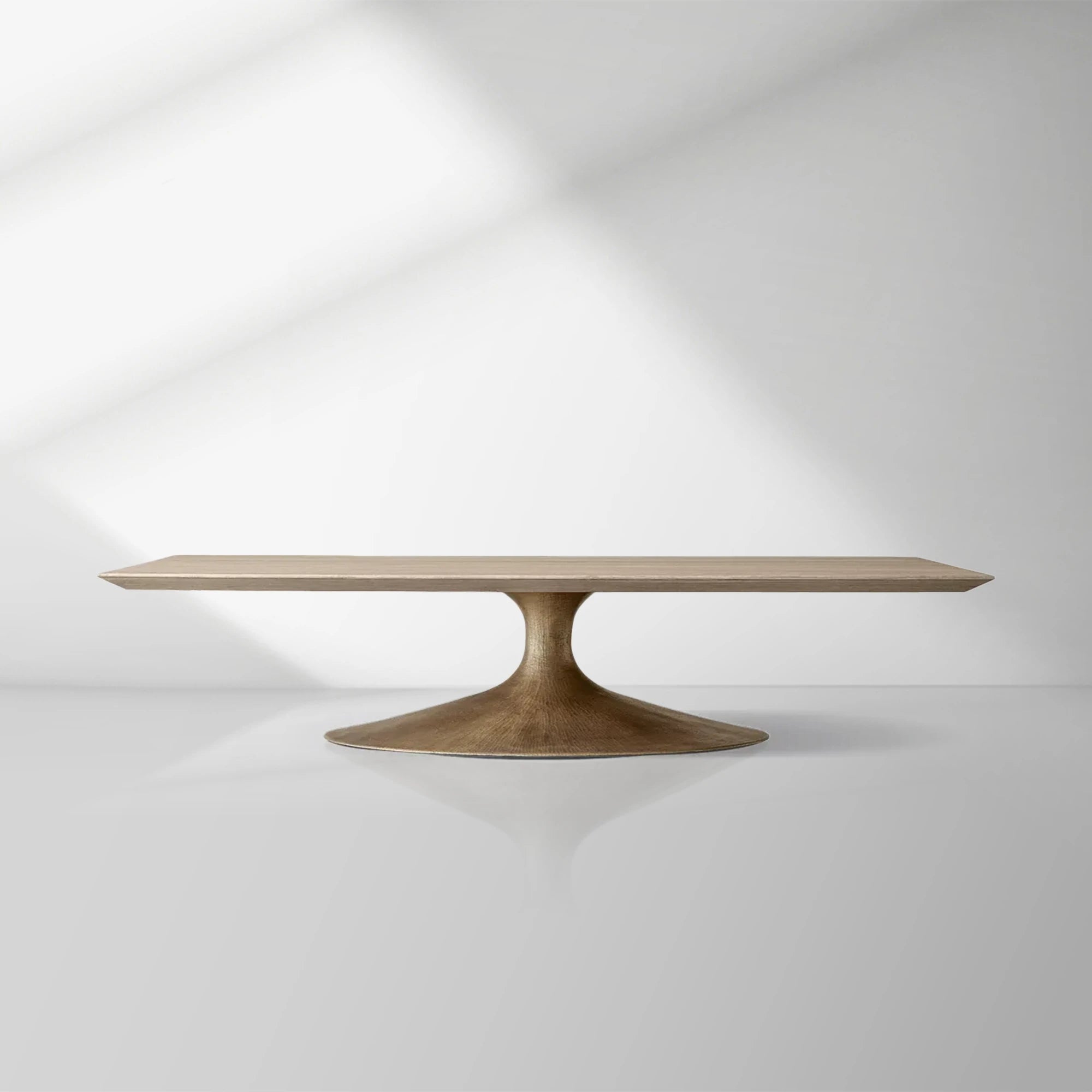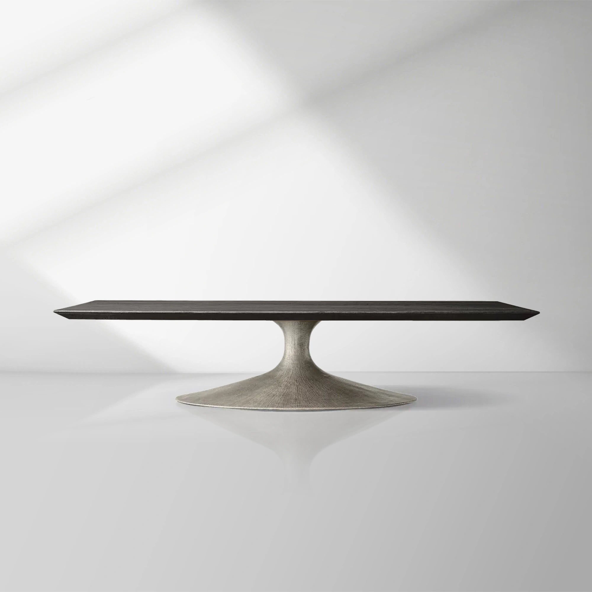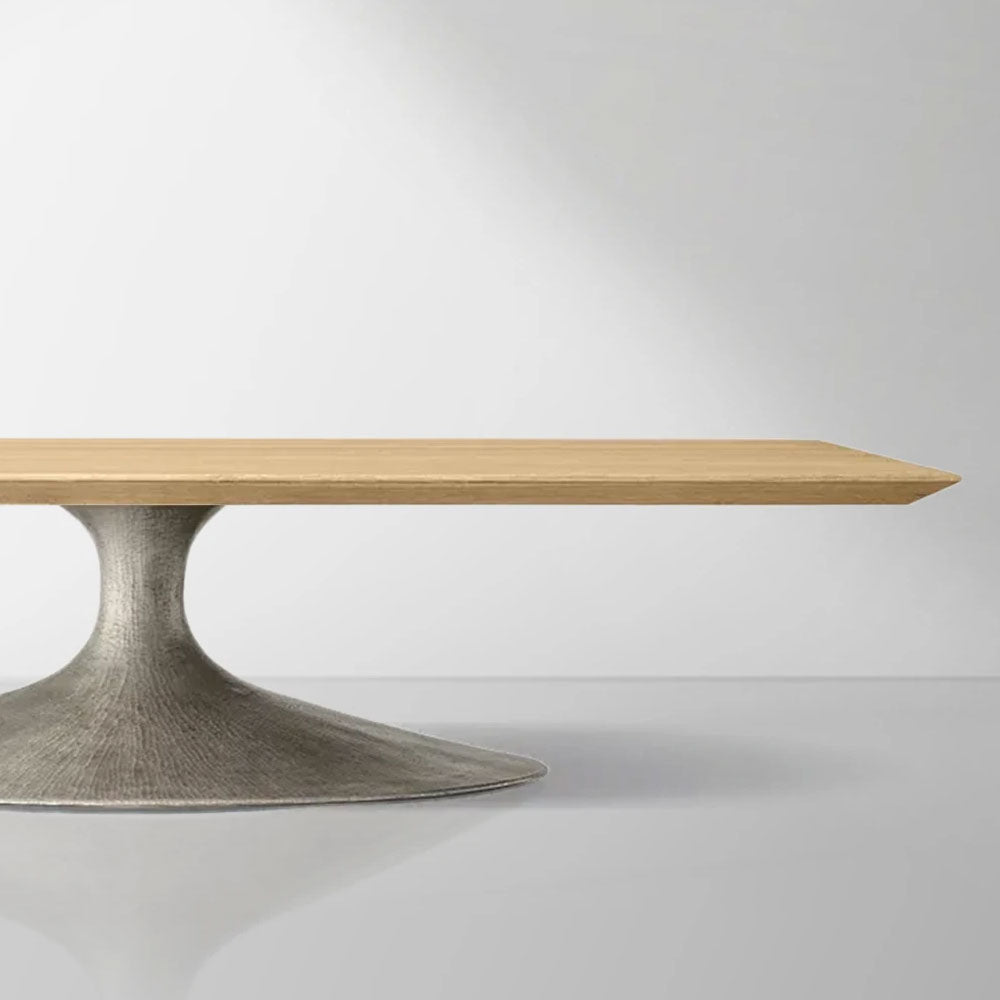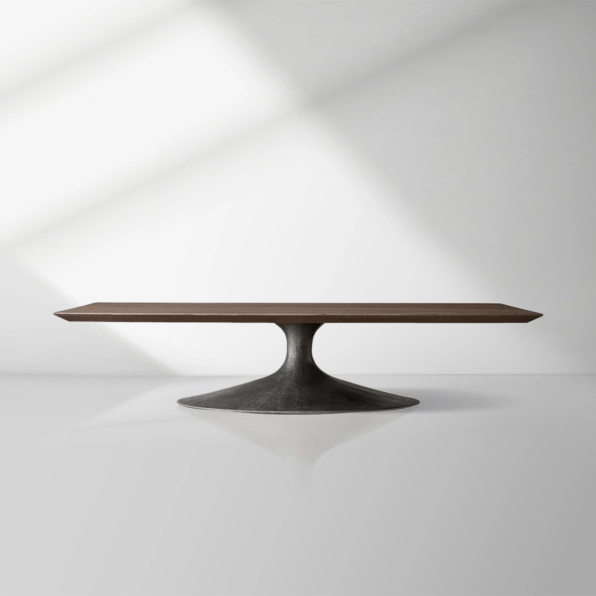 The tabletop is crafted using a blend of solid and engineered wood, topped with your choice of oak or walnut veneer. Each piece undergoes a multi-step finishing process that enhances the wood’s natural grain—whether the textured, wire-brushed oak or the smooth, hand-polished walnut. The refined beveled edge completes the streamlined silhouette.