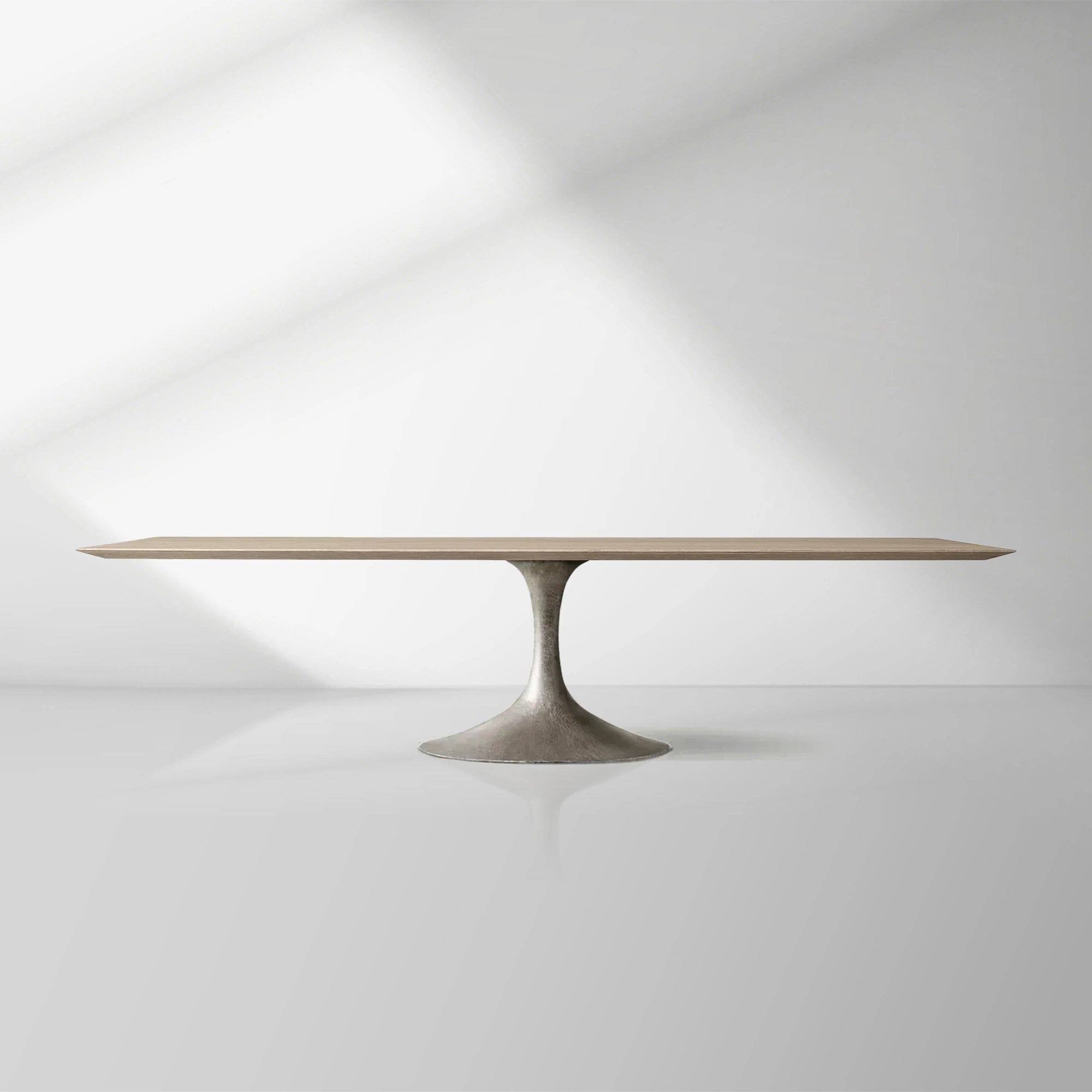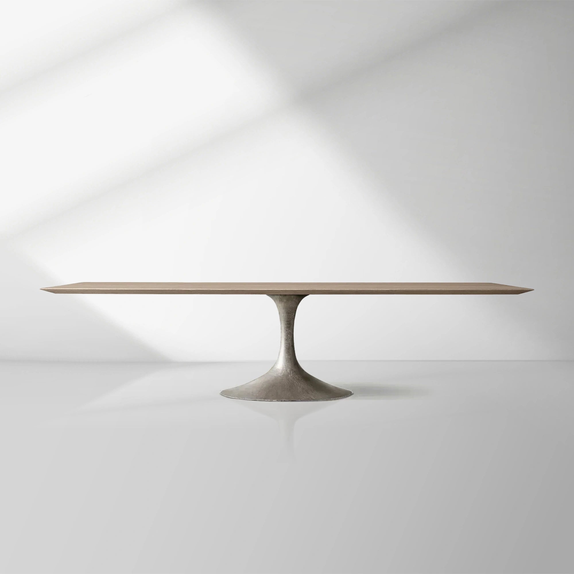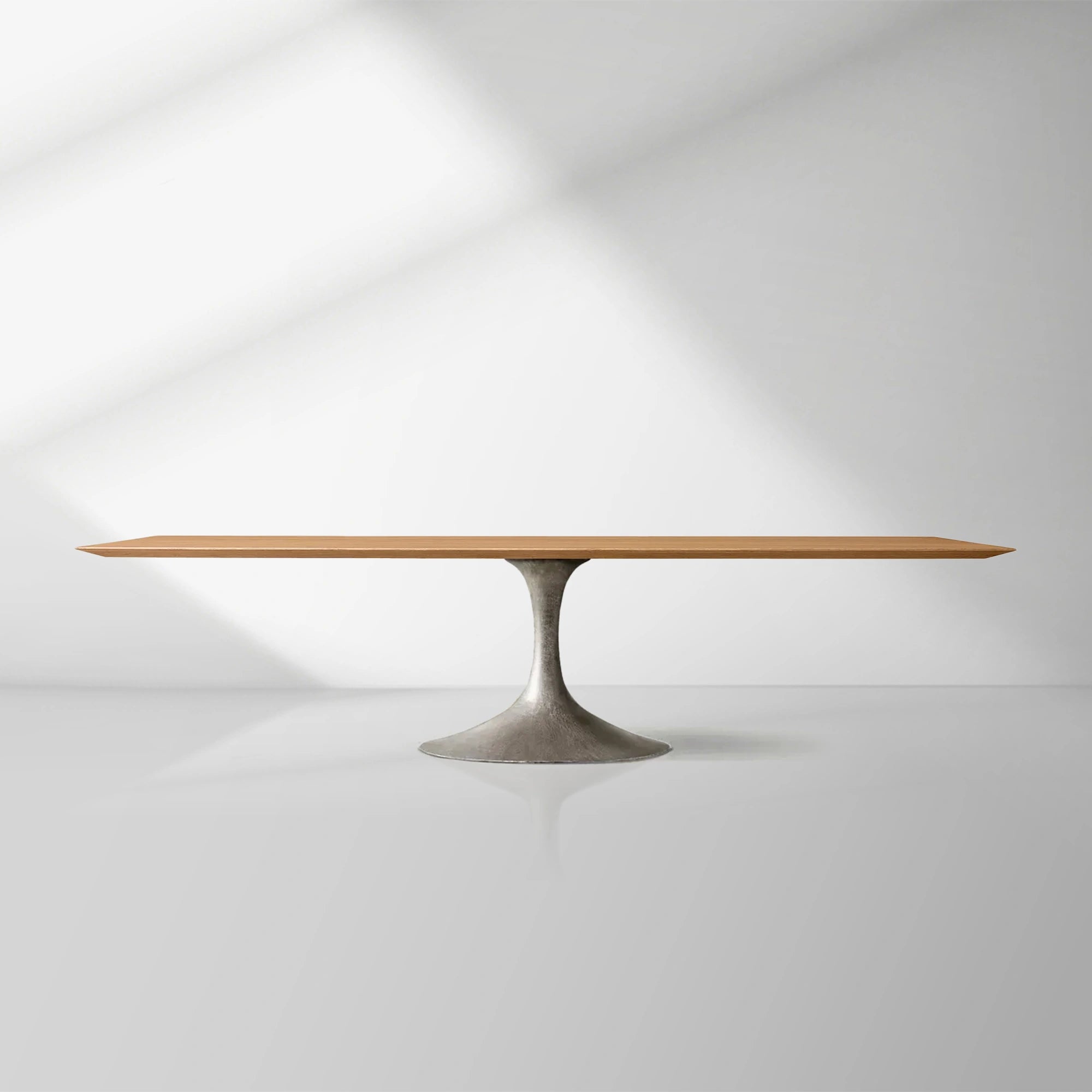 Inspired by the graceful aesthetics of mid-century modern design, the Aero Dining Table elegantly combines sculptural form with functional simplicity. Its distinctive arched base, crafted from cast steel, offers both stability and artistic flair, while the gently beveled solid wood top—available in oak or walnut—adds refined warmth to any dining space.