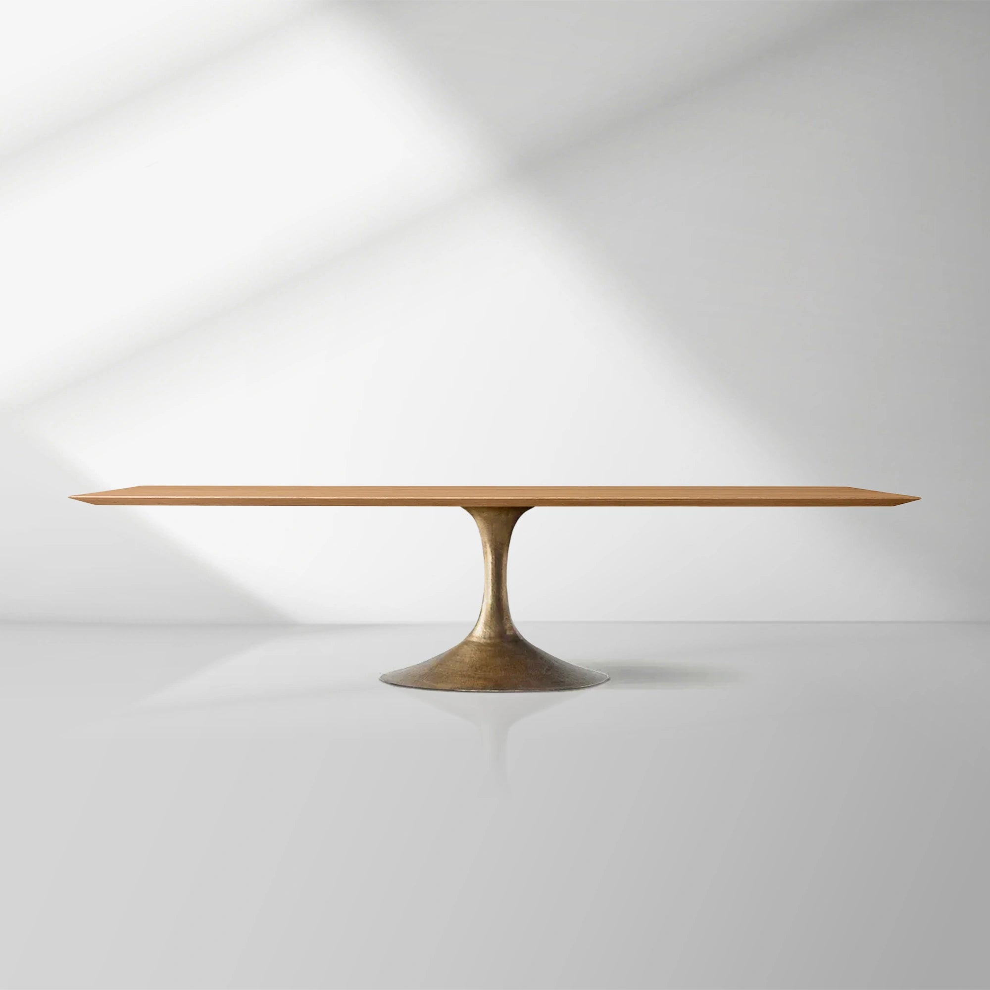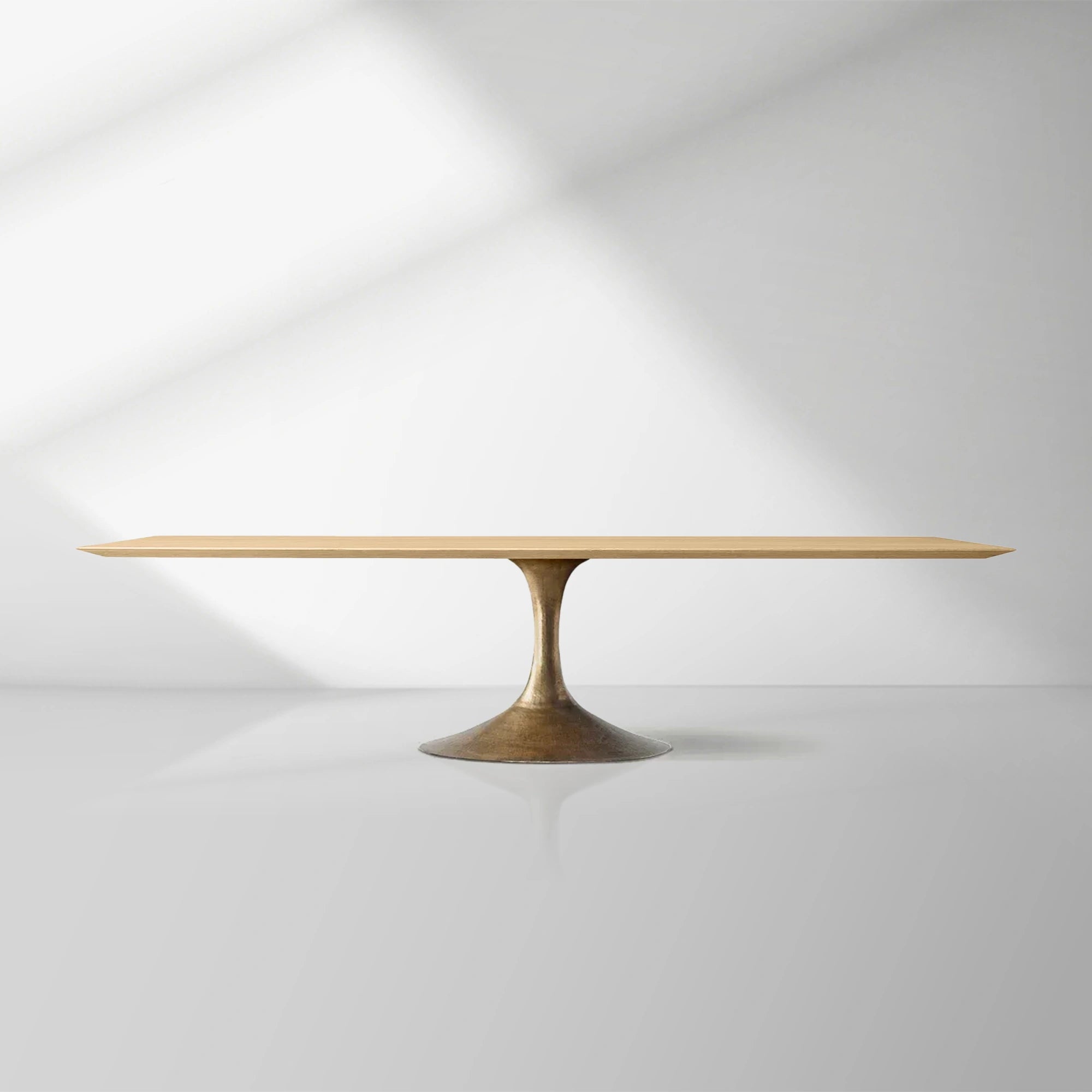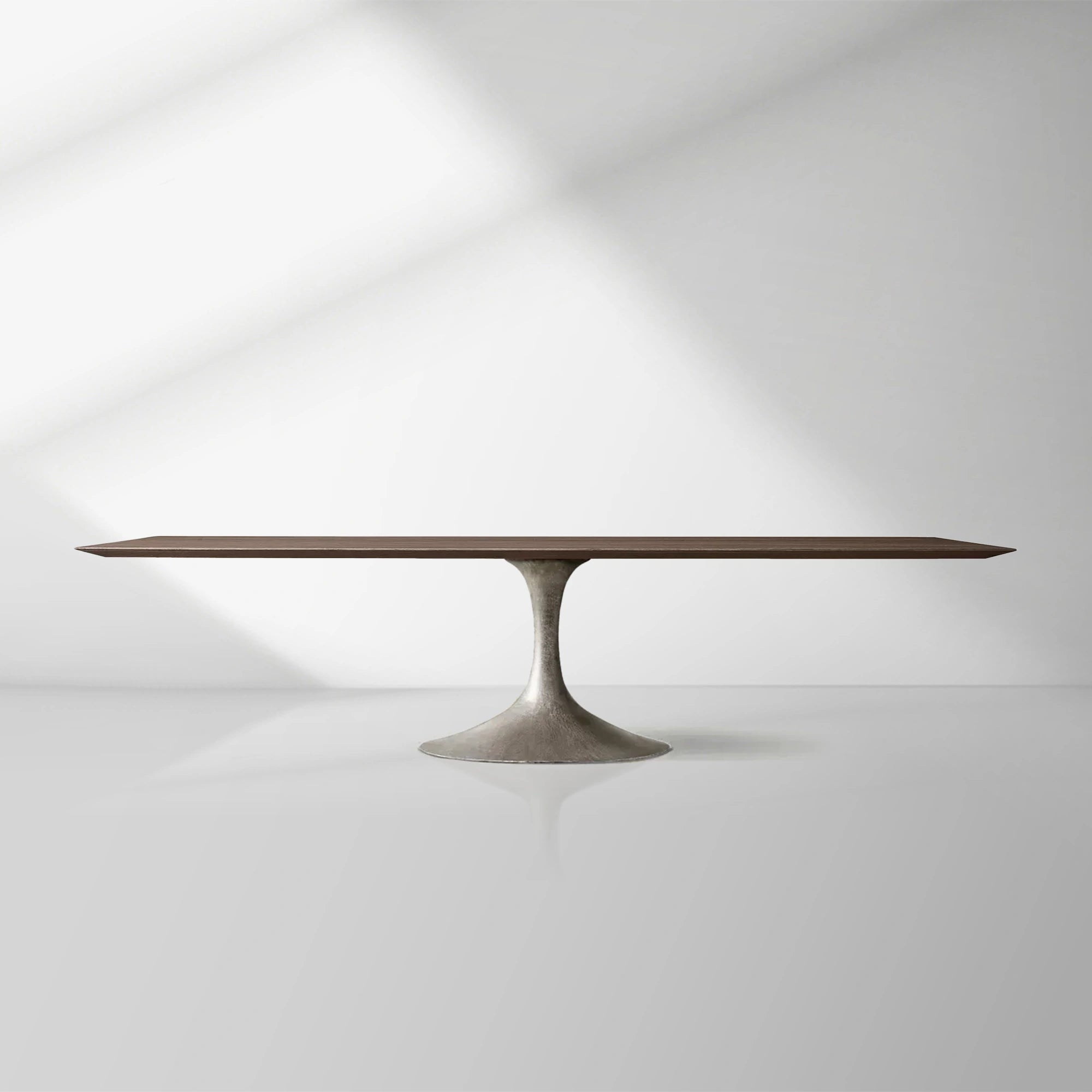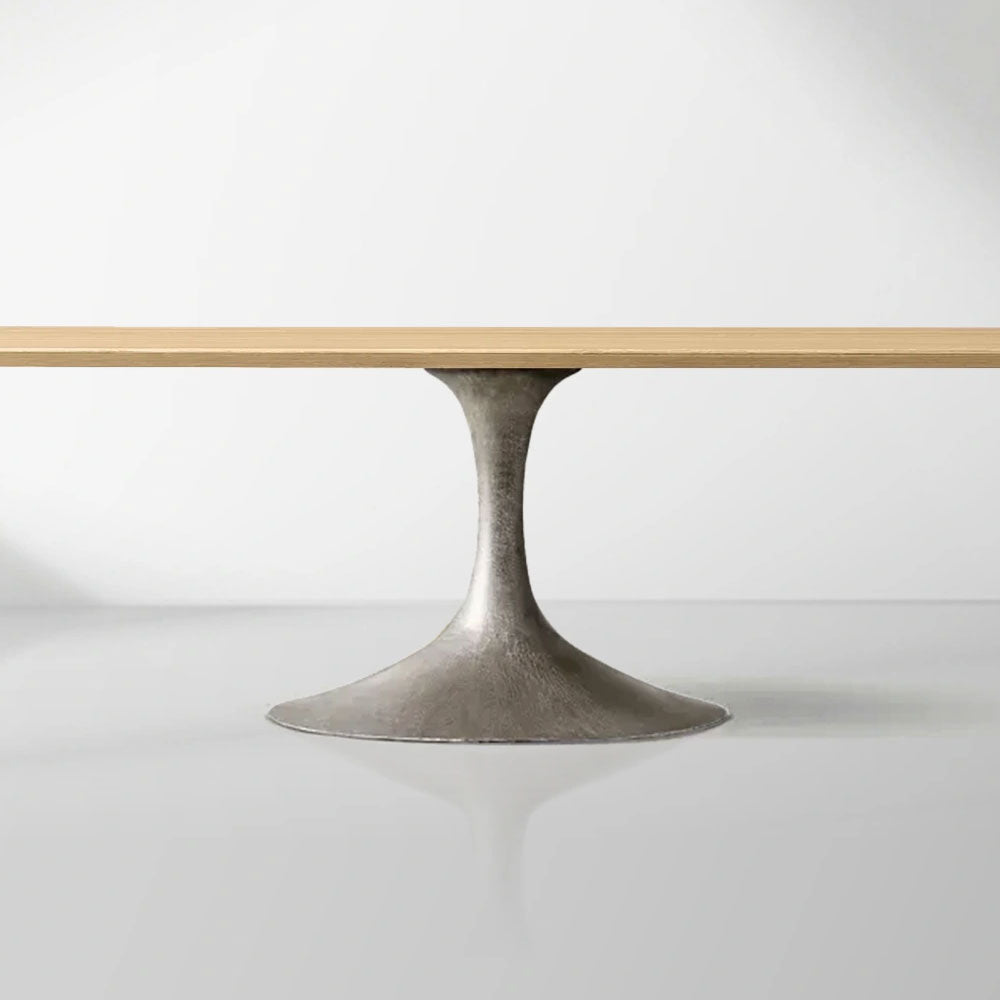 Inspired by the graceful aesthetics of mid-century modern design, the Aero Dining Table elegantly combines sculptural form with functional simplicity. Its distinctive arched base, crafted from cast steel, offers both stability and artistic flair, while the gently beveled solid wood top—available in oak or walnut—adds refined warmth to any dining space.