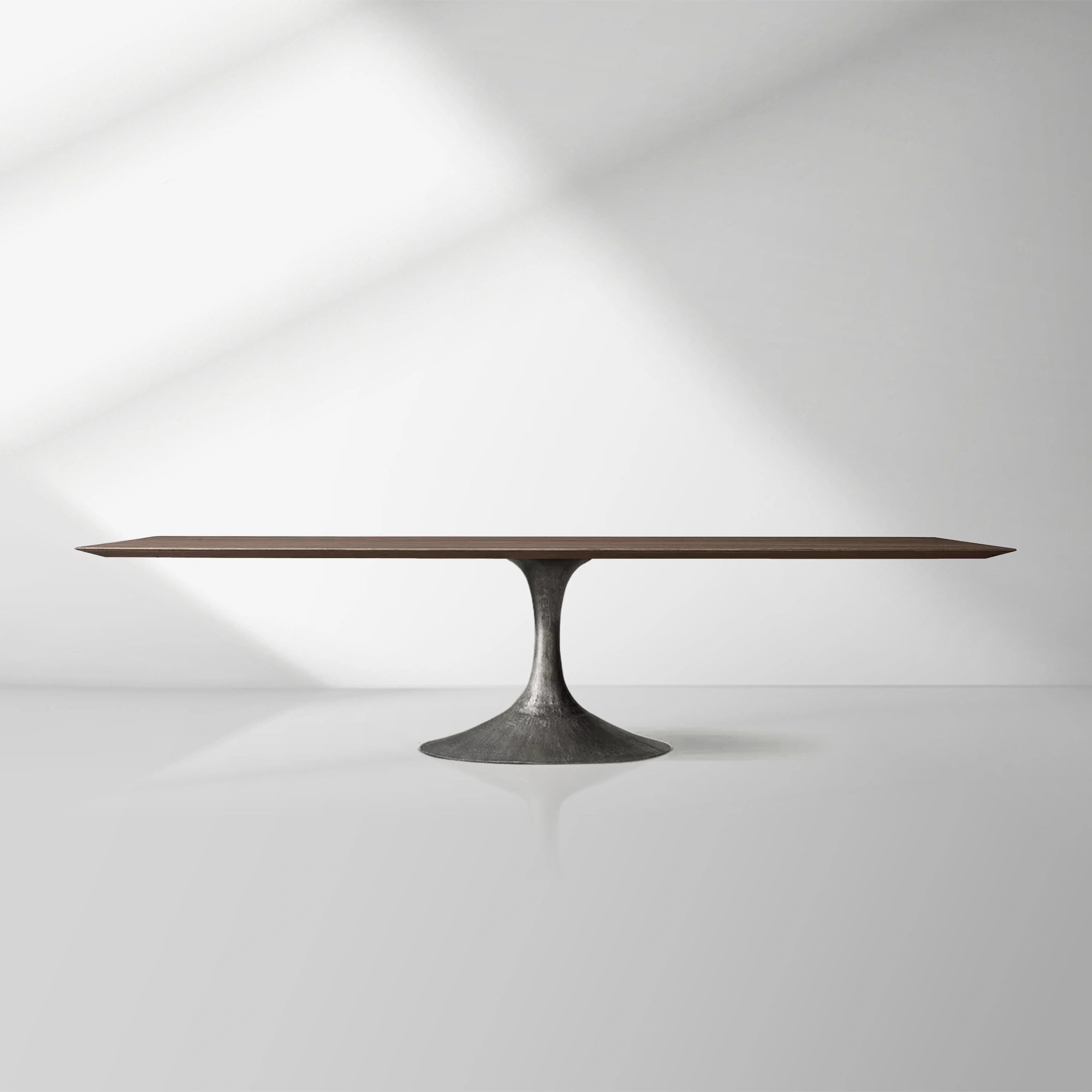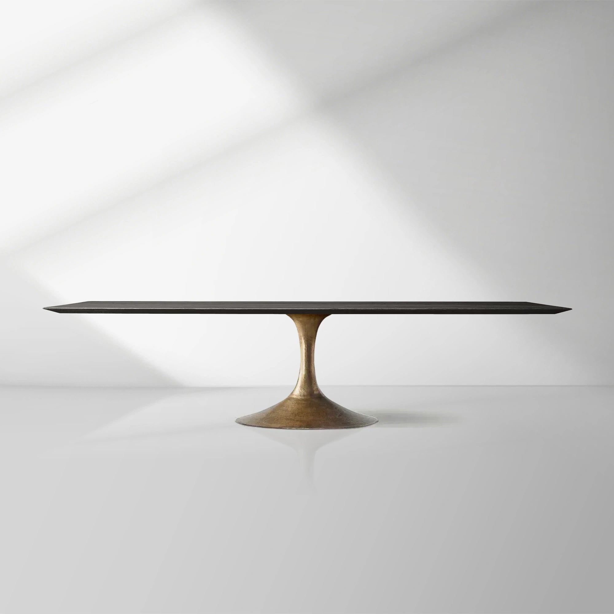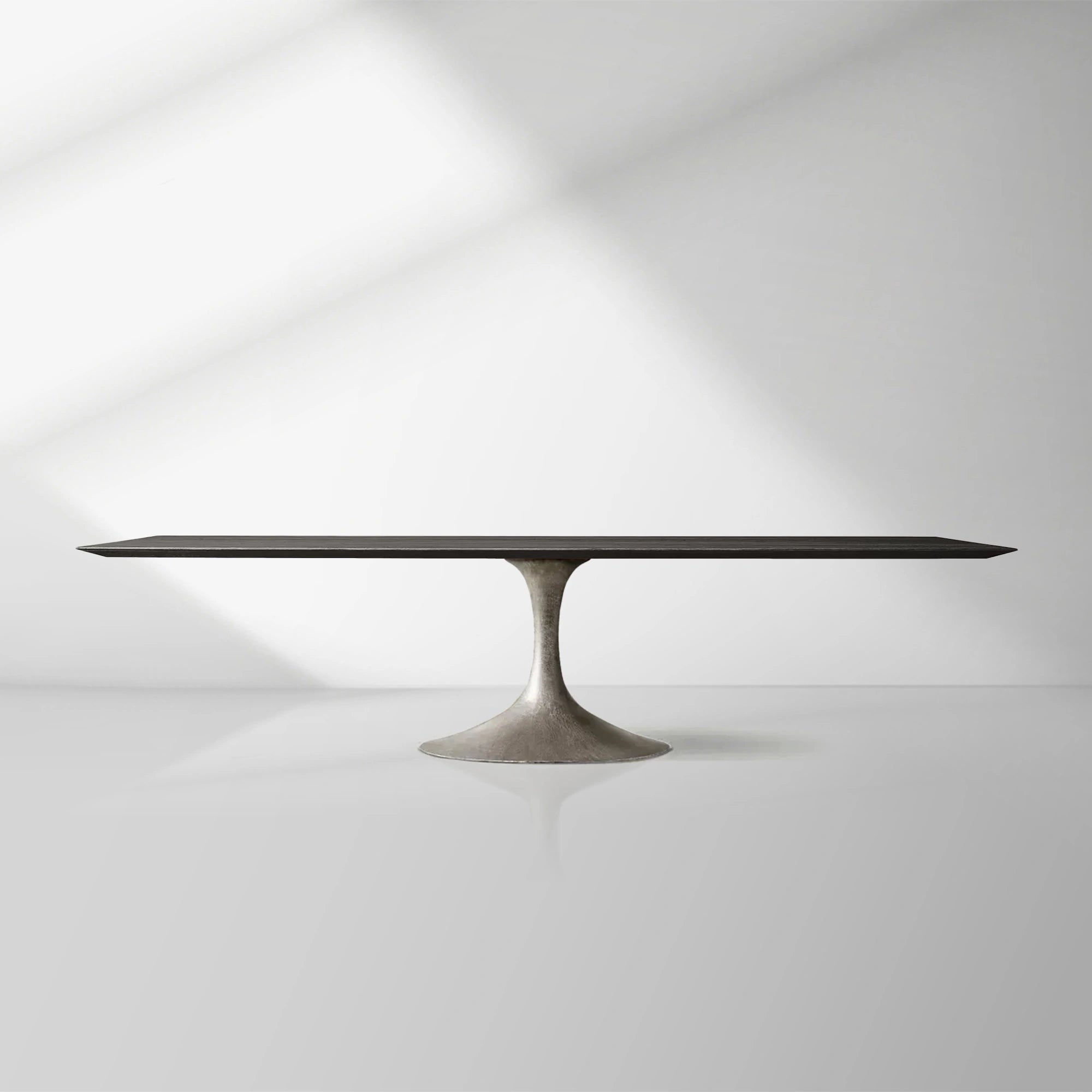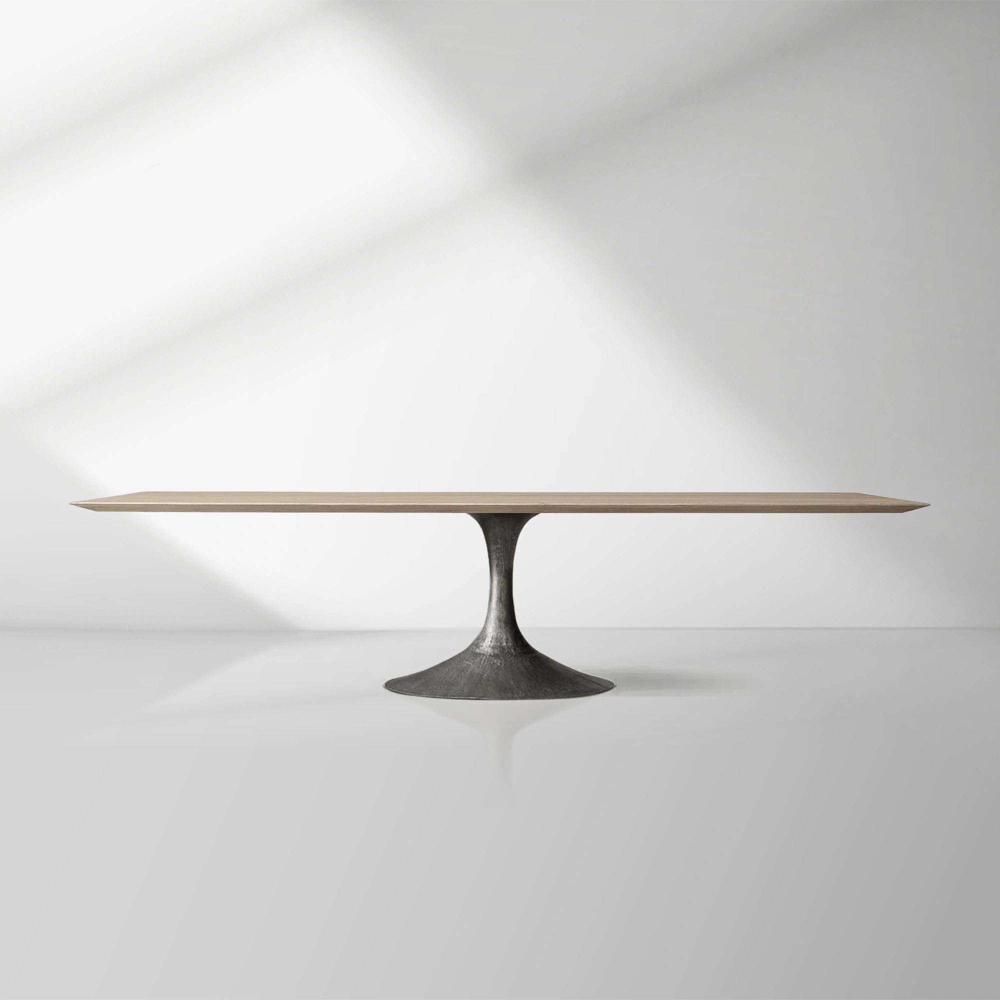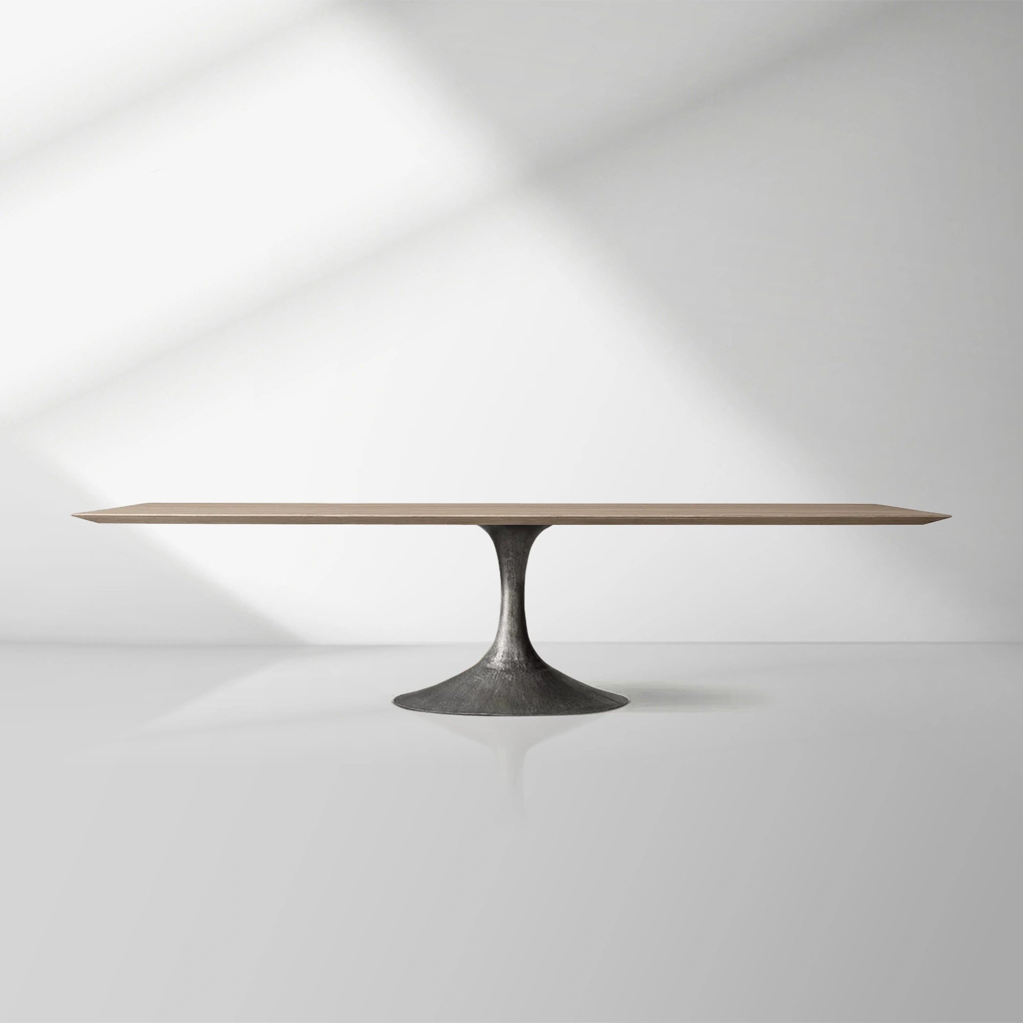 Featuring a dry-brushed matte steel base with intentional textural detailing, this table stands as a statement piece that celebrates both craftsmanship and modern design. Ideal for everyday meals and special gatherings alike, the Aero table brings timeless elegance and character to your home.