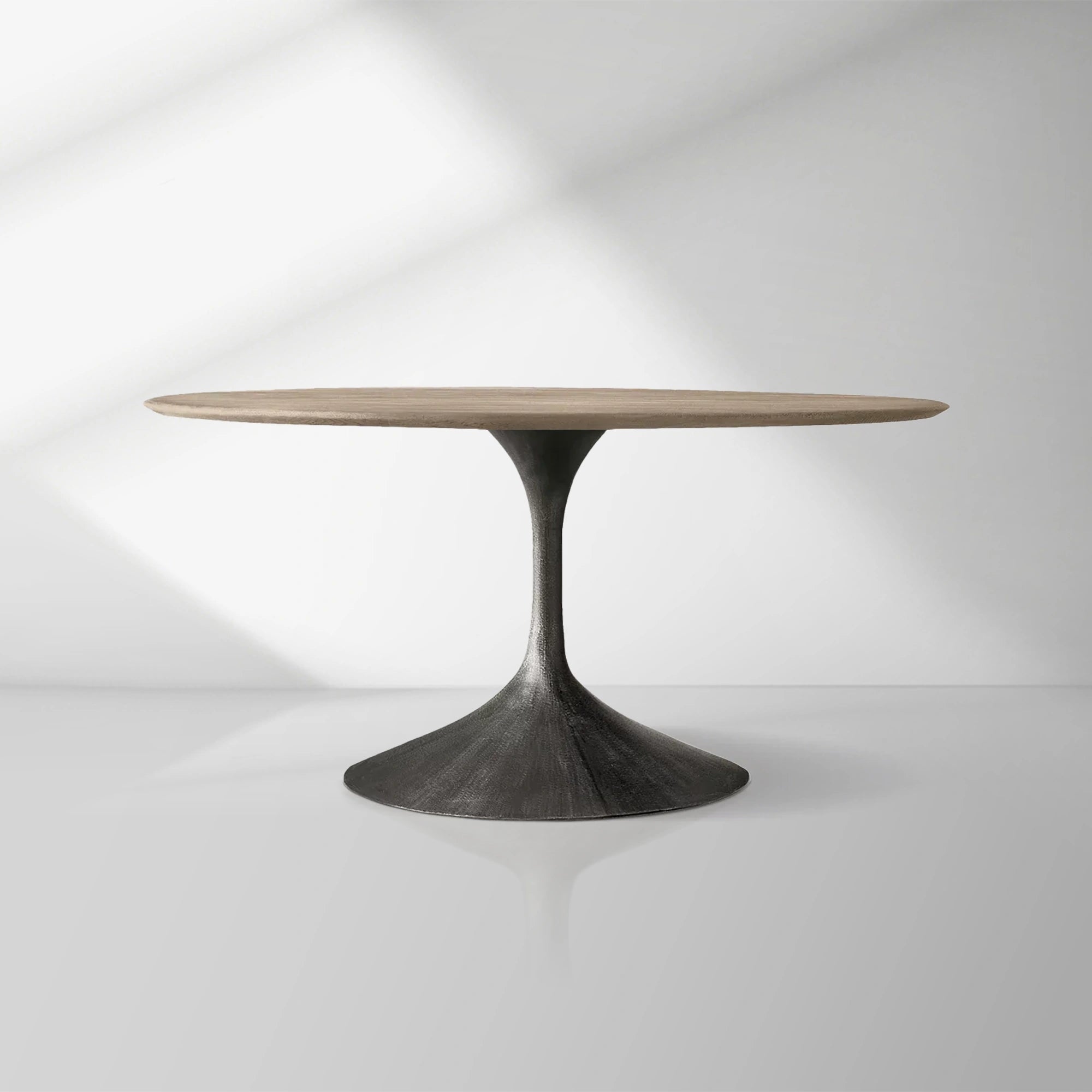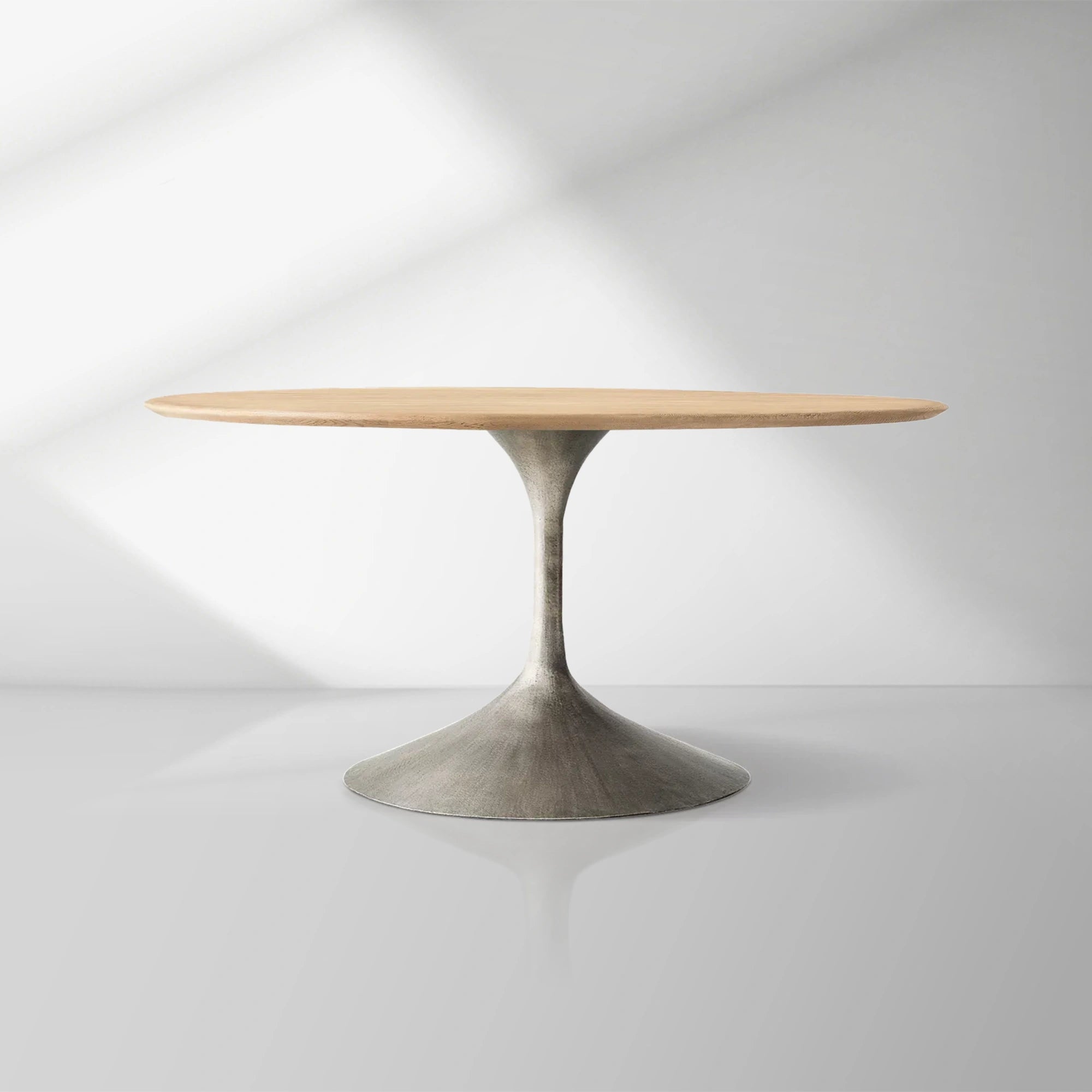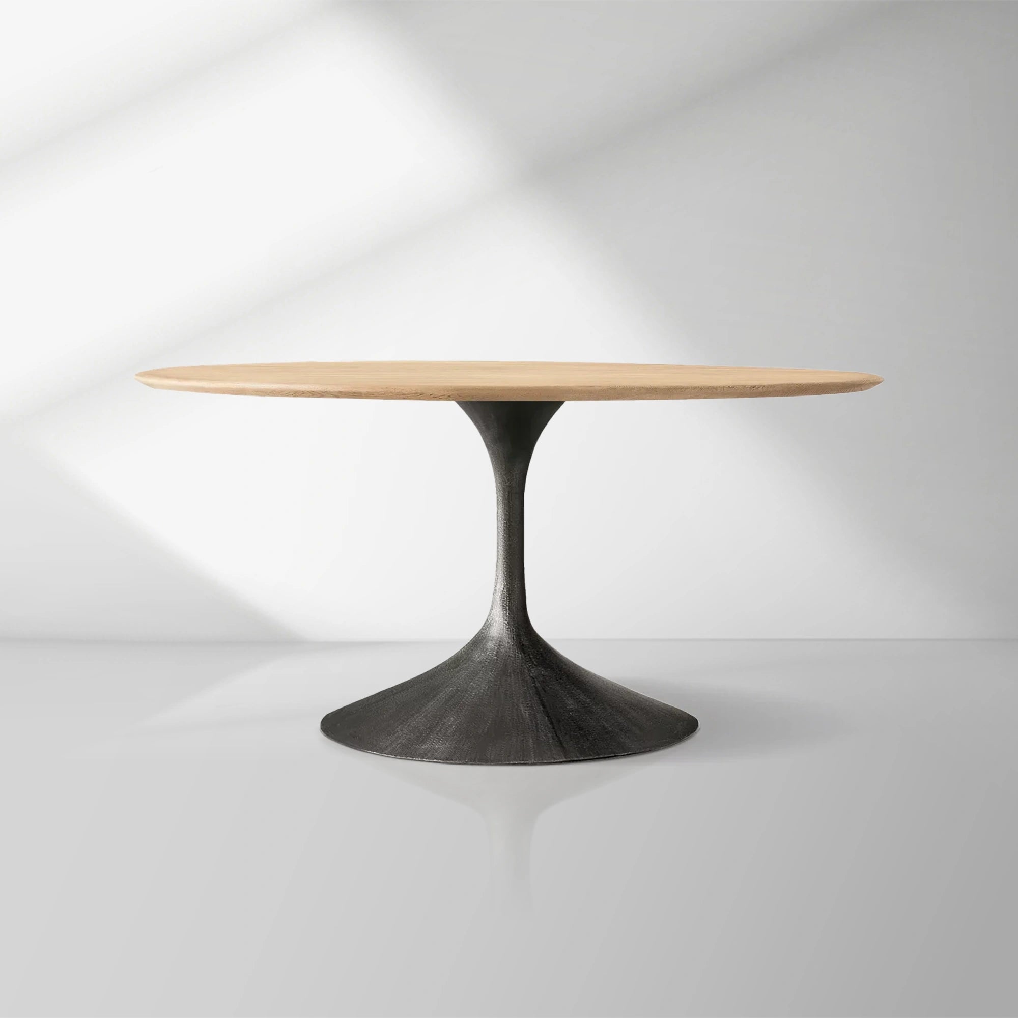 Inspired by the clean elegance of mid-century design, the Aero Round Dining Table blends sculptural form with functional beauty. Its gracefully arched cast steel base adds a touch of artistry and stability, while the circular beveled-edge top—crafted in oak or walnut—offers a refined surface for everyday dining and entertaining.