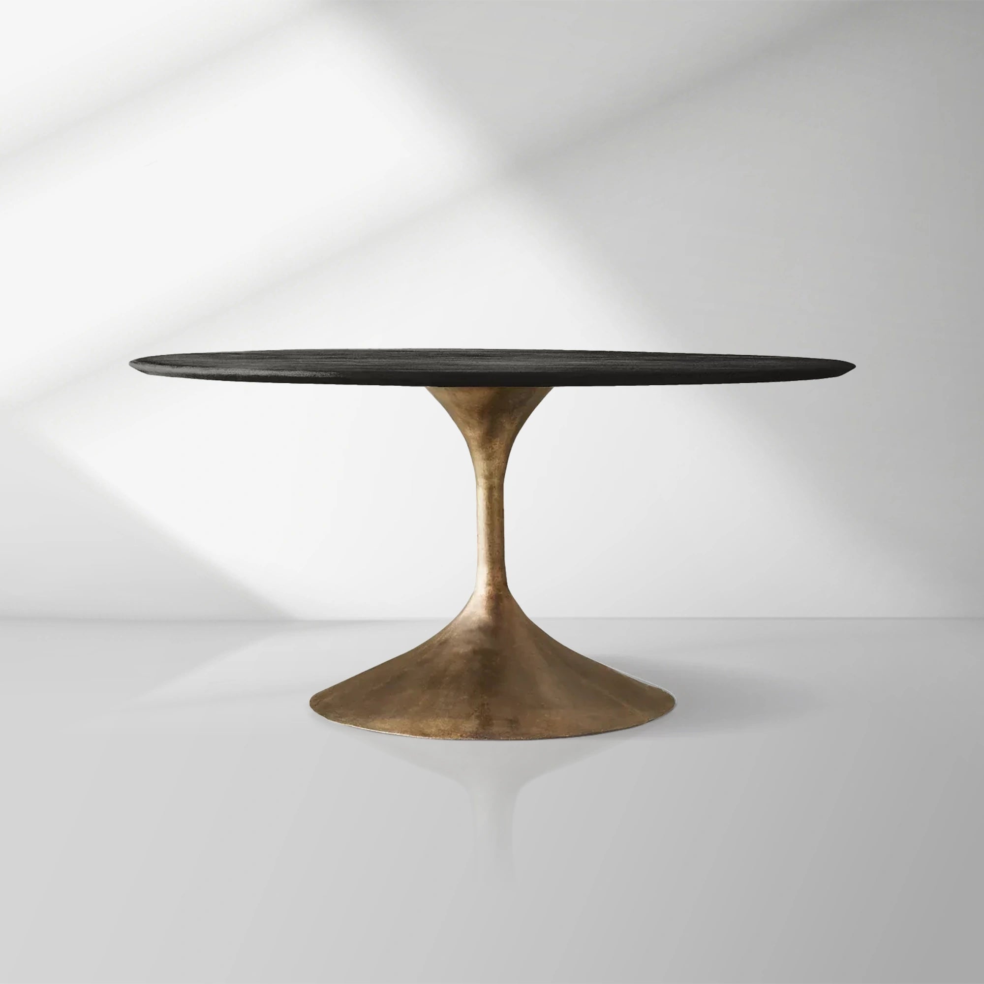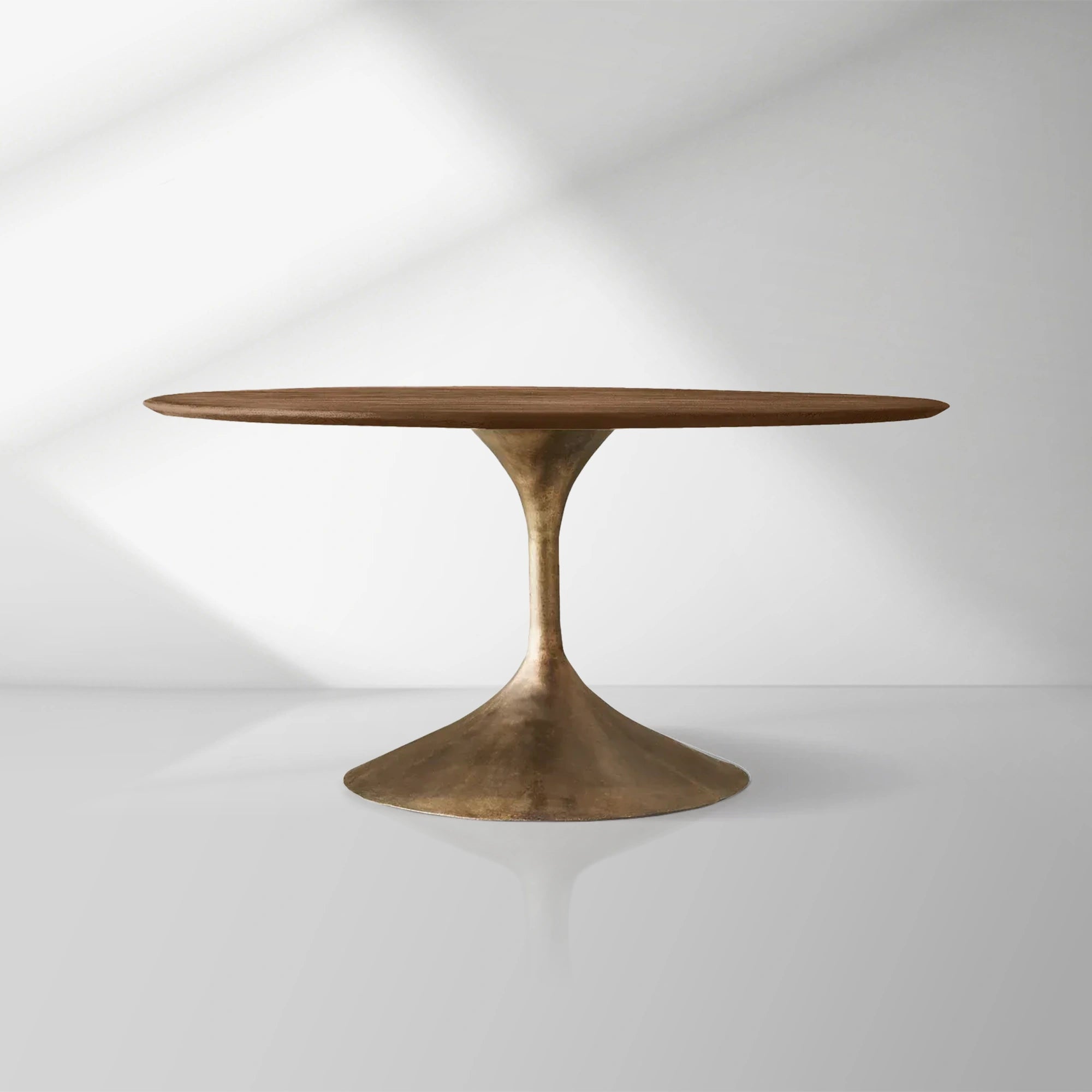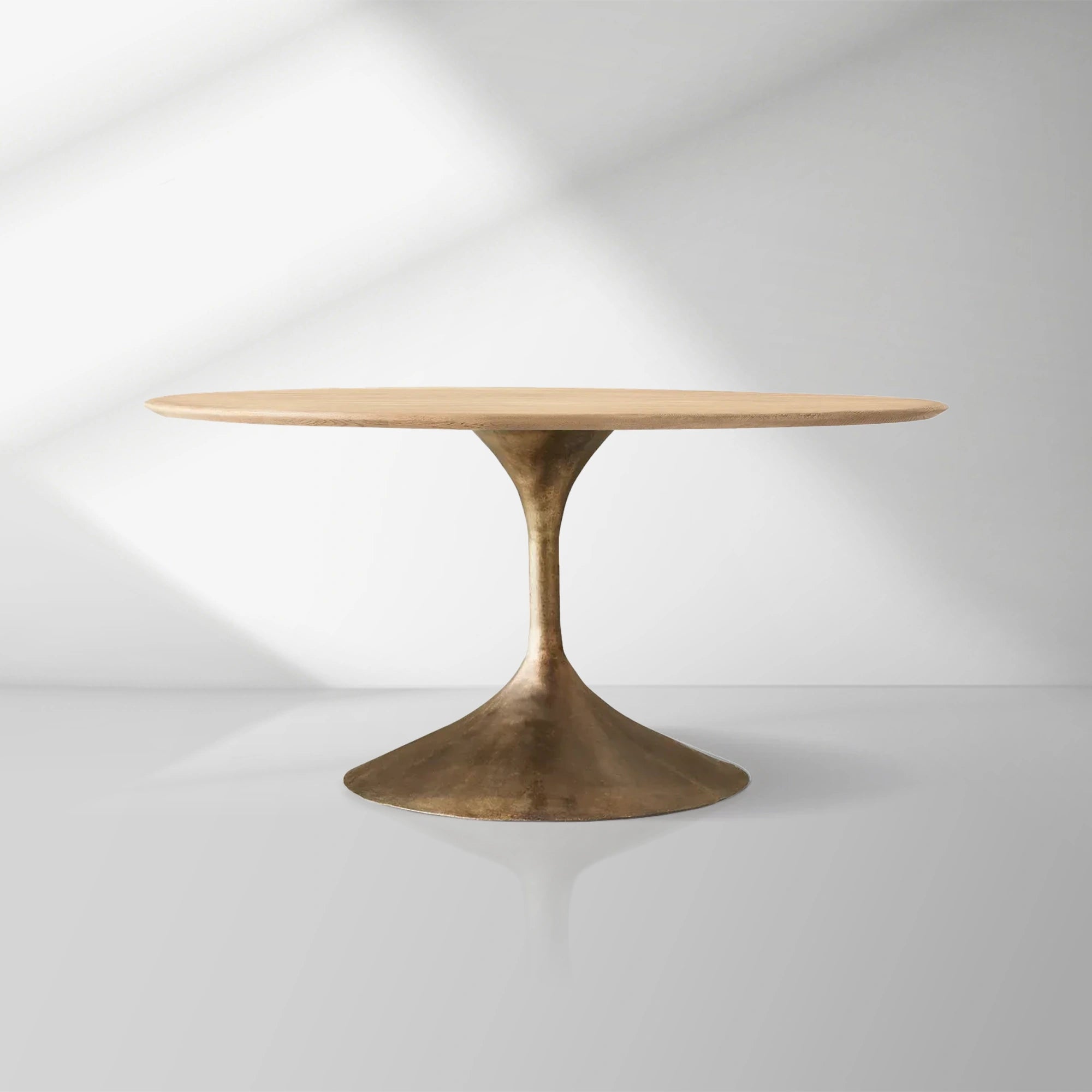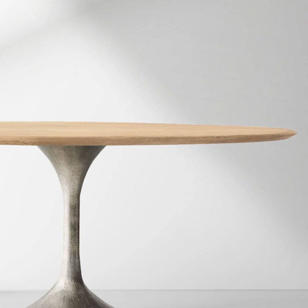 Inspired by the clean elegance of mid-century design, the Aero Round Dining Table blends sculptural form with functional beauty. Its gracefully arched cast steel base adds a touch of artistry and stability, while the circular beveled-edge top—crafted in oak or walnut—offers a refined surface for everyday dining and entertaining.