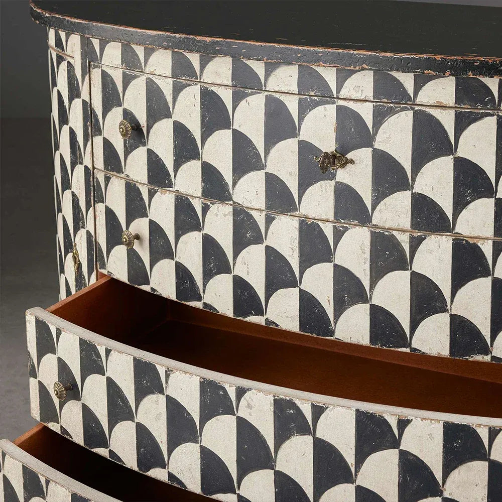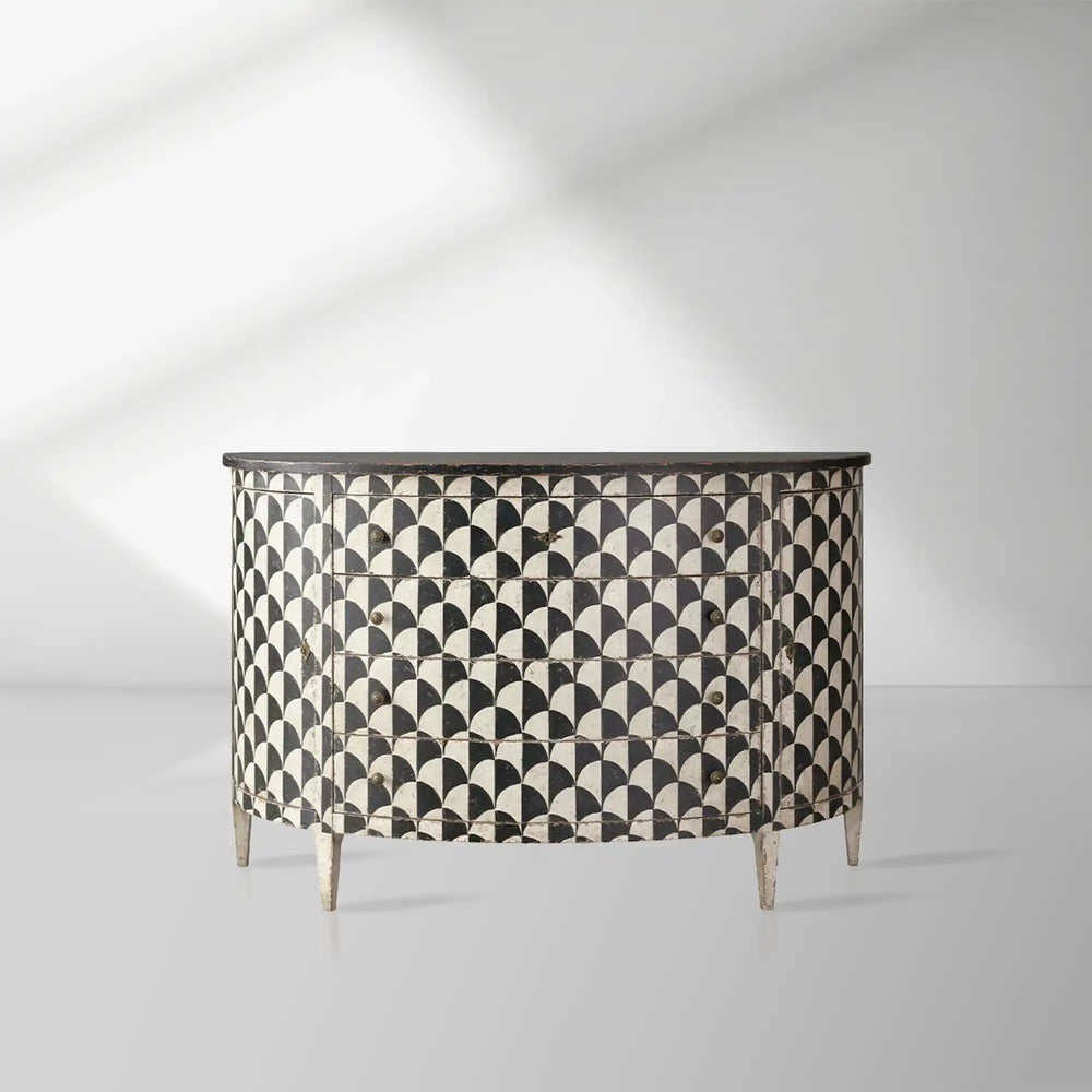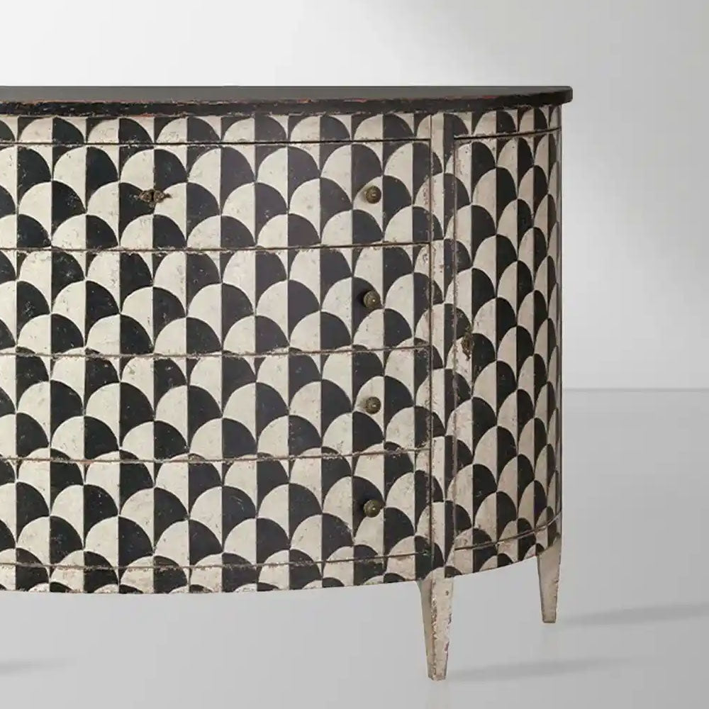 Constructed from solid poplar wood, the Andretta Cabinet reflects generations of woodworking expertise. Its elegant façade is adorned with a hand-painted black and white geometric motif, lending a touch of understated charm and inviting warmth. The finishing process alone is an art form—involving carefully layered applications of stain, paint, and lacquer, all executed by hand—a labor of love that takes over three days to complete.