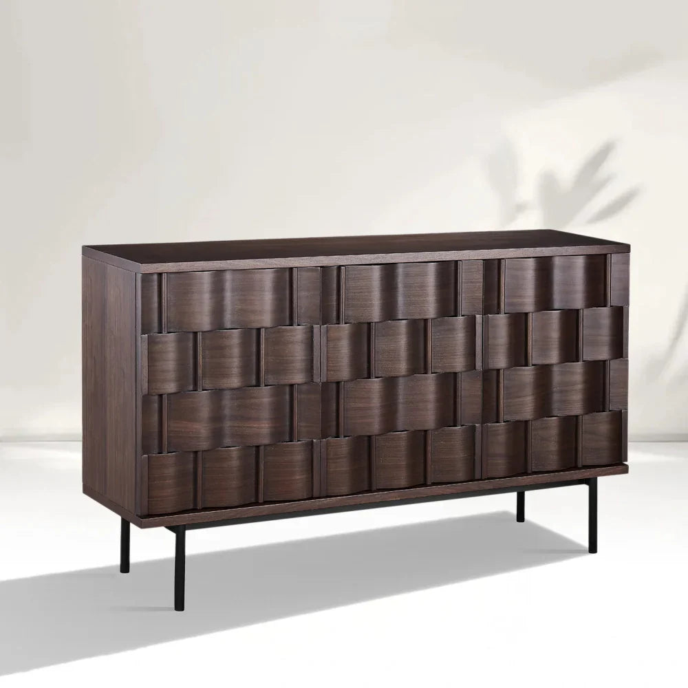 Introducing the Ariel 3-Door Sideboard, where minimalist Nordic design meets the delicate artistry of Japanese craftsmanship. Defined by its sculptural woven-texture door panels, this piece brings tactile elegance and organic warmth to any contemporary or mid-century interior. Finished in a rich smoky walnut tone and framed in natural oak veneer, the Ariel balances durability with understated luxury, while slim stainless steel legs lend a light, elevated presence.