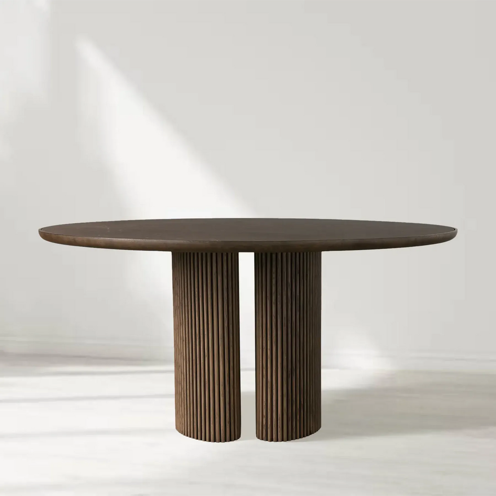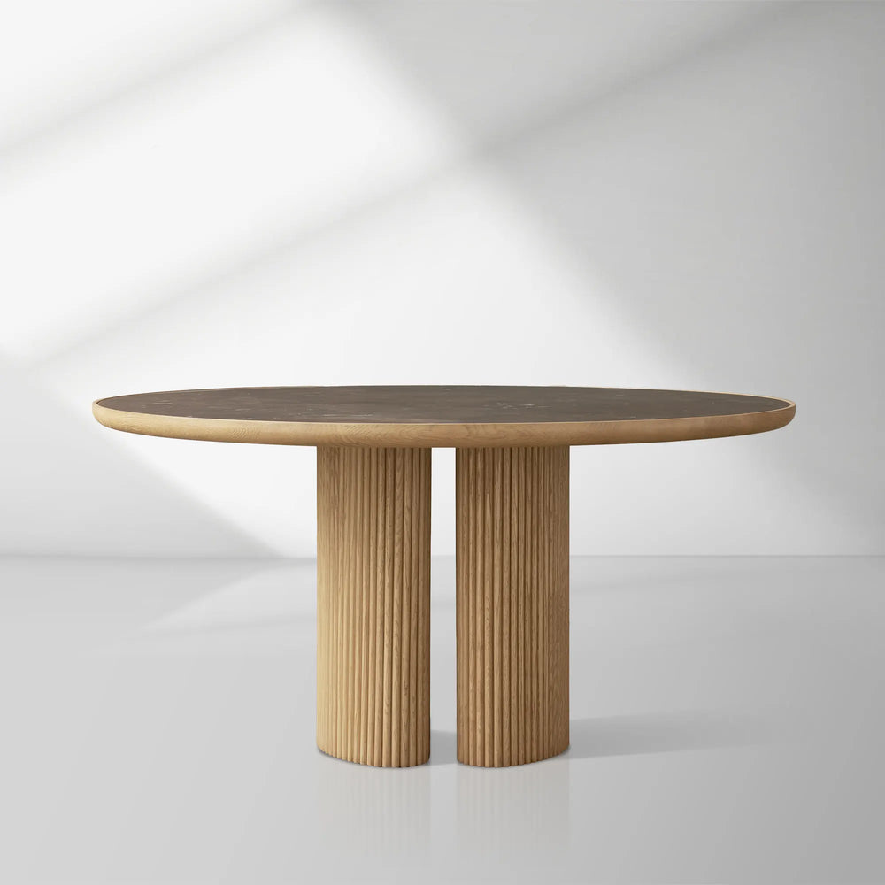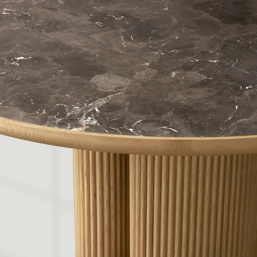 The Aster Round Dining Table blends organic elegance and artisanal woodworking into a timeless centerpiece for your dining space. Designed with gently curved solid oak slats and a beautifully inset natural marble top, this table brings together warmth, texture, and sophistication. Each piece is meticulously crafted using oak veneers and natural stone, ensuring a refined yet inviting presence.