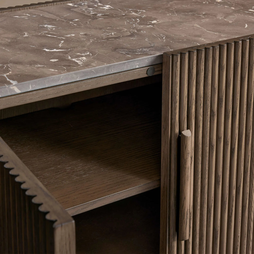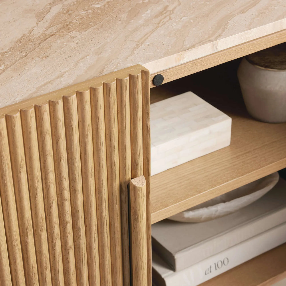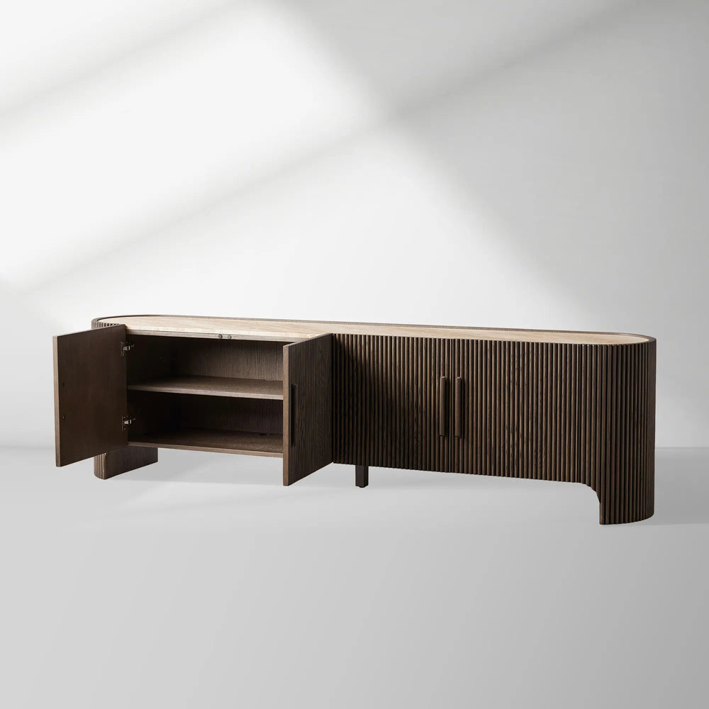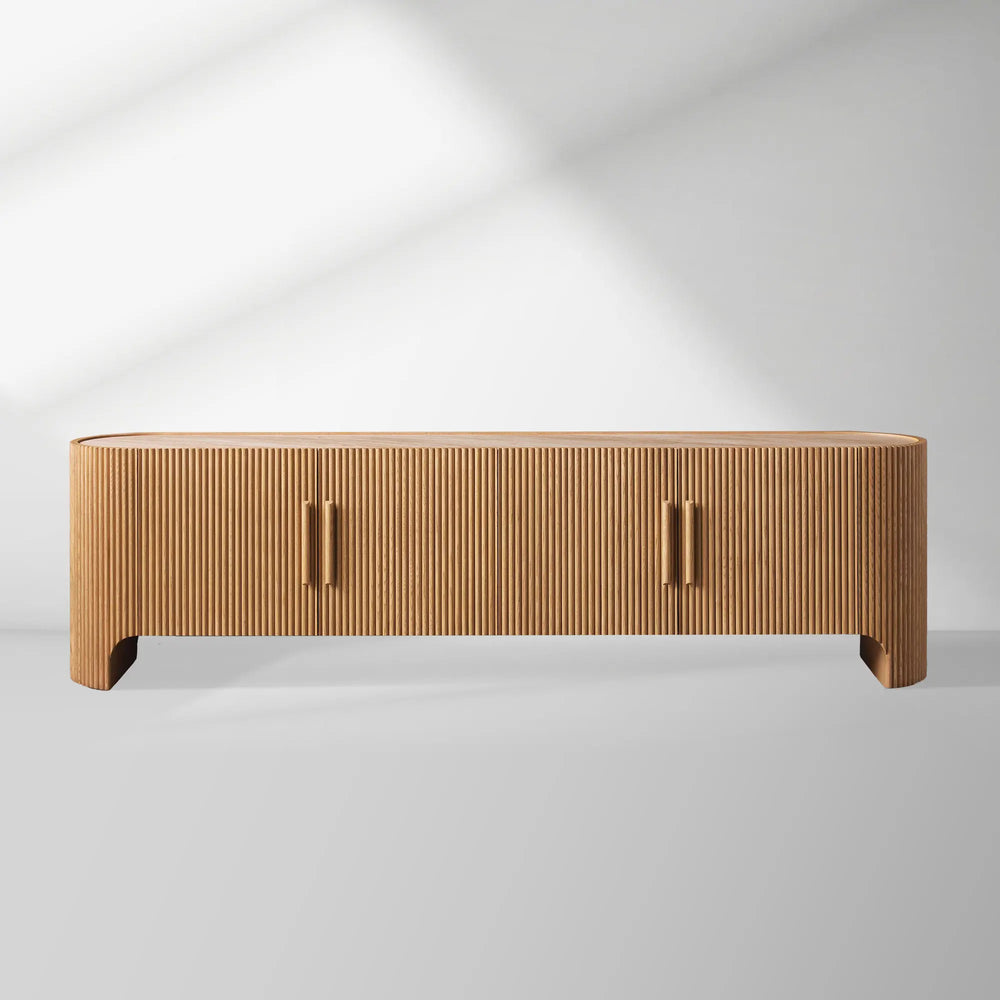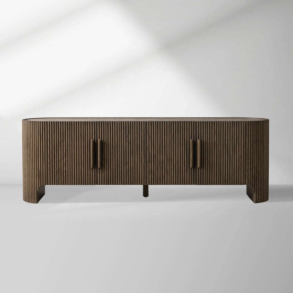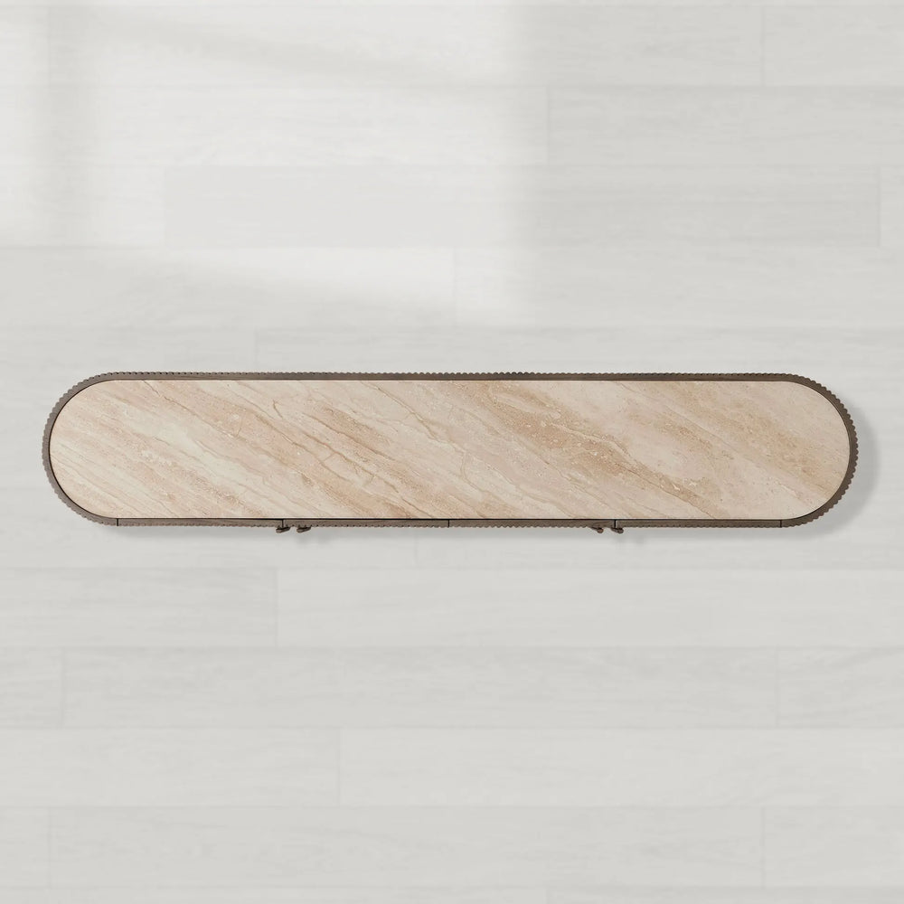 Embodying refined elegance and artisanal character, the Astor Media Console makes a lasting statement with its fluid curves, wrap-around reeded detailing, and graceful inset stone top. Designed to appear as if floating in space, this piece blends organic texture and timeless form—creating a focal point of understated luxury in any room.