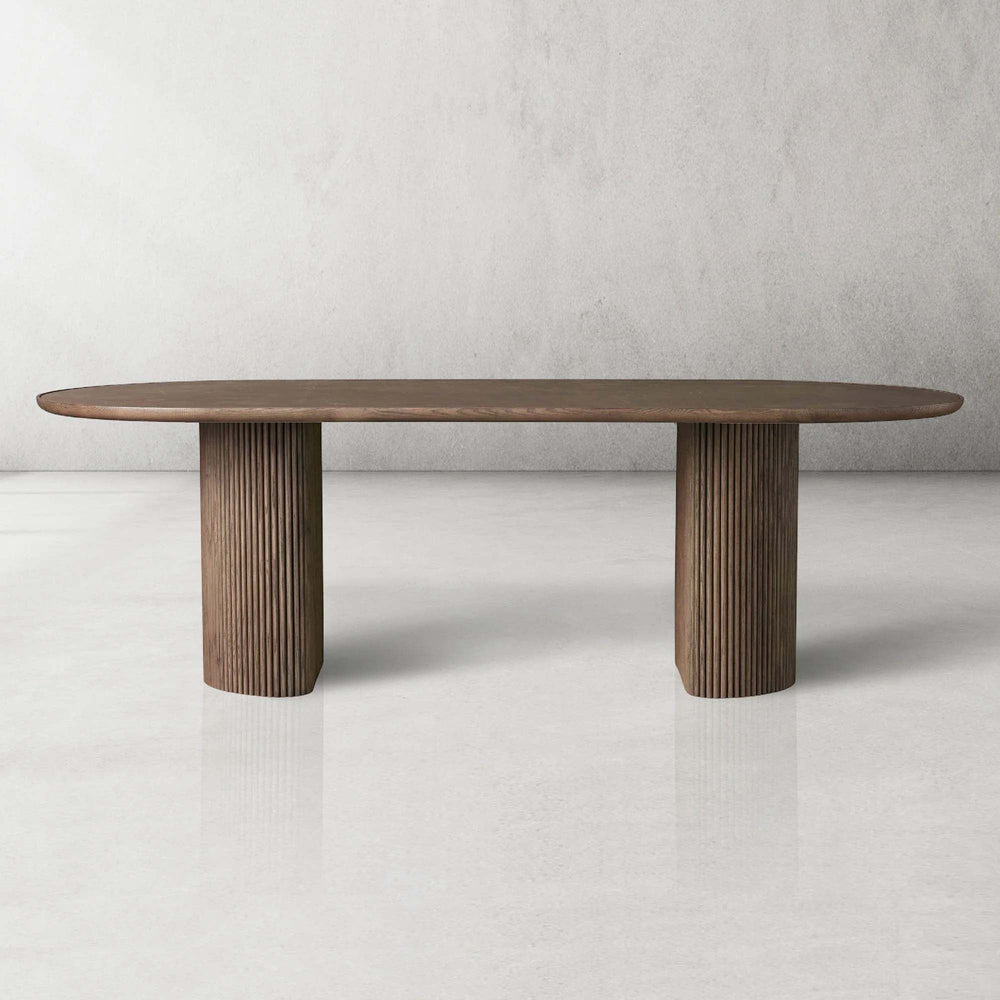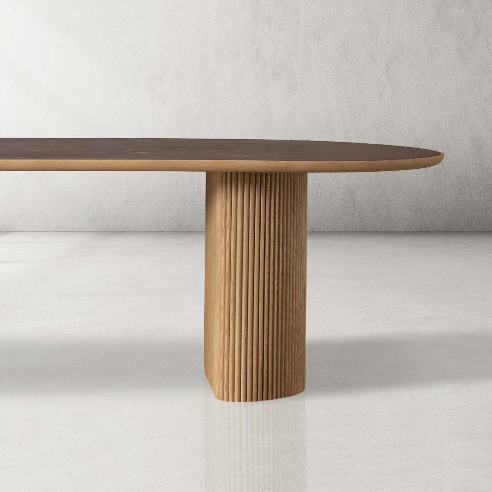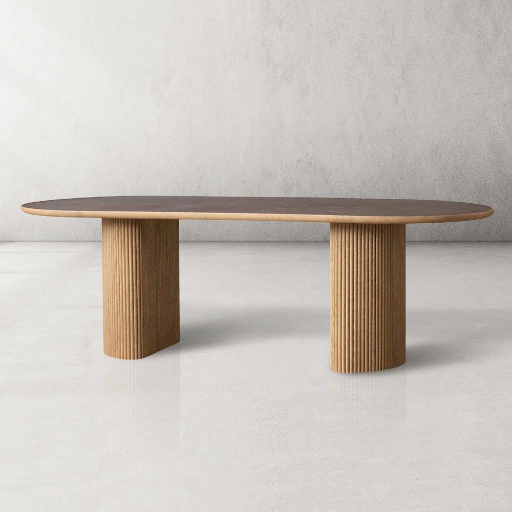 With its elegant reeded detailing and inset marble stone top, the Astor Dining Table brings timeless sophistication to your dining space. Expertly crafted from oak veneers and solid oak wood, each curve and contour is designed to create an inviting atmosphere for gatherings that linger into the evening. The natural marble inset adds a touch of organic luxury, while the artisan-crafted construction ensures no two tables are alike—each carries its own variations in grain, tone, and veining.