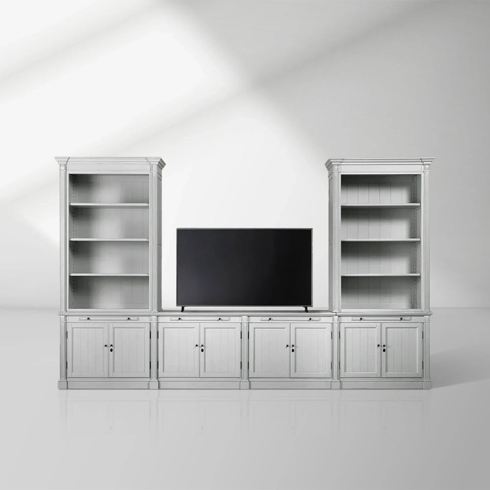 The design combines a spacious media console with flanking bookcases to create the illusion of custom-built millwork. The console offers ample space for large-screen televisions and media components, complete with cord management holes for seamless organization. Flanking bookcases provide generous display and storage space with adjustable shelving, topped with dedicated cavities (33"W x 13.5"D x 55"H) perfect for decorative items or media equipment.