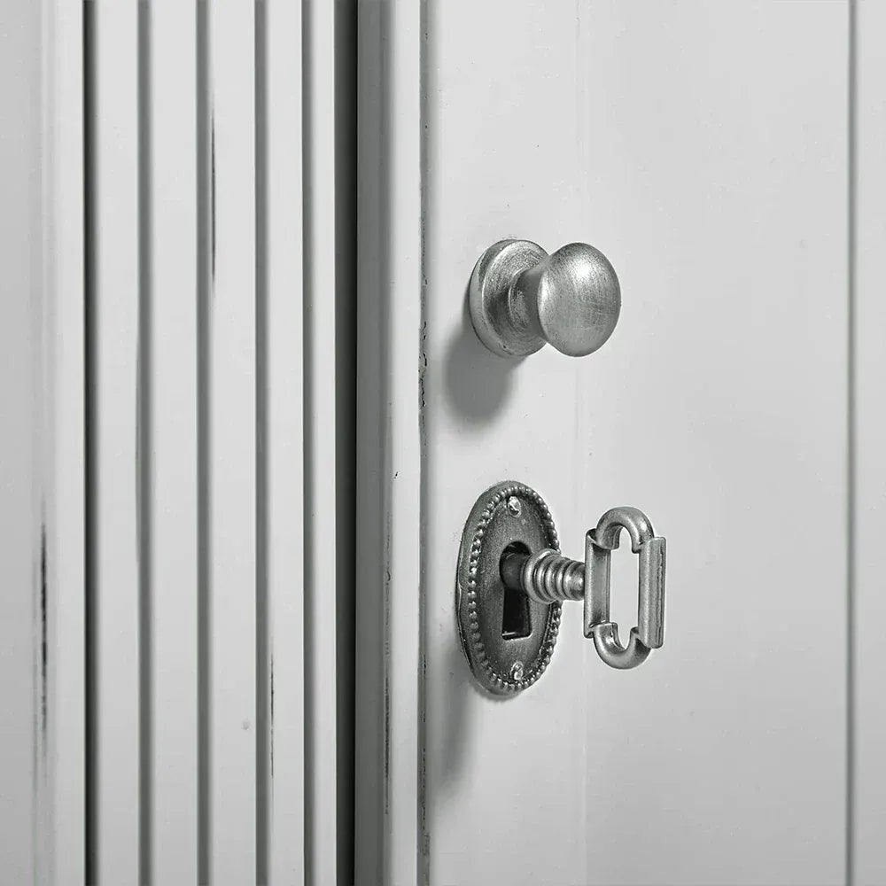 Finished in the soft, elegant "Nimbus" grey hue, each cabinet is meticulously hand-painted by skilled artisans. The surface is protected with a hand-applied soft lacquer, enhancing the wood's beauty with a delicate sheen while ensuring lasting durability. Authentic solid brass hardware with an antiqued patina provides the perfect finishing touch to this heritage-inspired design.