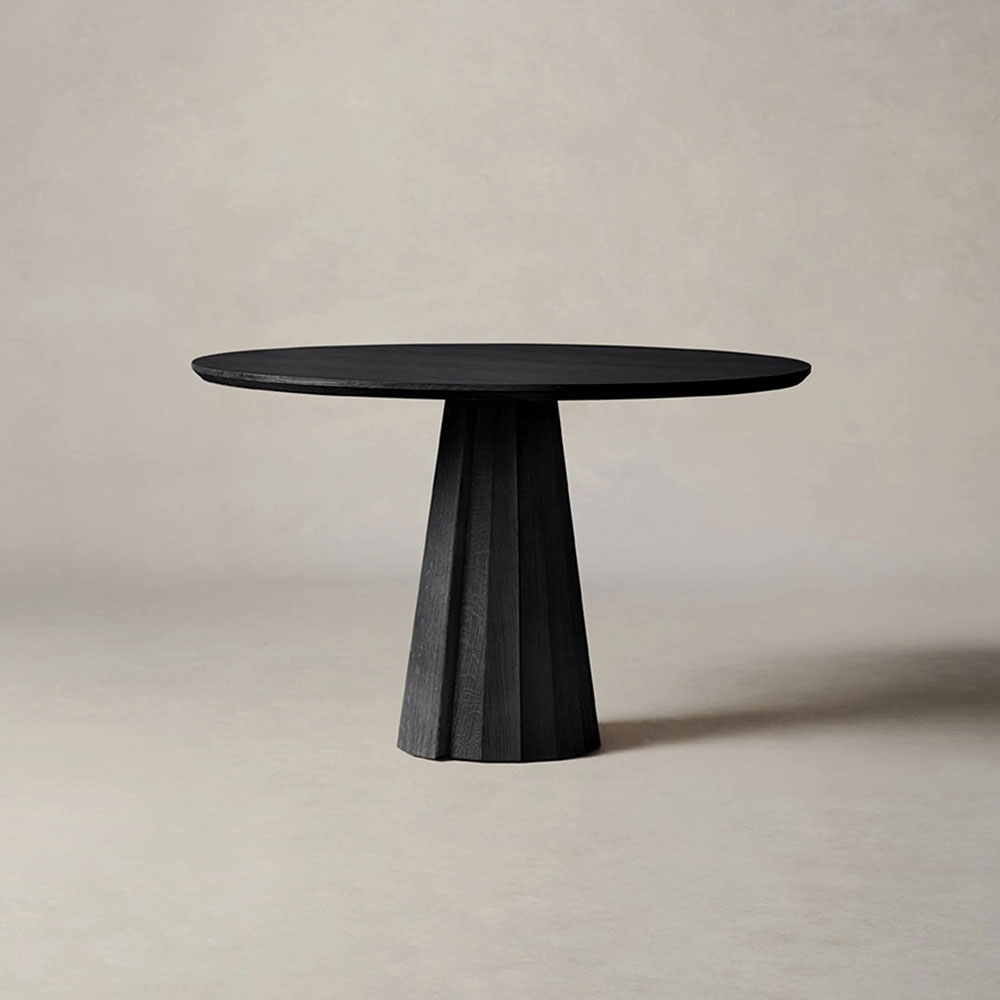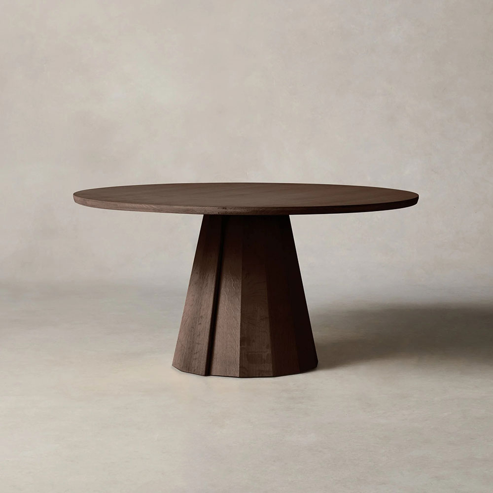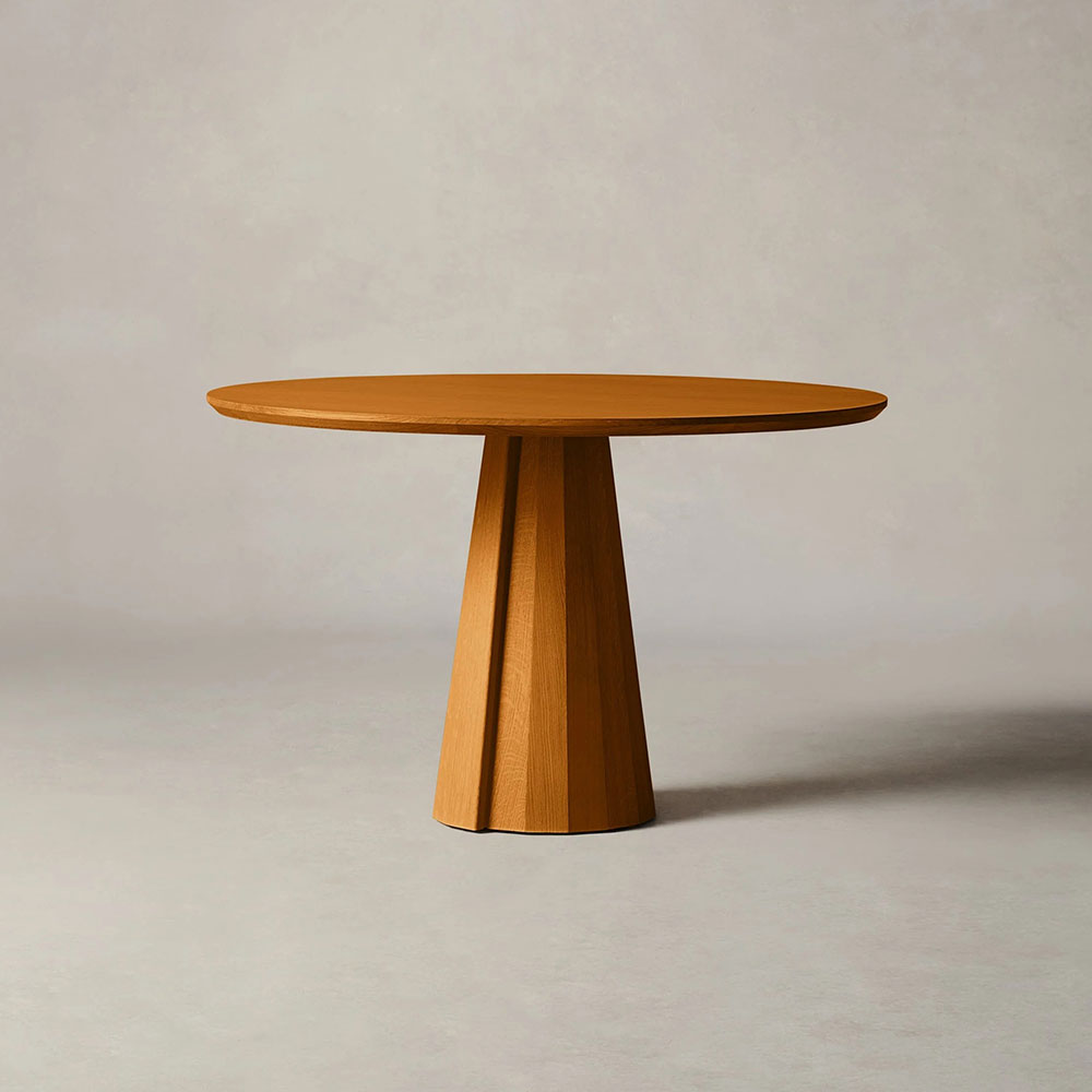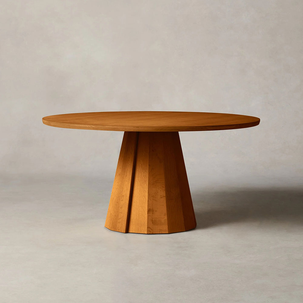 Anchor your dining space with the Brank Round Dining Table, where contemporary design harmonizes with masterful craftsmanship. This captivating table features a gracefully beveled-edge top poised atop a sculptural, multi-faceted conical base, creating an eye-catching centerpiece that blends aesthetic appeal with everyday functionality.