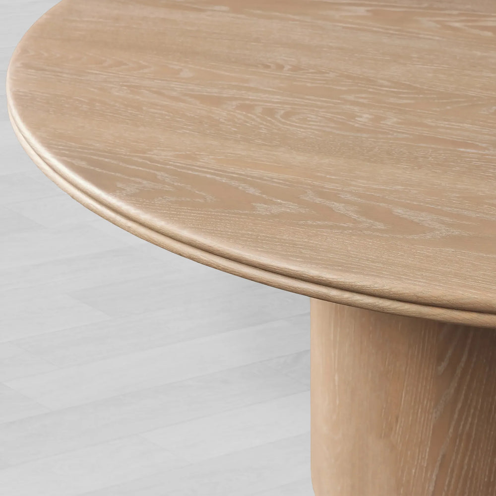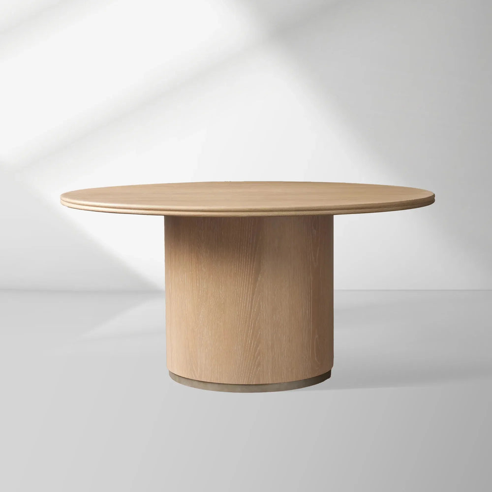 The Caden Round Dining Table offers a sophisticated union of sculptural form and artisanal warmth. Its elegantly rounded wooden top, featuring a softened double bullnose edge, is supported by a gracefully curved base anchored to an antiqued metal plinth. This design creates a stable, grounded centerpiece that blends organic beauty with a touch of industrial refinement, perfectly suited for intimate dinners and lively gatherings alike.