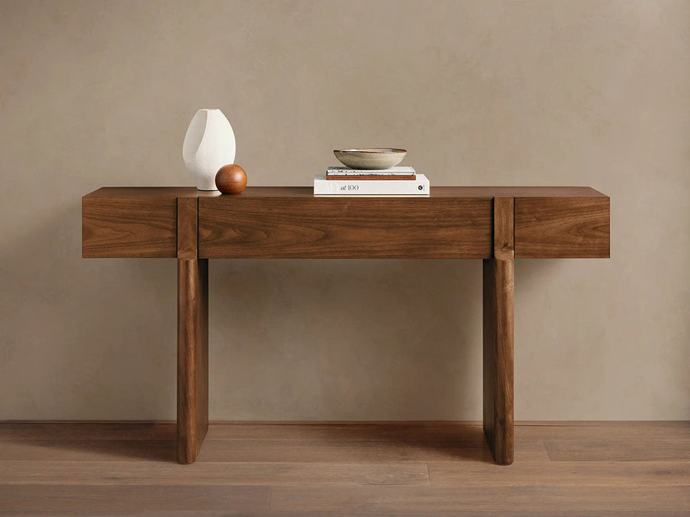 The Callan Console Table masterfully blends modern simplicity with rustic warmth through its elegant walnut construction. Featuring a slender profile and solid wood craftsmanship, this versatile piece brings understated sophistication to entryways, living rooms, and dining spaces.