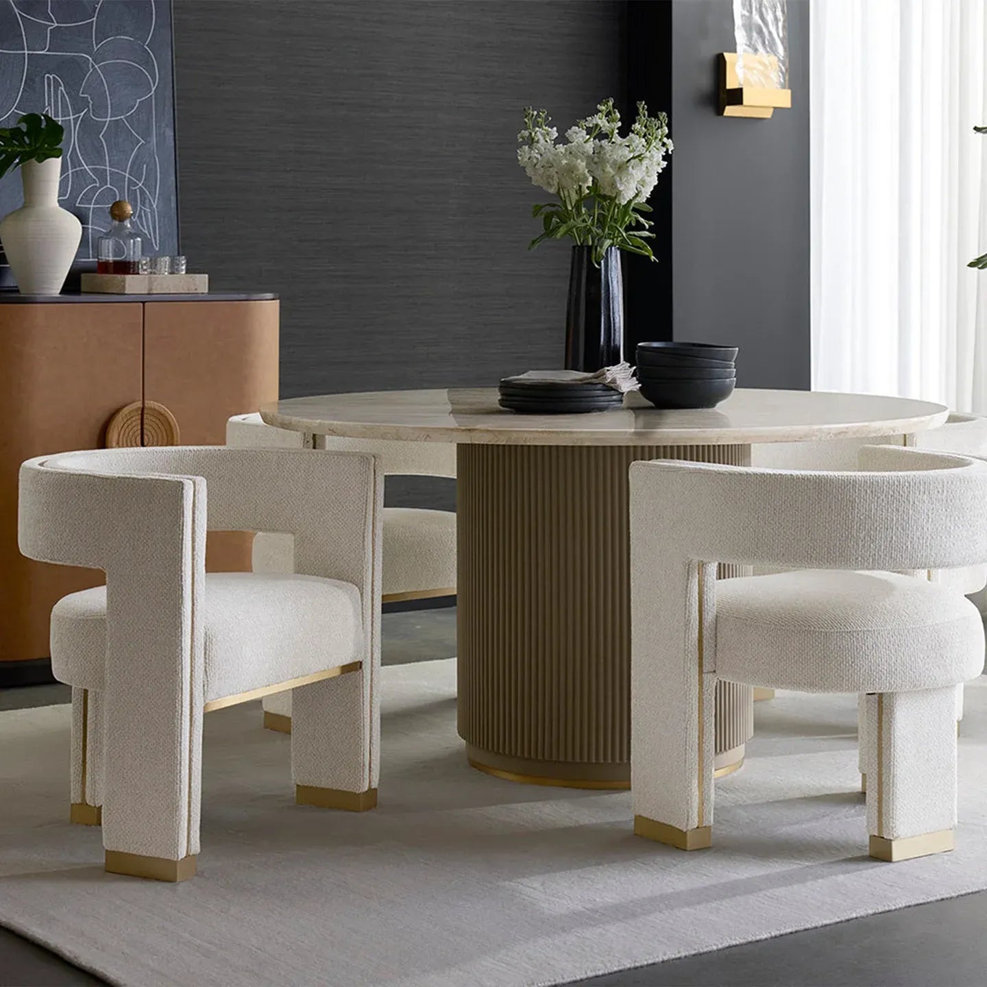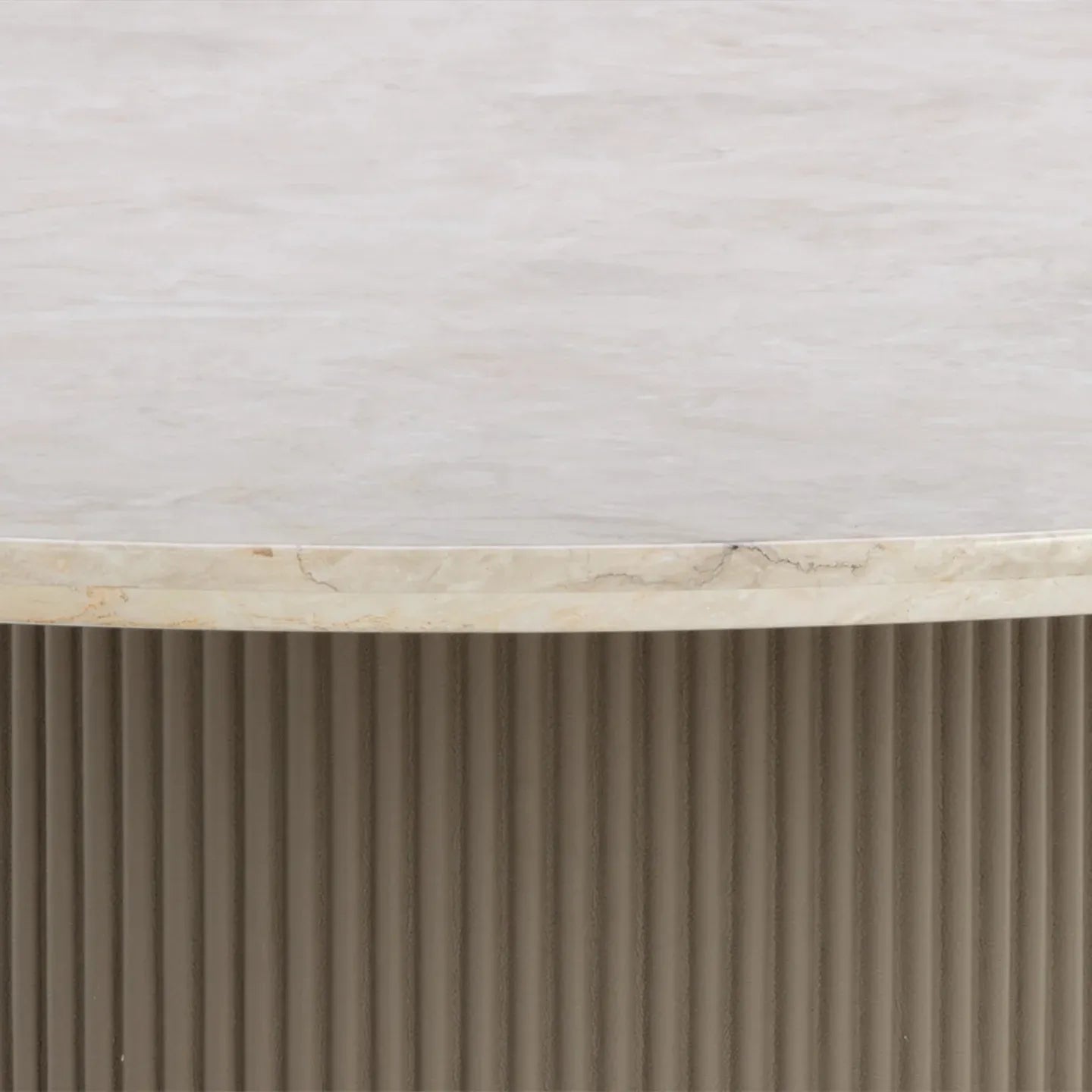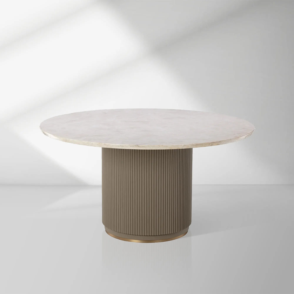Discover the Canodi Dining Table, where architectural elegance meets refined material artistry. This striking piece features a smooth polished marble top in a warm cream hue, beautifully contrasted by a textured fluted base in taupe faux leather. A delicate gold stainless steel trim elegantly finishes the base, adding a touch of metallic sophistication to this exceptional dining table.