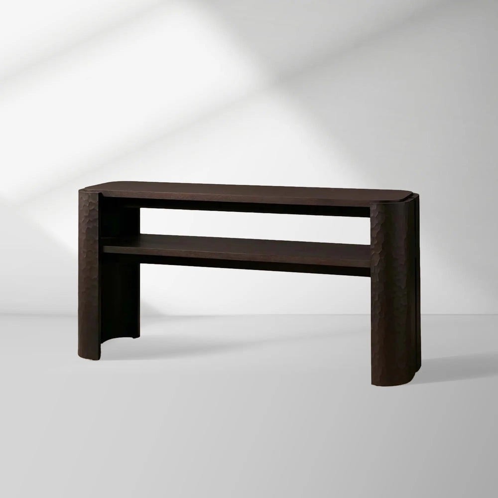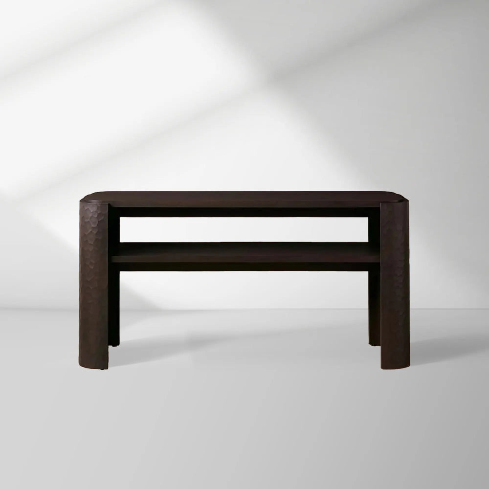 • **Sculptural Hand-Carved Legs:** Each leg is meticulously hand-carved to create a distinctive chiseled texture, flowing seamlessly around the console's corners for a unified, artistic silhouette.