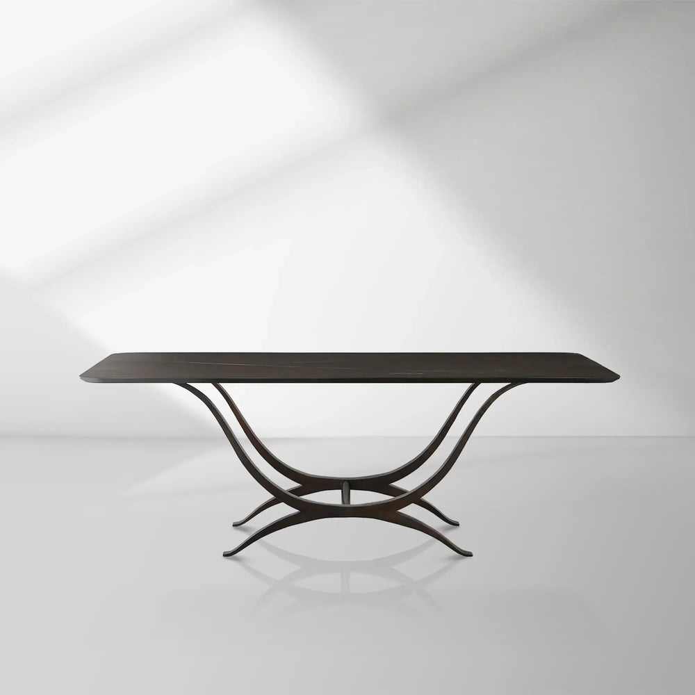The Chorda Dining Table collection draws inspiration from the elegant form of the Grecian longbow, blending classical artistry with modern functionality. Each table features a base of hand-forged iron with a faux bronze and nickel finish, exuding timeless strength and refined metallic contrast. This striking foundation supports a luxurious Italian-made porcelain stoneware tabletop, known for its exceptional durability and sophisticated appeal.