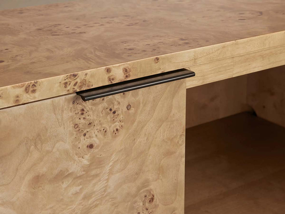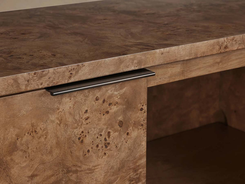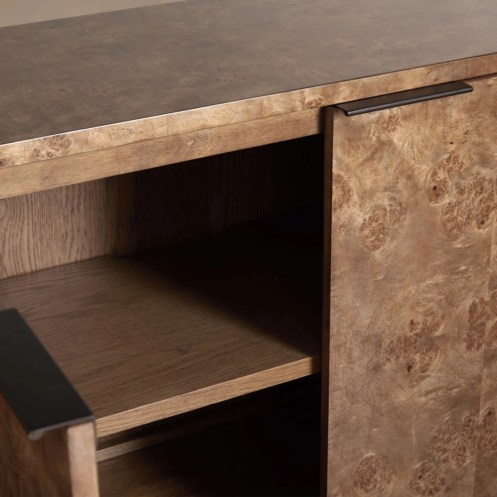 Meet the Corey Mappa Burl Wood Sideboard—a piece designed to transition effortlessly from accent décor to a stunning focal point in any room. Crafted with swirling mappa burl wood panels, book-matched across all four surfaces for a continuous, mesmerizing visual effect, this sideboard brings texture and organic elegance to modern interiors. Each piece is hand-finished in your choice of warm honey or rich brown tones, enhancing the natural depth and movement of the wood grain.