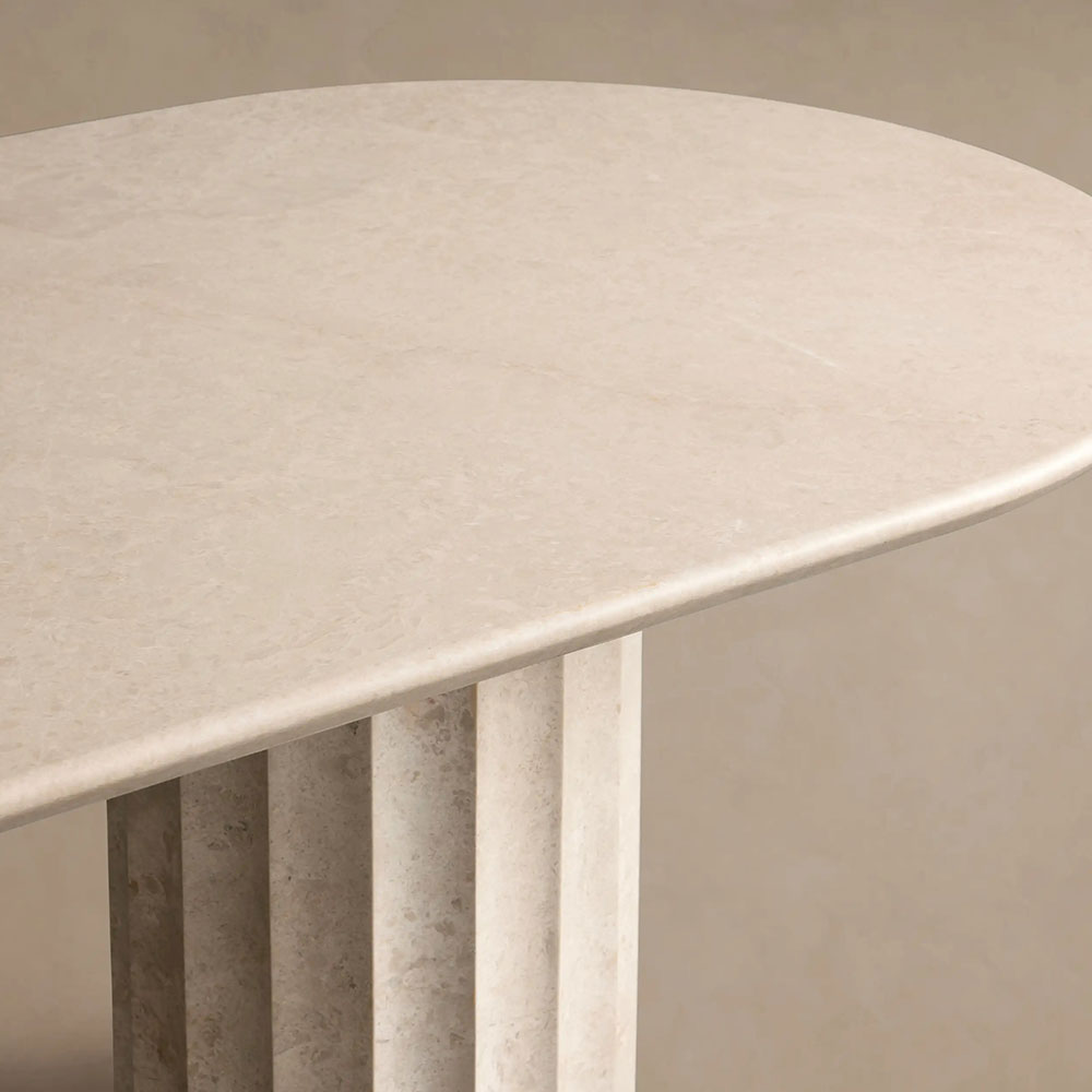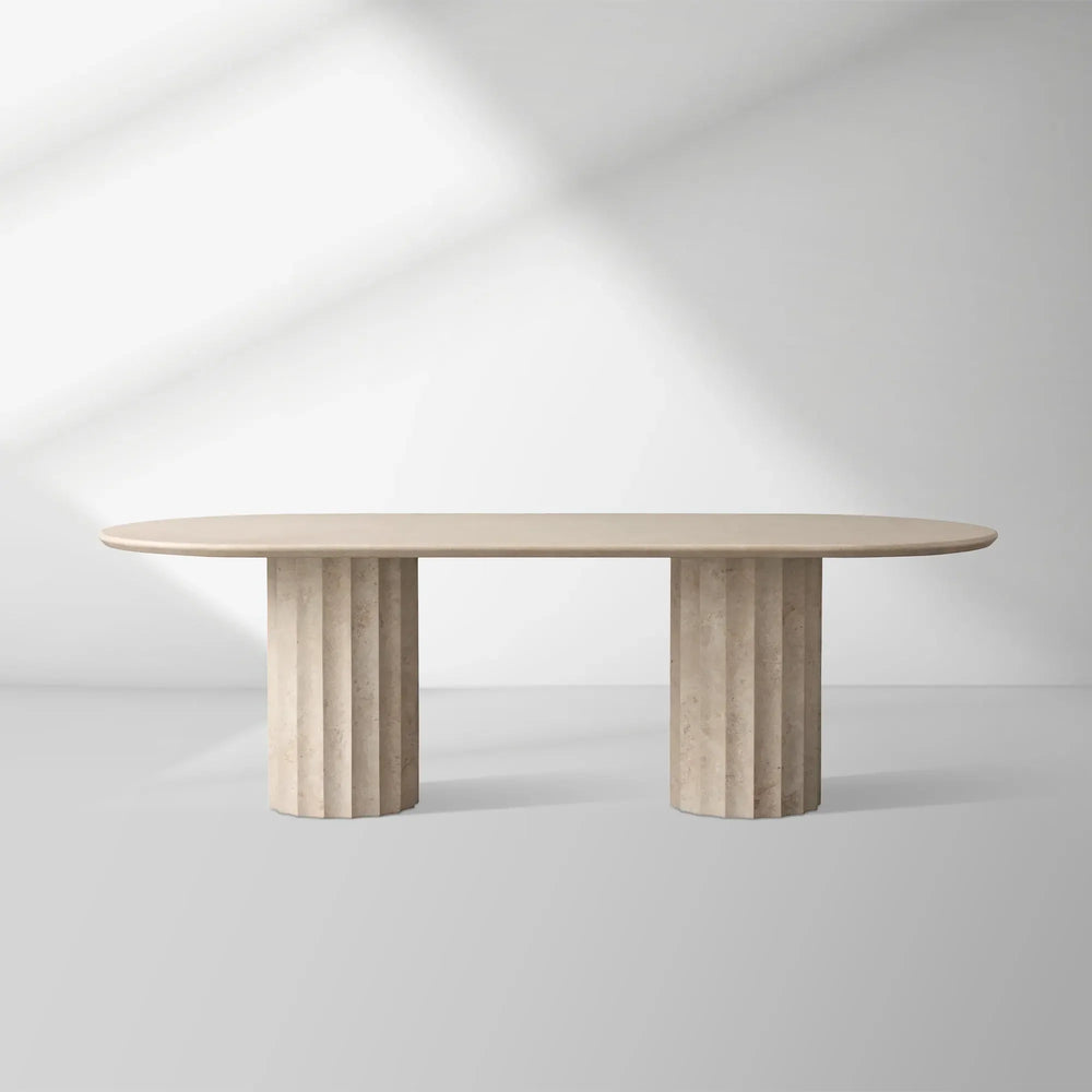 Blending classical inspiration with contemporary sophistication, the Danae Stone Dining Table reinterprets timeless Roman architectural elegance in a modern dining space. Designed with stately pedestal bases reminiscent of ancient columns and gracefully curved marble tabletops, this collection creates a striking yet stable focal point perfect for both everyday meals and elevated entertaining.