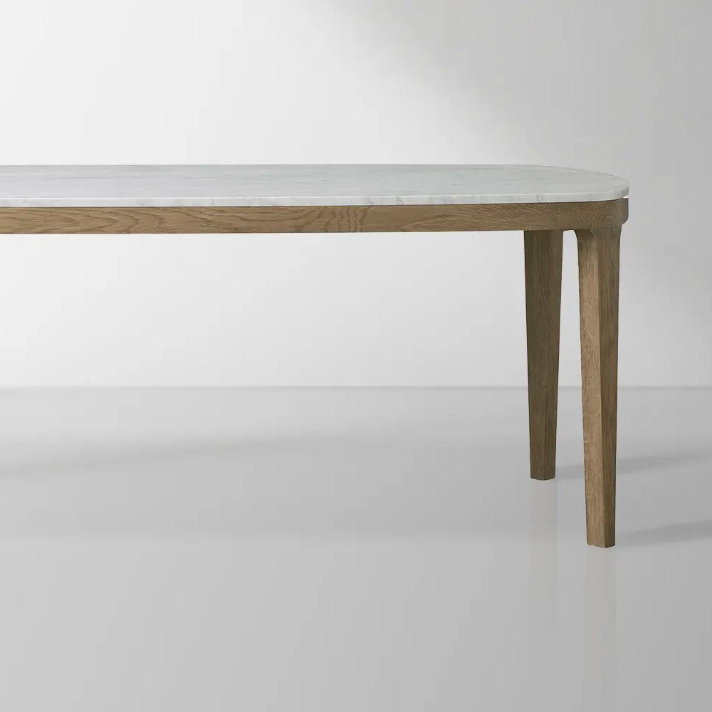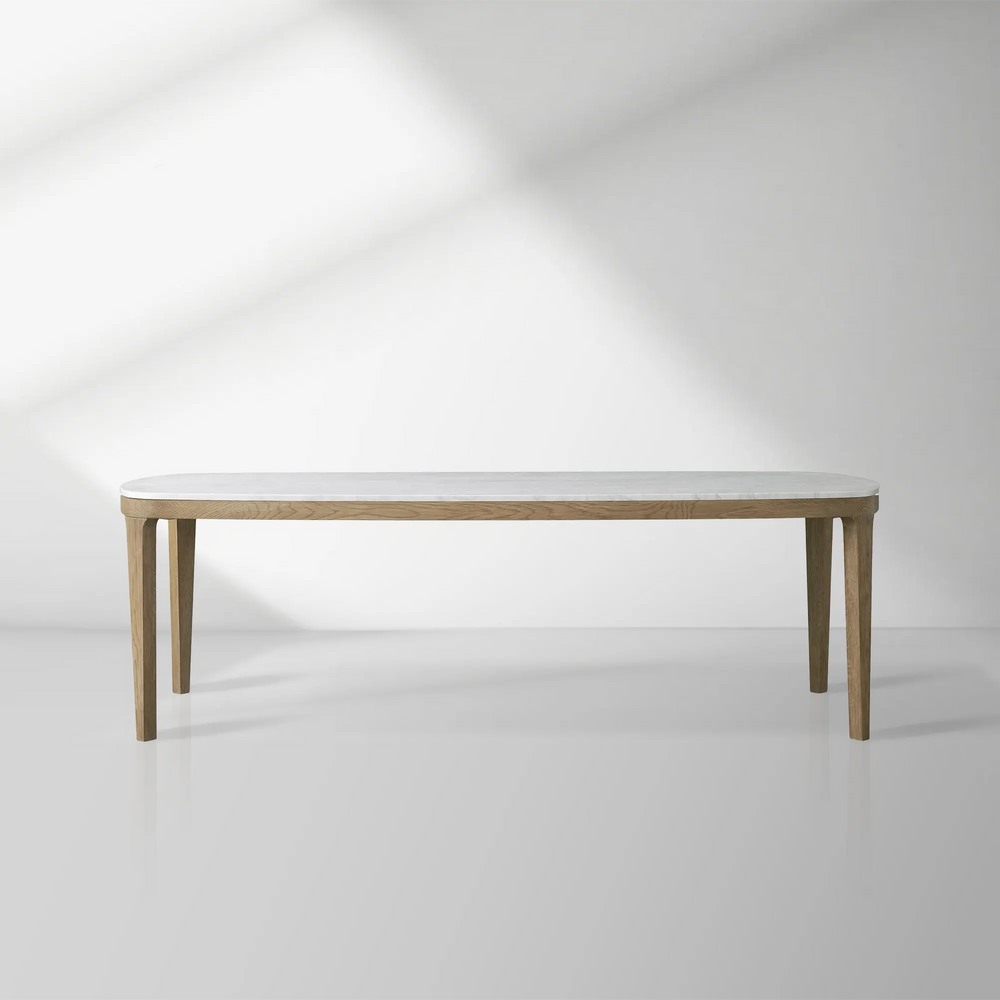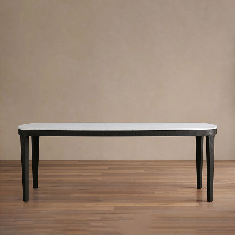 Designed for both everyday living and elegant entertaining, the Danny Dining Table effortlessly combines relaxed style with refined materials. Its softly rounded silhouette is crafted from solid oak wood, available in a hand-applied ebony or fawn finish, and paired beautifully with your choice of a white Carrara or earth-toned Royal Cream marble top.