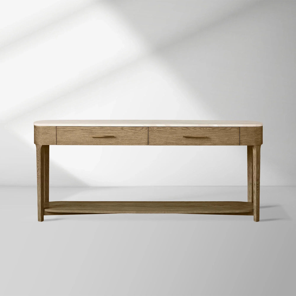 The Danny Console Table artfully combines the warm character of solid oak with the luxurious appeal of natural marble. Featuring gracefully curved legs and elegant brass drawer pulls, this piece brings a refined yet inviting presence to any living space, entryway, or dining area.