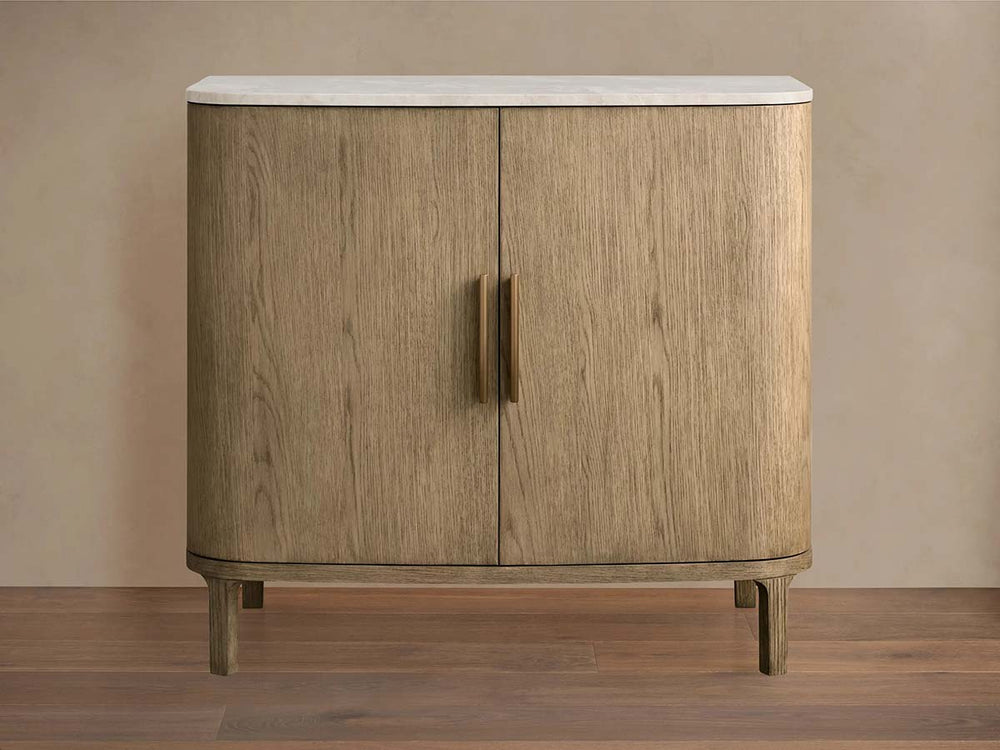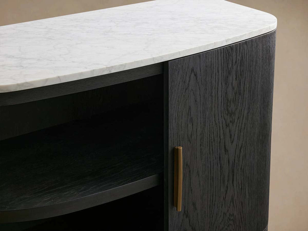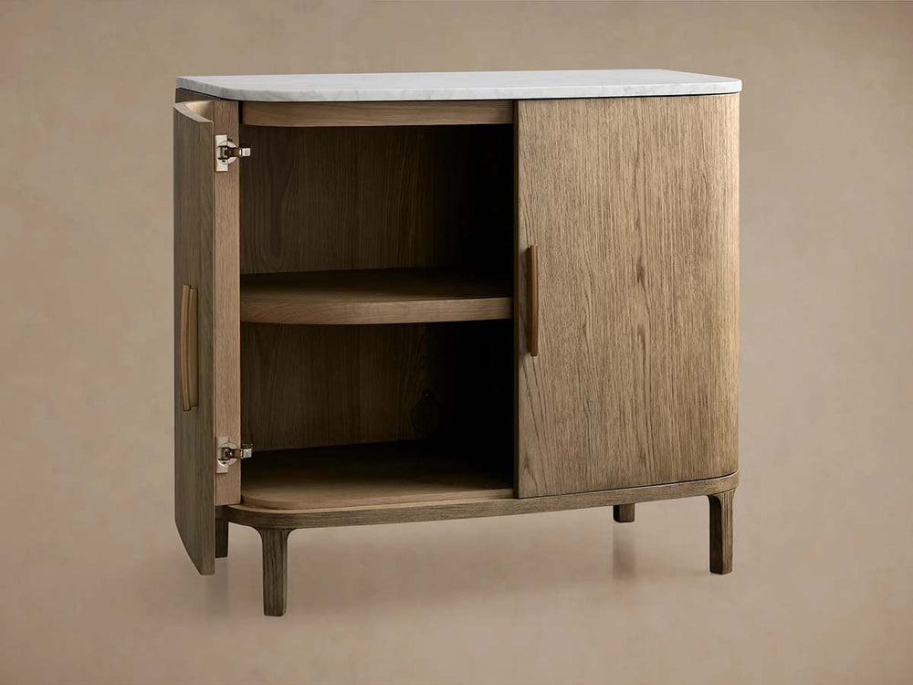 The cabinet is available in two hand-applied wood finishes—rich Ebony or soft Fawn—each enhancing the oak's natural grain. Its marble top options include classic white Carrara or earthy Royal Cream, both protected with a clear lacquer that accentuates the stone's unique veining and character. Inside, one adjustable and removable shelf offers flexible storage for dining essentials, office supplies, or decorative objects.