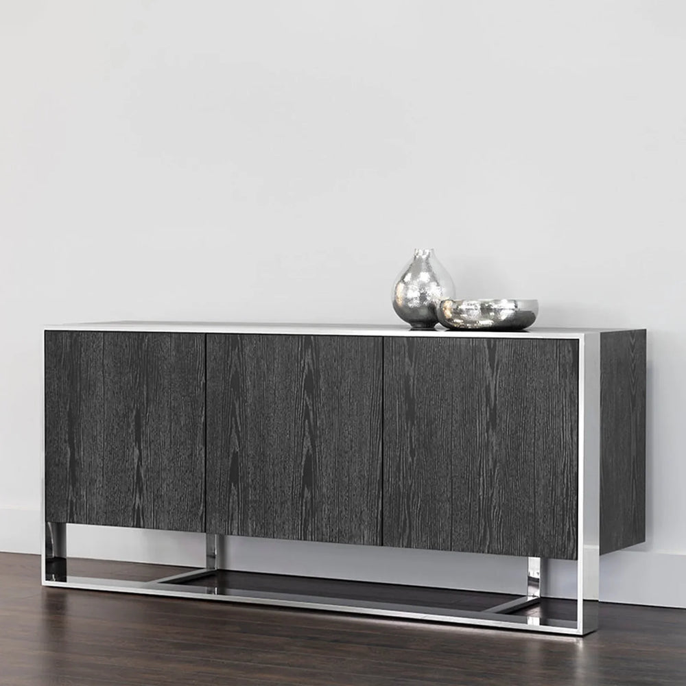 Embodying clean, contemporary elegance, the Dolton Sideboard combines rich German oak wood veneer in a sophisticated dark grey finish with a sleek polished stainless steel frame. Each piece showcases unique wood grain patterns, natural knots, and organic texture variations—celebrating the authentic character of solid oak. With three spacious storage compartments, this sideboard offers both functional organization and striking visual appeal.