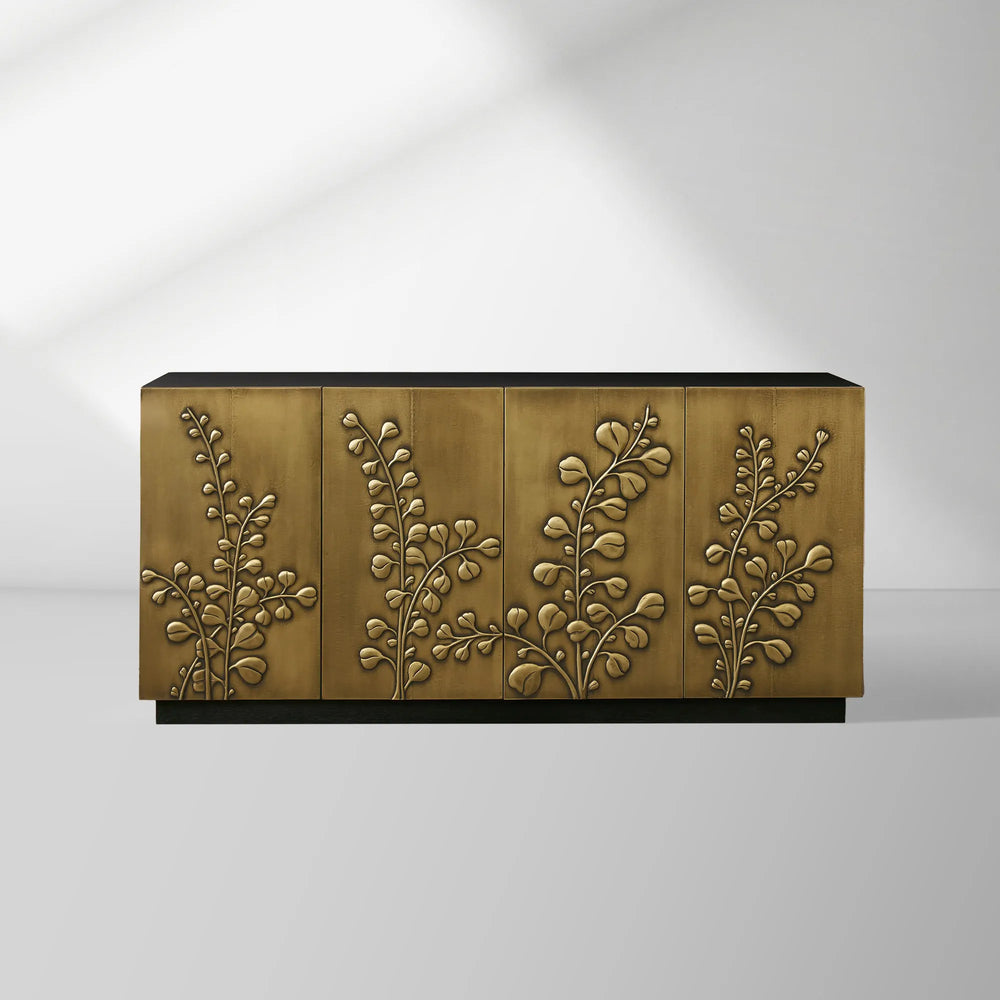 Meticulously crafted, the sideboard features four panels of solid brass, individually carved with unique floral designs before being sealed for lasting beauty. The top is crafted from oak veneer finished in a deep ebony tone, providing a striking backdrop for the metallic artistry below.