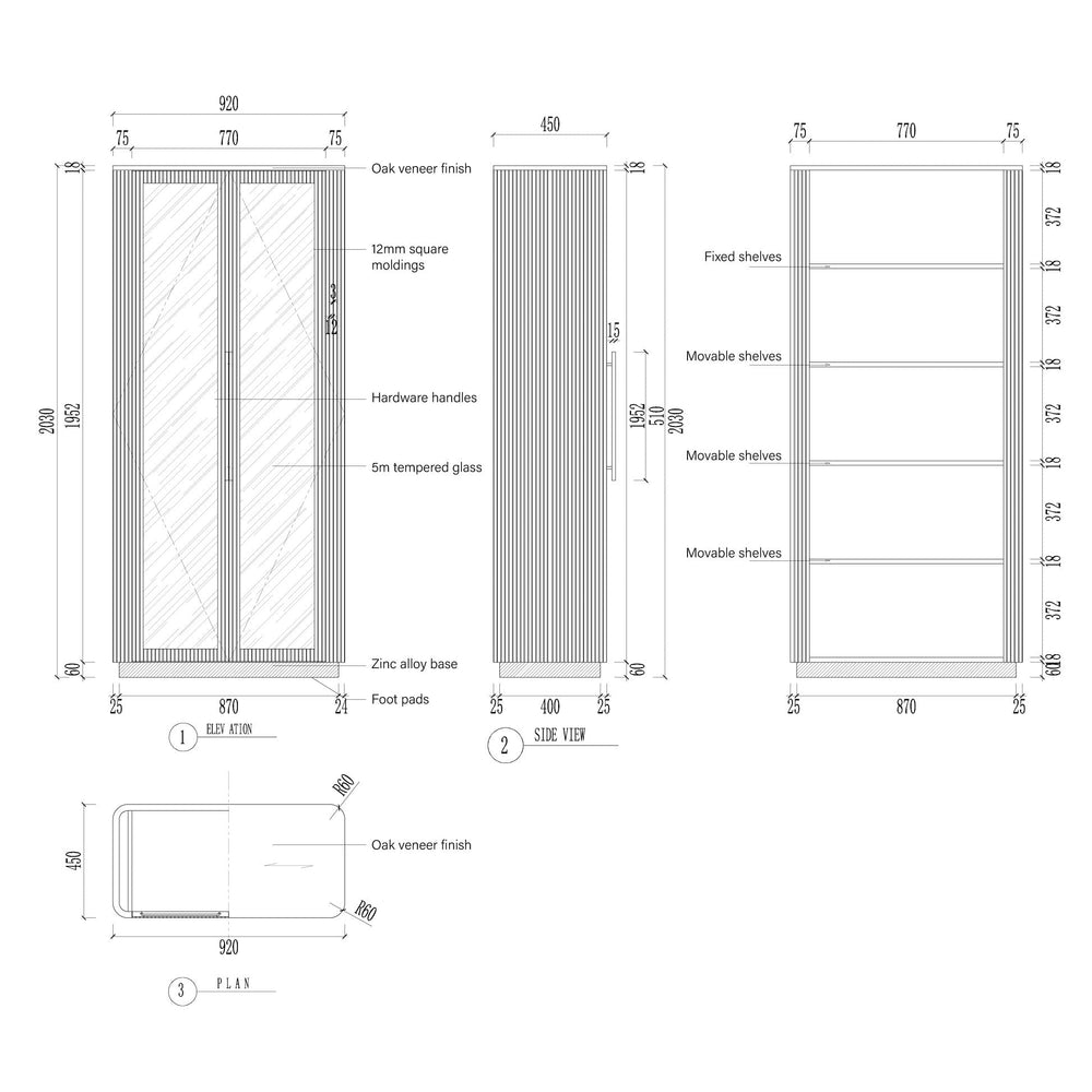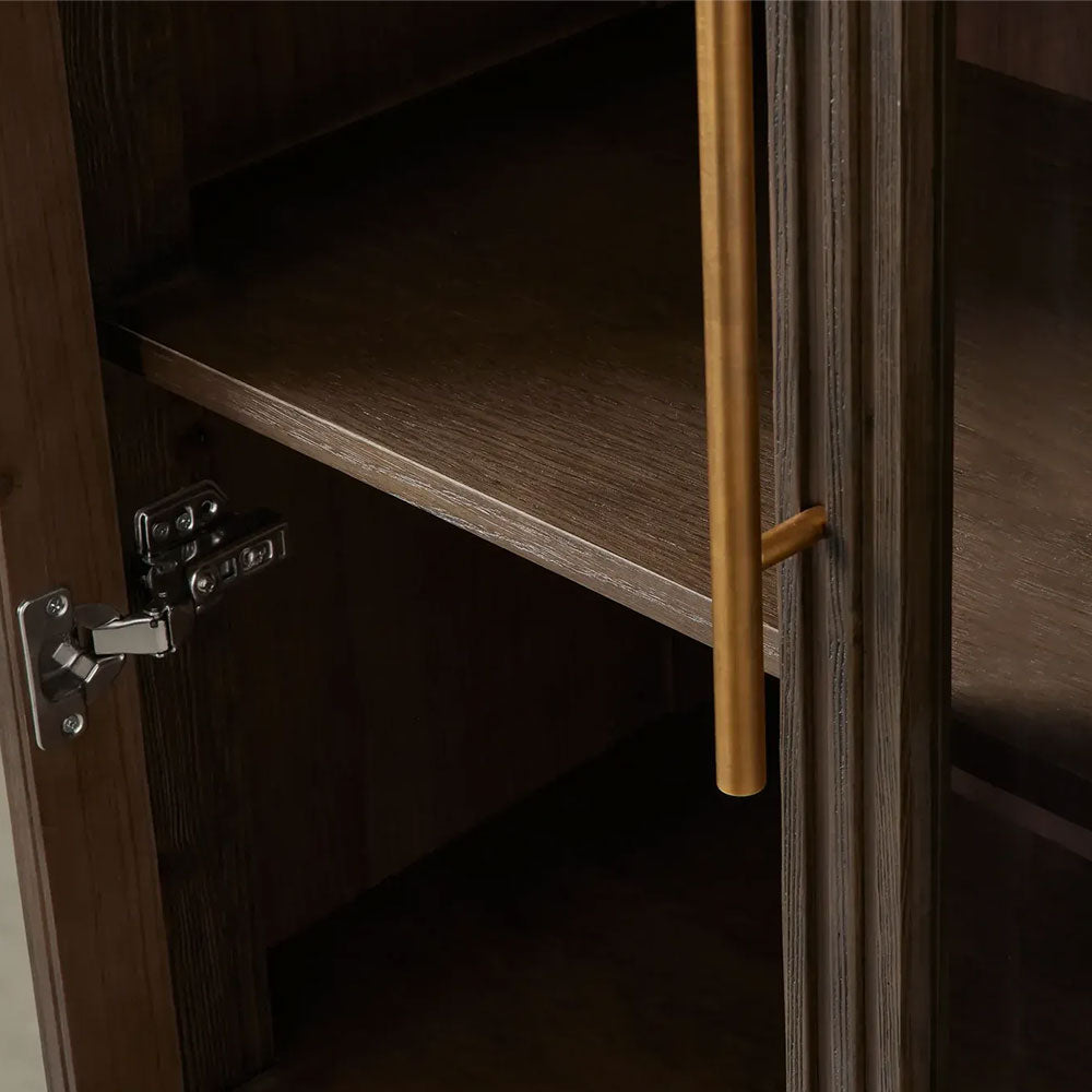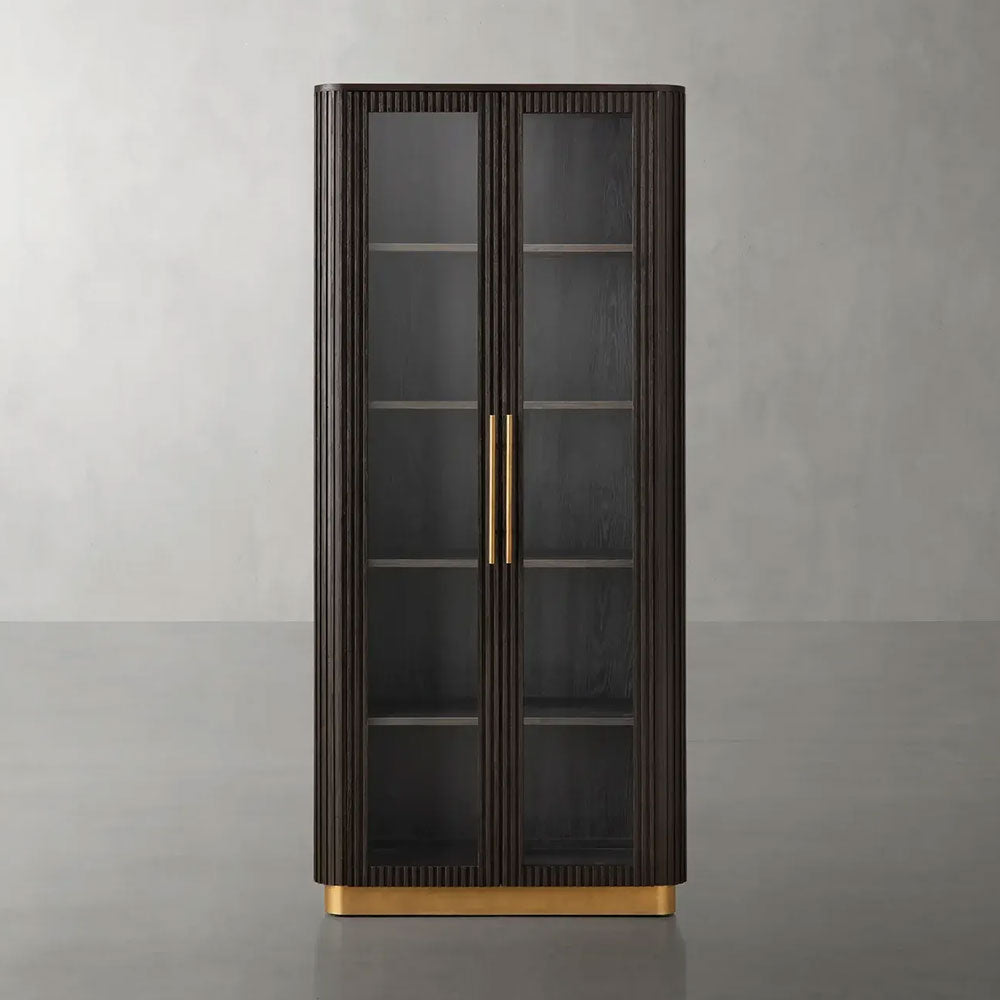 Crafted from sustainably sourced European White Oak or Finnish Pine, its structure is highlighted by sophisticated reeded oak detailing. The full-length tempered glass doors offer a clear view of the interior, which features four adjustable and removable shelves for ultimate customization. The entire piece is hand-finished with a protective lacquer, enhancing the wood's natural grain with a subtle sheen. Choose from a range of modern base finishes—Liath Smoke, Ebony, Honey, or Mocha—to match your décor.