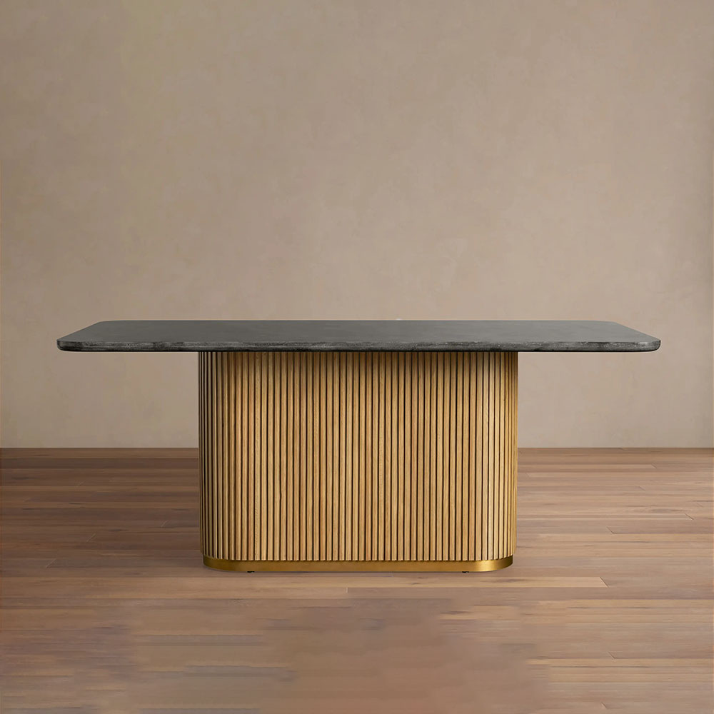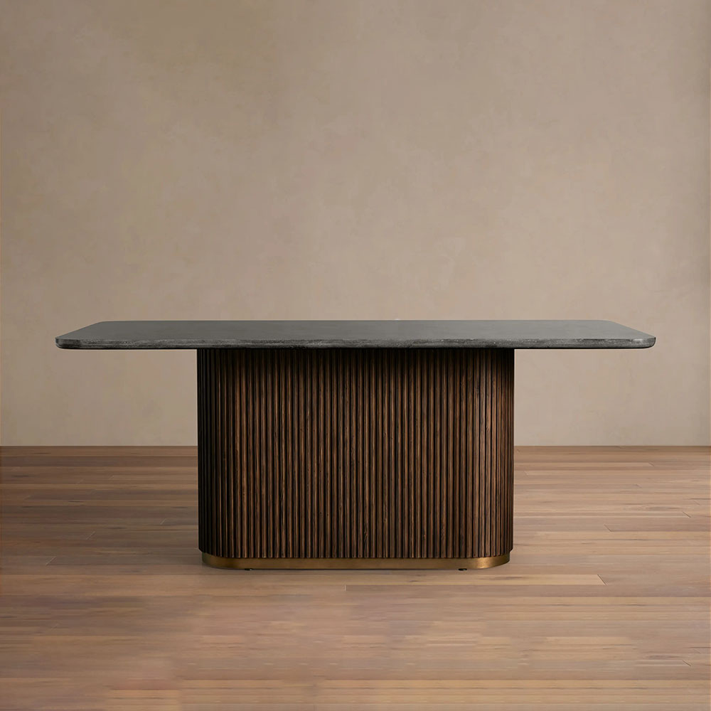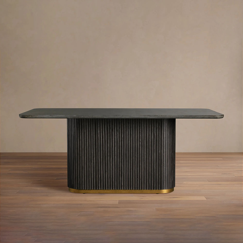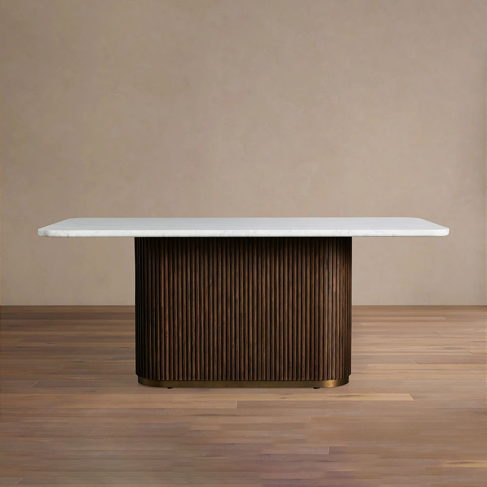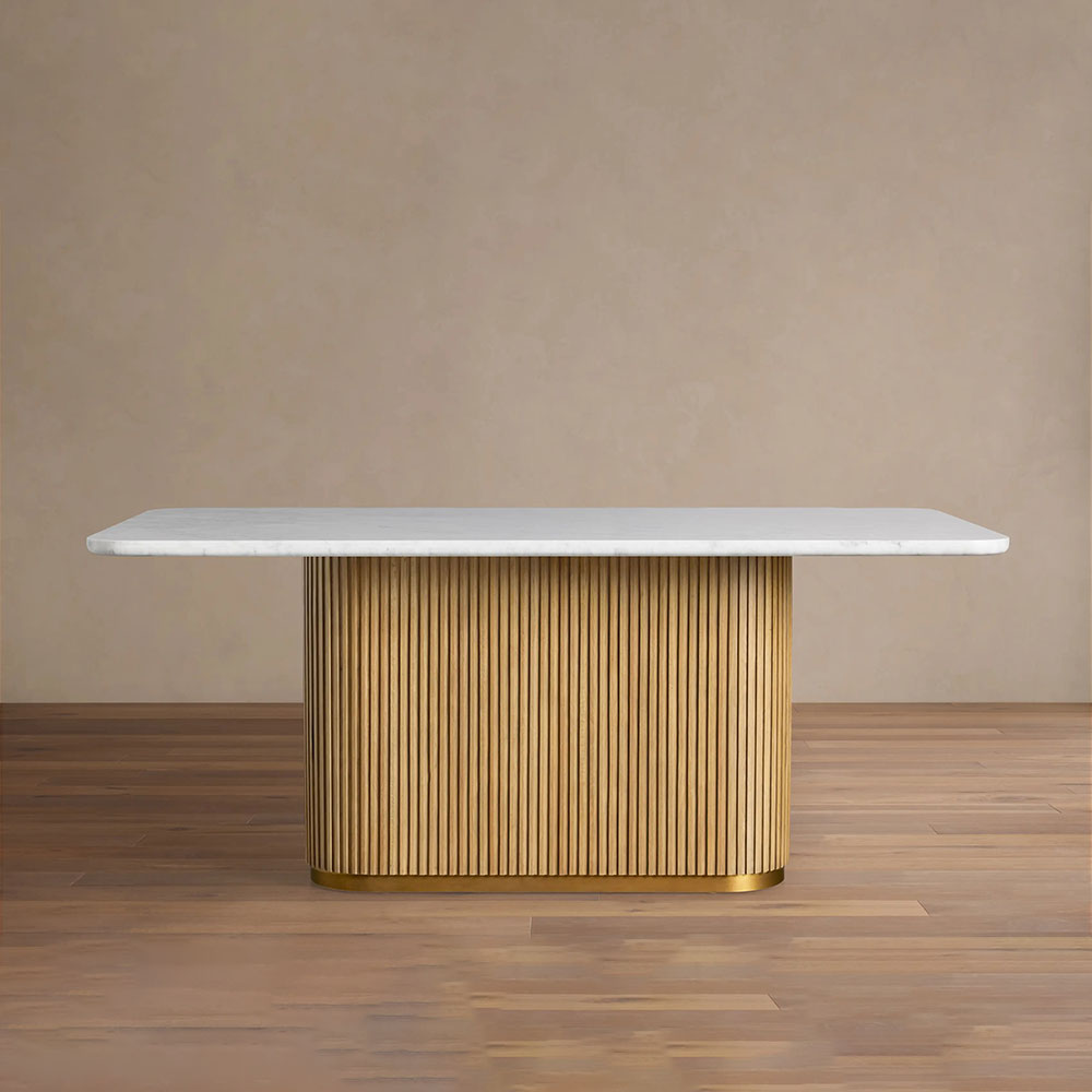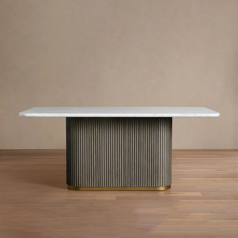 Elevate your dining experience with the Finnley Dining Table, a masterful blend of natural materials and artisan craftsmanship. This stunning piece features a luxurious stone top in Carrara marble or bluestone, elegantly supported by a hand-finished pine frame with sophisticated reeded oak detailing. The zinc-alloy plinth bases in a light brass finish complete the sophisticated aesthetic, creating a table that serves as the perfect centerpiece for any dining space.