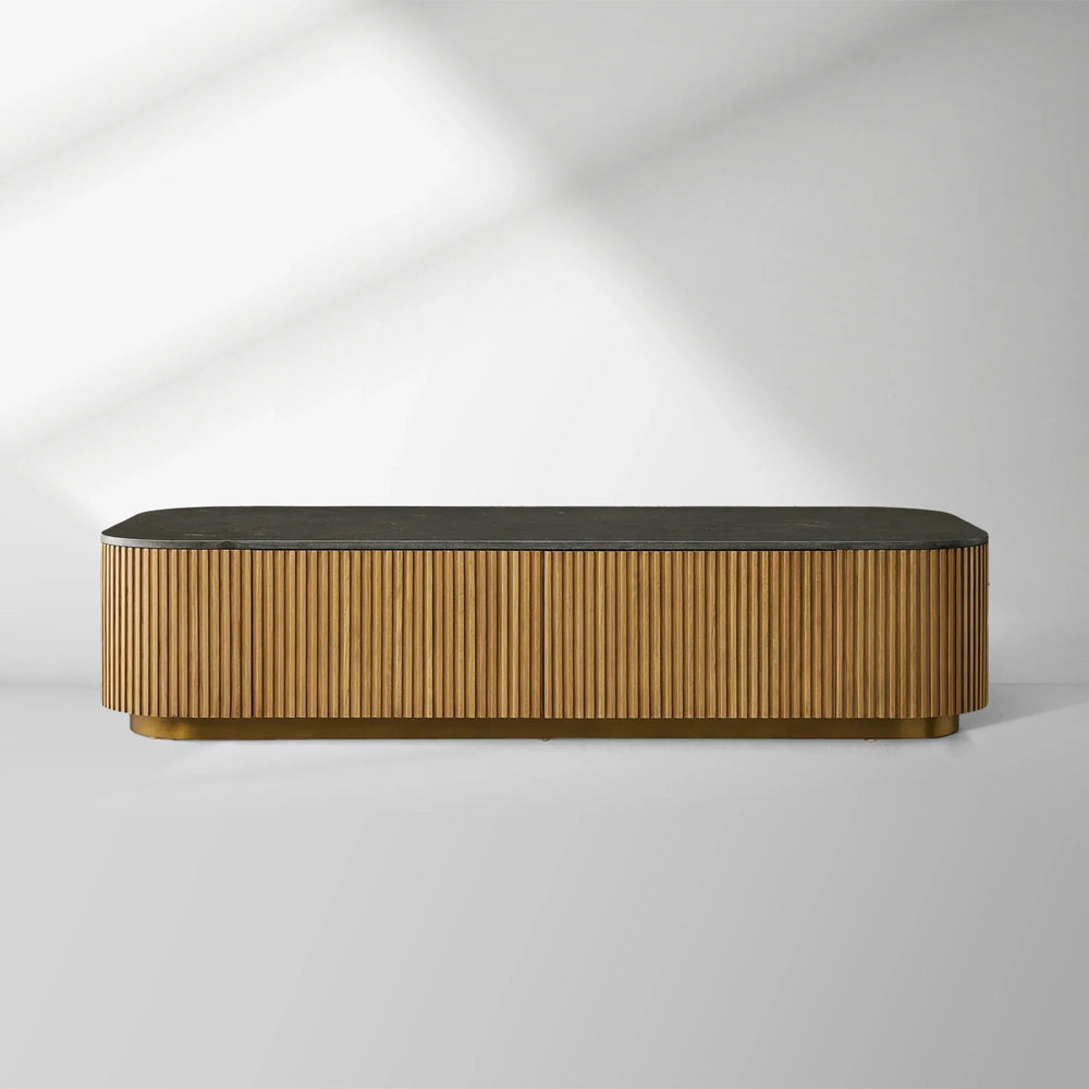 The Finnley Storage Coffee Table artfully blends natural materials and refined detailing to create a functional yet striking centerpiece for your living space. Crafted from hand‑finished Finnish pine or white oak, this table features an elegant stone top, a slender brass‑finished plinth base, and delicate reeded wood accents that together evoke a look of modern sophistication with organic warmth.