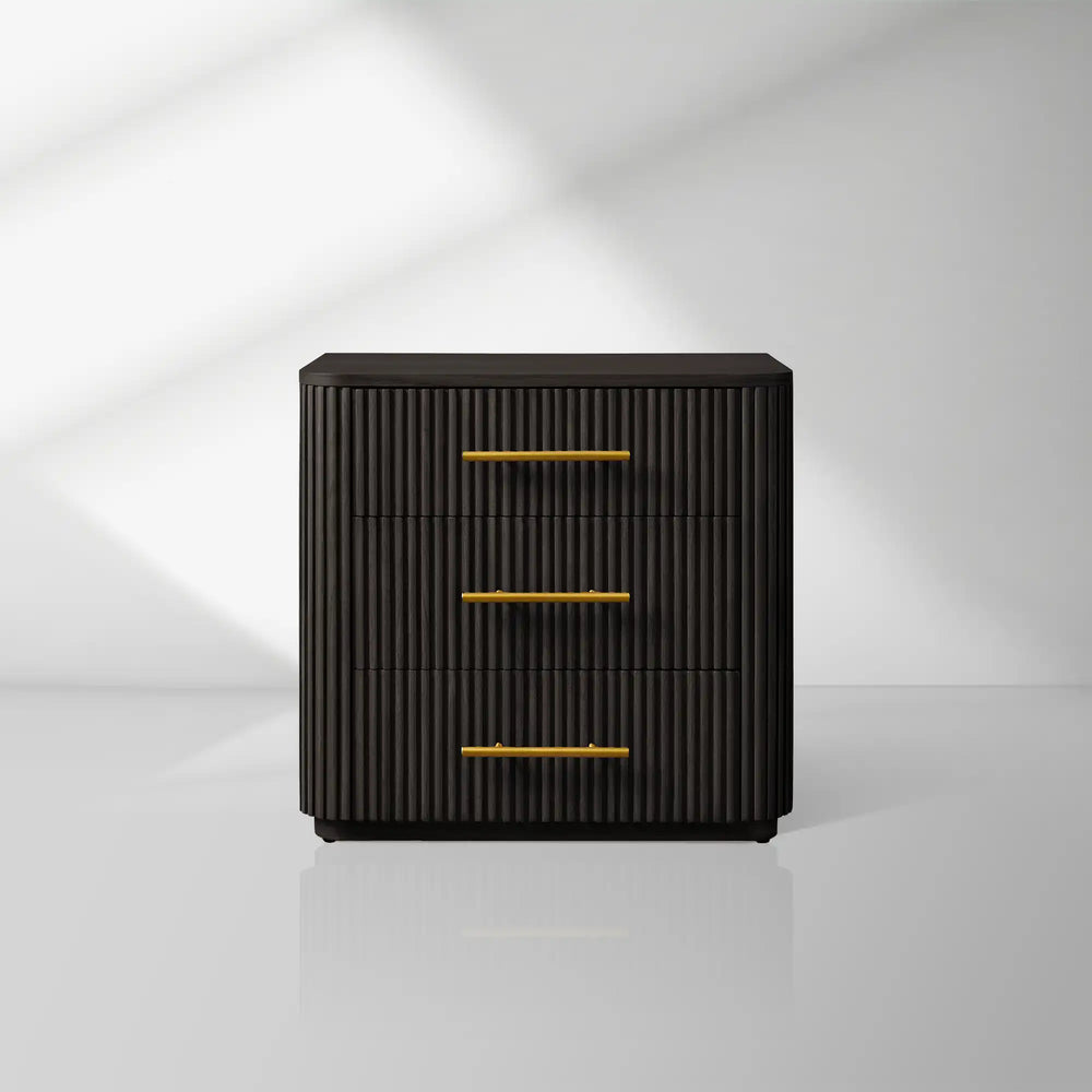 The Finnley Wood Nightstand combines artisanal craftsmanship with functional elegance to enhance your bedroom space. Featuring the collection's signature reeded design, this nightstand is expertly crafted from hand-finished Finnish pine with oak veneers in a rich Ebony finish. The warm wood tones are beautifully complemented by brass-finished zinc-alloy hardware, creating a sophisticated yet inviting aesthetic.