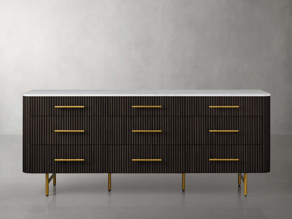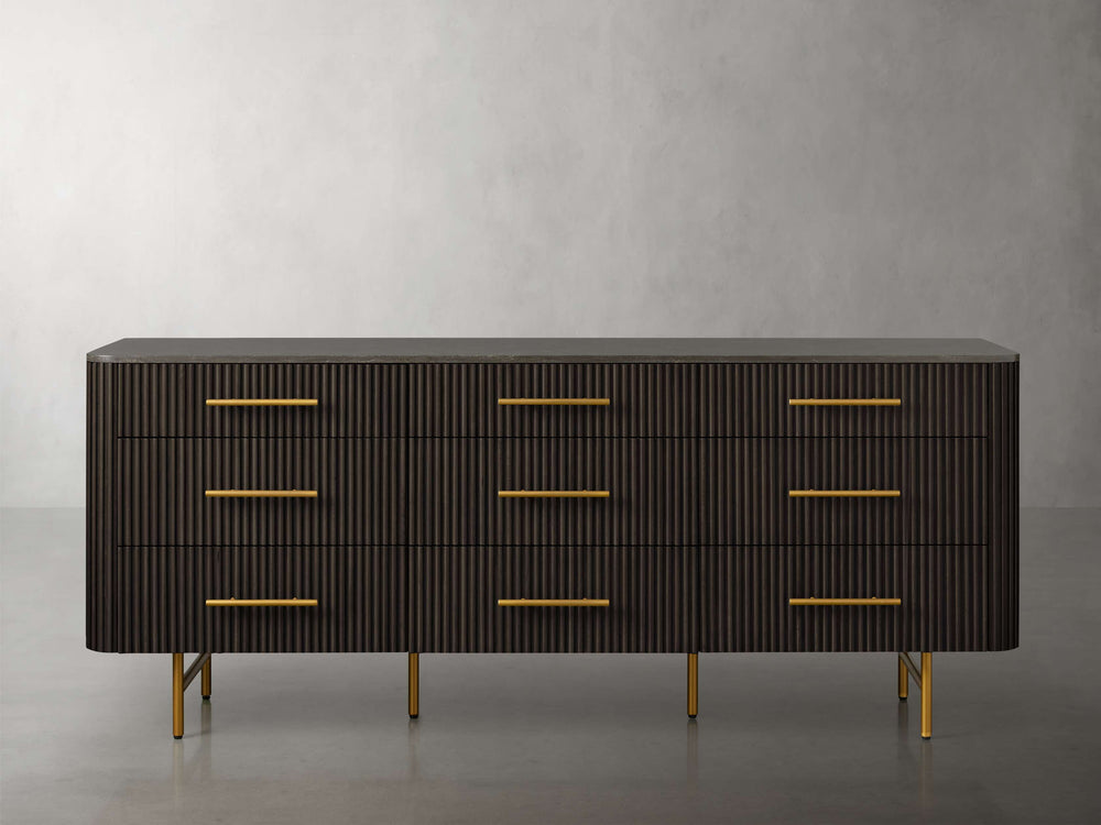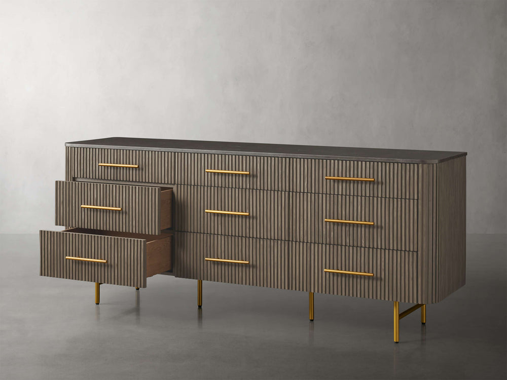Built with reinforced mortise-and-tenon joinery for lasting durability, this dresser offers nine thoughtfully proportioned drawers with smooth under-mounted glides for effortless operation. The brass-finished zinc-alloy hardware adds a refined touch, while adjustable levelers ensure perfect stability on any floor surface.
