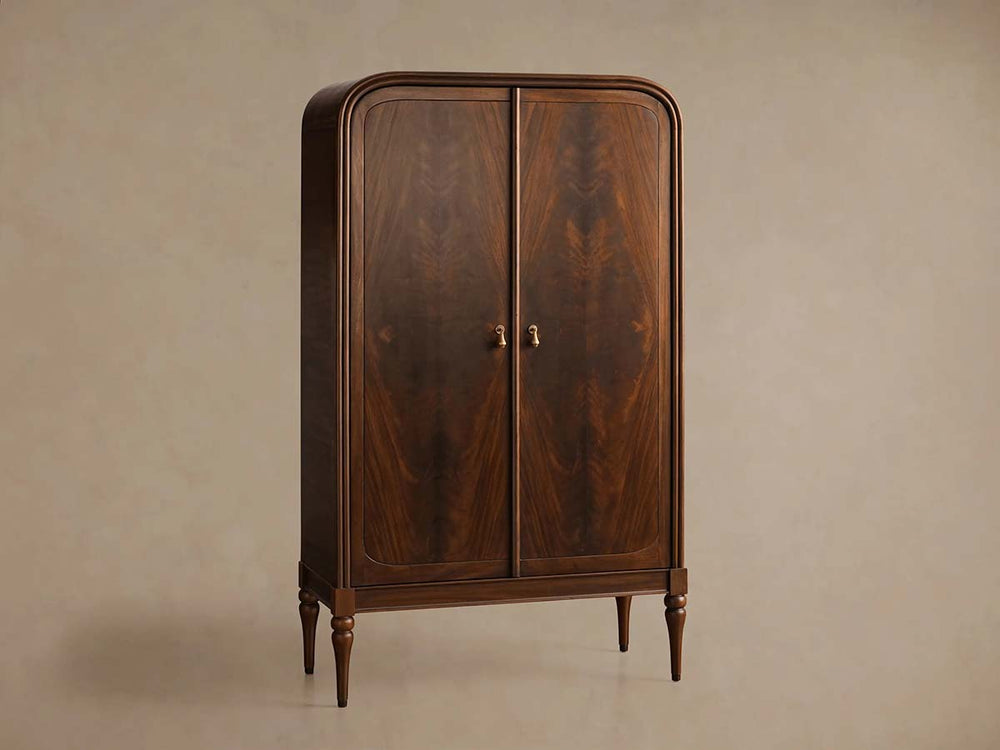 The Frances Cabinet masterfully bridges timeless elegance and modern sensibility through its exquisite craftsmanship. Featuring a distinctive double-frame silhouette and gracefully tapered legs, this piece showcases radiant, mirror-patterned mahogany veneer that highlights the wood's natural flame-like grain—a dramatic feature formed within the tree trunk just before its branches split.