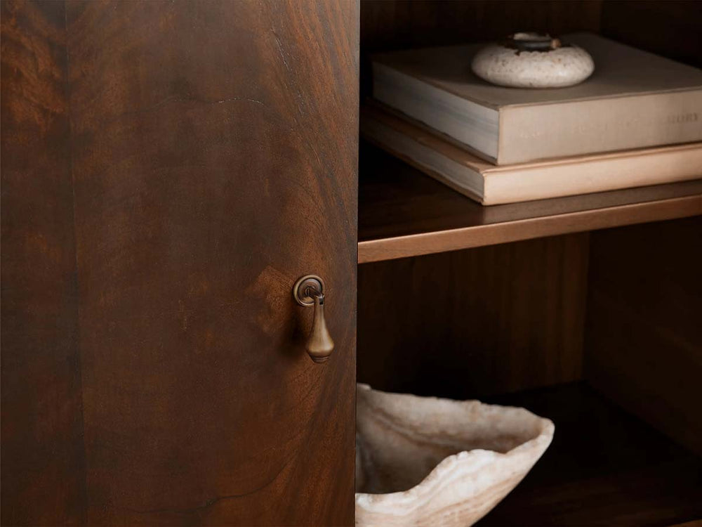Accented with antique brass hardware and finished with book-matched figured mahogany veneer, each cabinet tells a story of natural artistry and refined design. Inside, three adjustable and removable shelves offer versatile storage, while the tailored structure and vintage-inspired details make Frances a standout addition to any room.