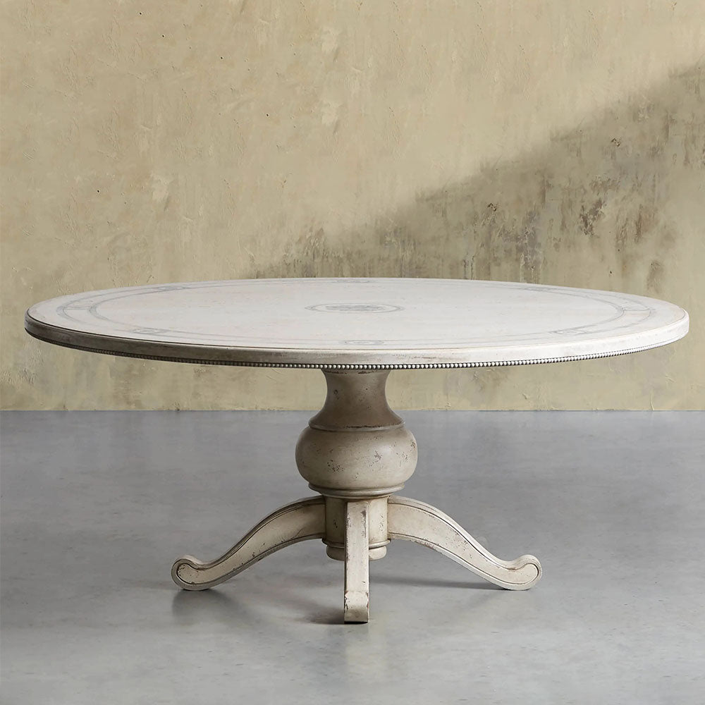 Finished entirely by hand in soft Antique White, the table is encircled by a geometric motif hand-painted in Antique Grey, lending a refined and timeless elegance. Each piece undergoes a meticulous, multi-day process of layering stains, paints, and lacquers—all applied with artisanal brushwork to achieve a gracefully distressed character.