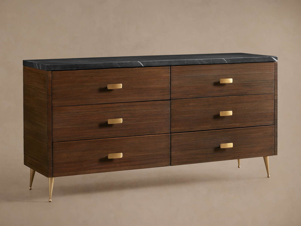 Inspired by heirloom antiques yet designed for modern living, the Giselle Six-Drawer Dresser brings timeless sophistication and curated storage to the bedroom. Meticulously crafted from richly stained mahogany with elegant reeded detailing, this piece features a striking black Marquina veneer top and is accented throughout with lustrous brass hardware. The sculptural silhouette—elevated on slender brass legs—creates a harmonious interplay of texture, tone, and timeless design.