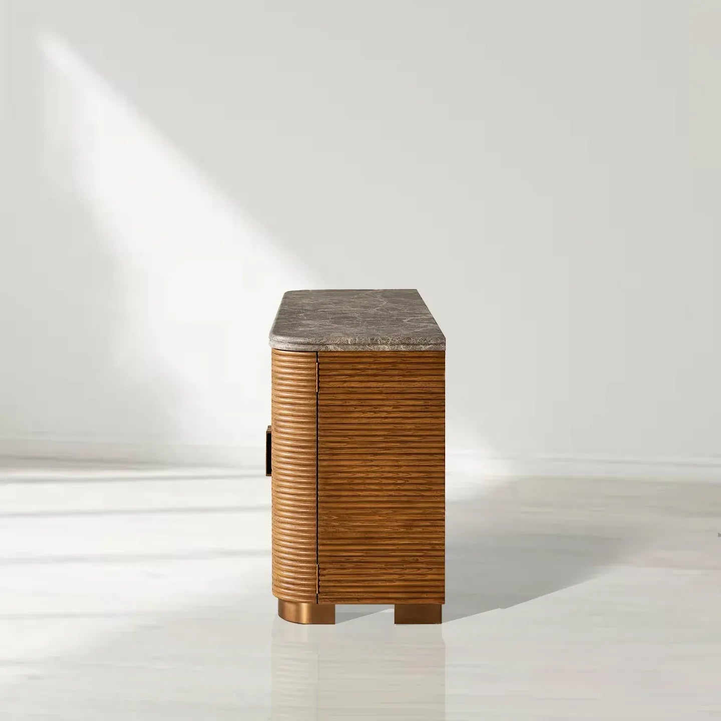 Crowned with honed Grey Emperador marble, the top introduces monolithic sophistication. The muted veining of the marble creates a striking contrast with the intricate wood patterning, balancing natural texture and modern refinement.