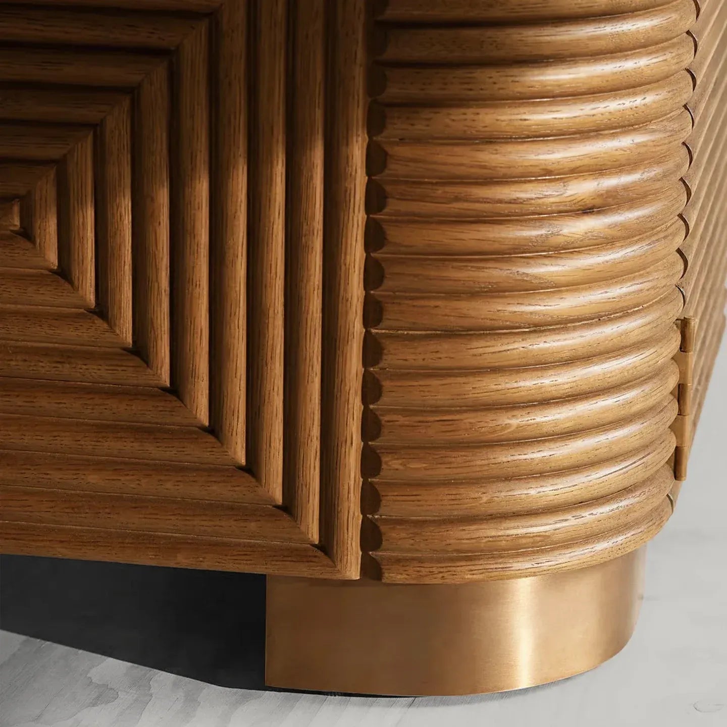 The Kensley Sideboard is a harmonious fusion of organic warmth and bold geometric design. Its rectangular solid oak frame, softened by rounded edges, exudes natural charm and timeless elegance. A hand - engraved diamond motif adorns the front, serving as a tactile tribute to the iconic bar at Nashville House and adding a unique, story - driven detail.