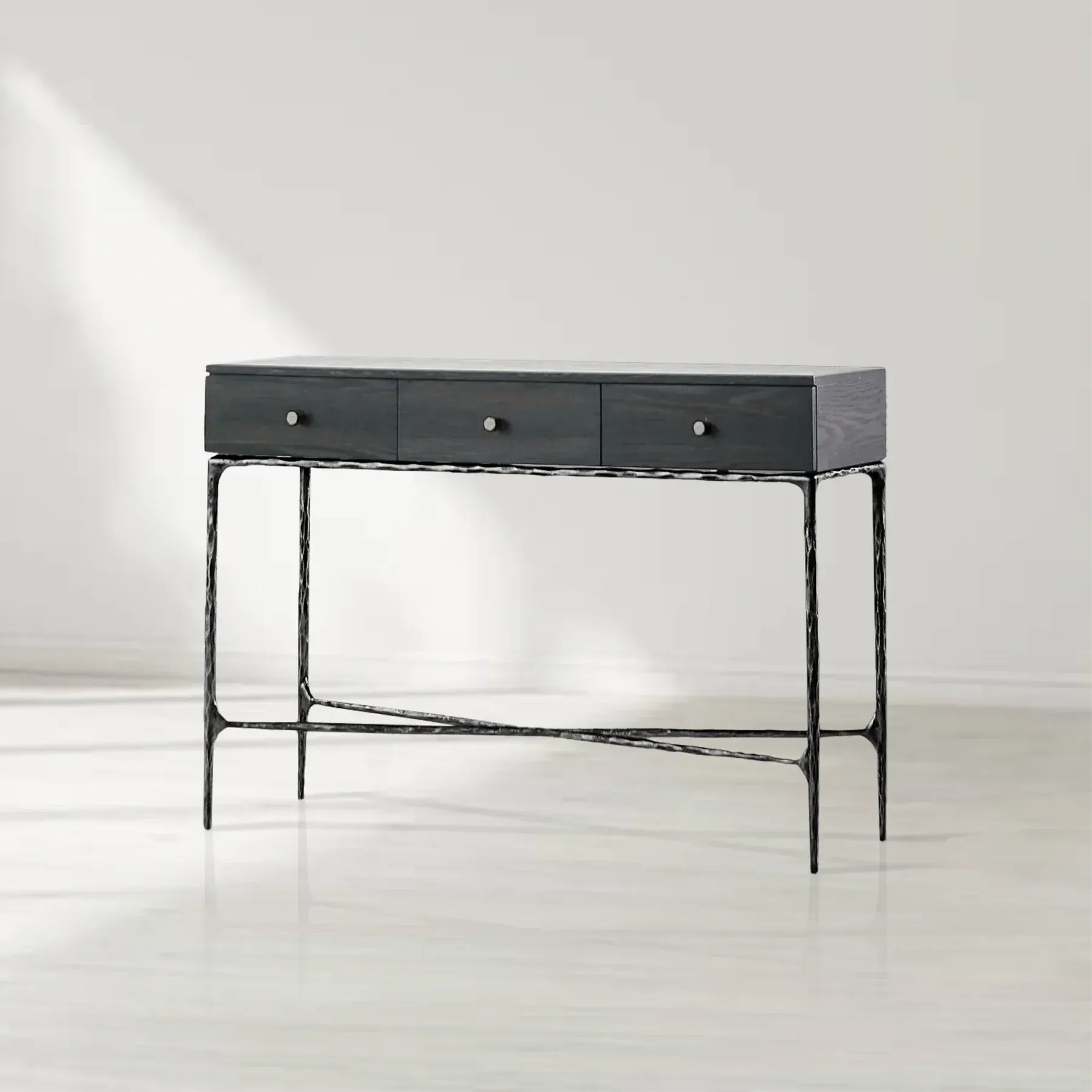 Crafted for both style and function, the desk includes three generously sized drawers, providing practical storage while maintaining a clean, uncluttered aesthetic. The oak top boasts a hard, fine-grained finish with a naturally aged tone, developed to withstand daily use while retaining its sophisticated character.