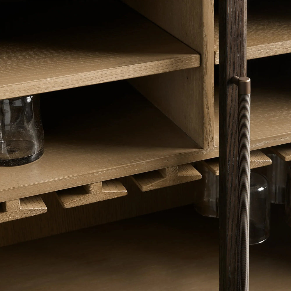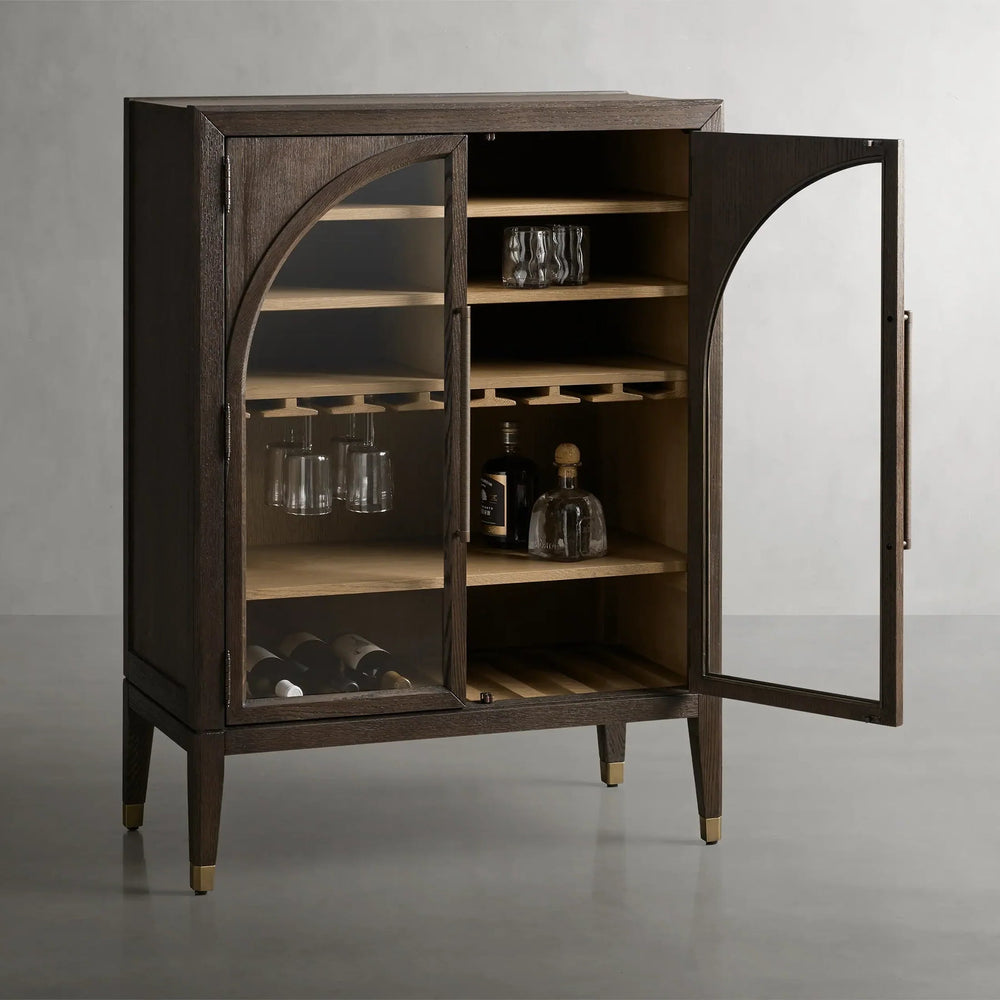 The Hattie Low Bar Cabinet brings timeless architectural elegance into your home, inspired by the graceful arches of 16th-century design. Meticulously handcrafted from solid oak, it masterfully blends soft, curvilinear forms with the natural warmth of wood grain. Designed for both display and utility, it offers elegant storage for your barware collection, complete with thoughtful details like shiplap paneling, antiqued hardware, and a sturdy base with brass-capped feet.