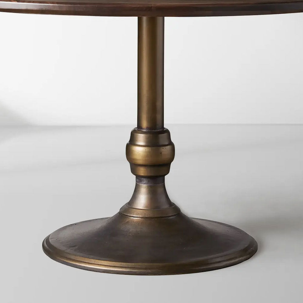 The table is supported by a robust Wade Base made from solid cast iron, featuring a refined brass finish that elegantly complements the warm, natural tones of the woodtop.