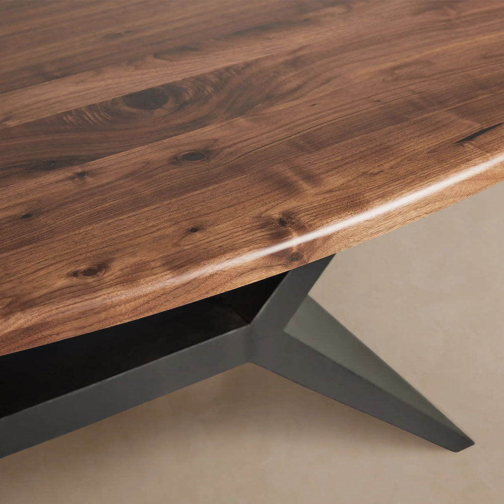 The table is elegantly supported by a solid iron Vertex Base, finished in a understated flat black that perfectly complements the warm wood tones above.