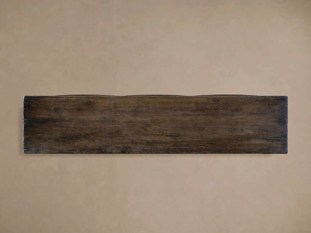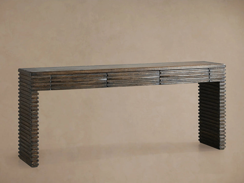 Embrace the warmth of reclaimed history with the Kai Console Table, an antique-inspired piece that celebrates authentic craftsmanship and sustainable design. Handcrafted by skilled Chinese artisans from solid reclaimed pine, this textural console showcases a distinctive slatted design that creates captivating light and shadow play. The rich Dhurrie Brown finish is meticulously hand-stained and distressed to highlight the wood's natural character, with each piece revealing unique variations in grain, texture, and the beautiful markings of its previous life.
