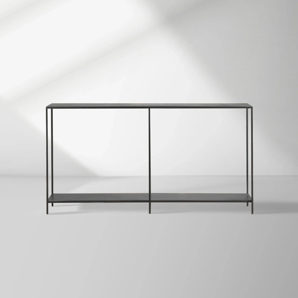 Artisan-crafted from solid metal, the Kavali Console Table combines a slim, contemporary silhouette with richly textured surfaces for a look that is both modern and timeless. Each piece is meticulously hand-finished, featuring cast aluminum adorned with a hand-rubbed, antiqued patina that adds depth and subtle contrast to any interior.