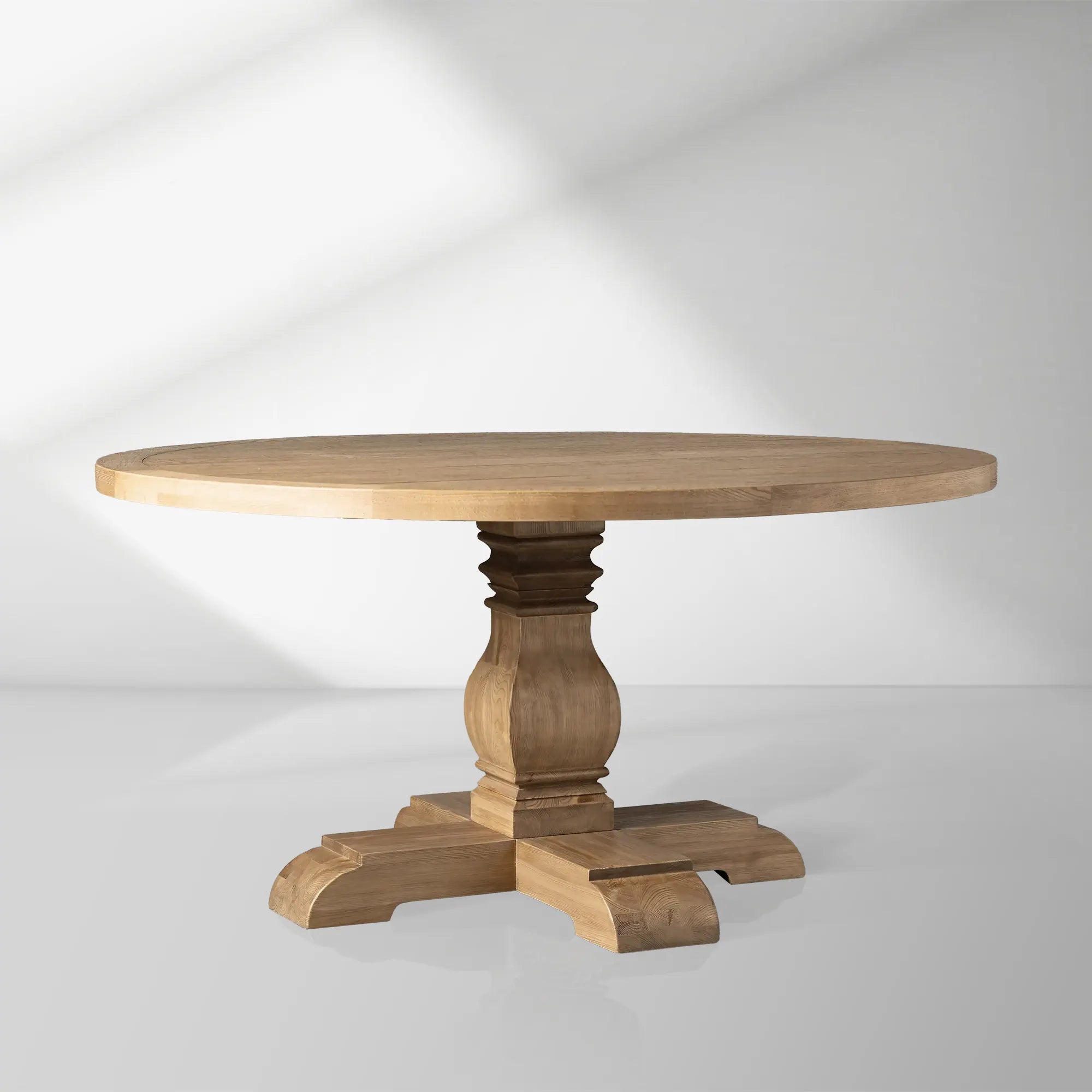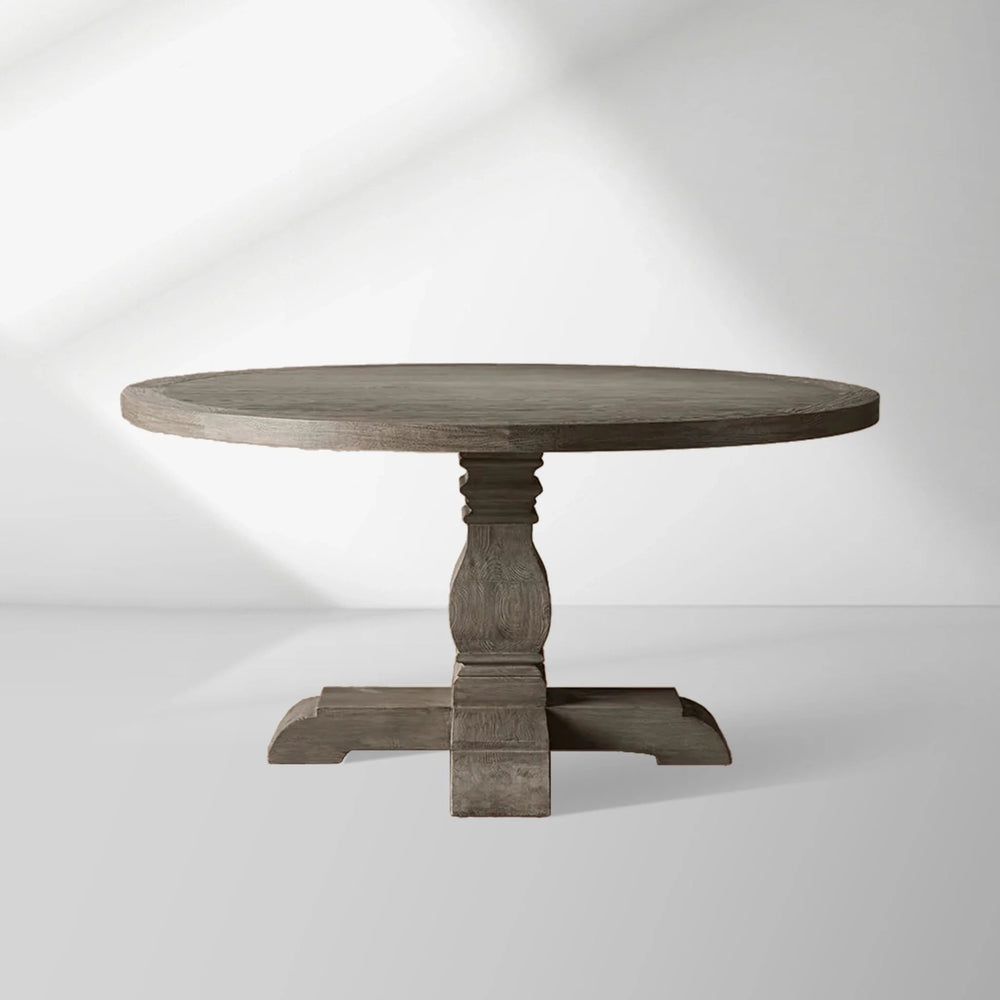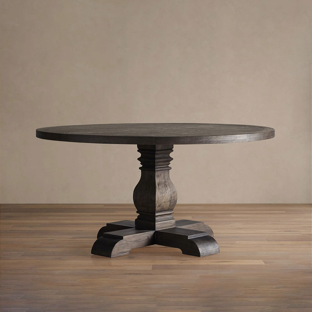 Crafted with reverence for tradition and nature, the Kensington Round Dining Table tells a story through every grain and hand-applied finish. Artisans skillfully build this piece using sustainably sourced solid Finnish pine for the base and a solid oak with oak veneer top, uniting durability with timeless design.