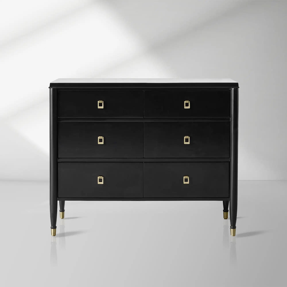 Inspired by the elegant restraint and refined proportions of 1940s French furnishings, the Lavenir 6-Drawer Chest masterfully blends romantic classicism with modern minimalism. Expertly crafted with a smooth, semi-gloss lacquer finish over a solid wood frame wrapped in warm anigre veneer, this piece features antiqued solid brass square drop pulls and softly tapered legs with brass-capped feet. Each dovetailed drawer is finished inside with a warm honey stain, combining timeless elegance with everyday function.